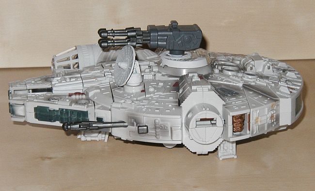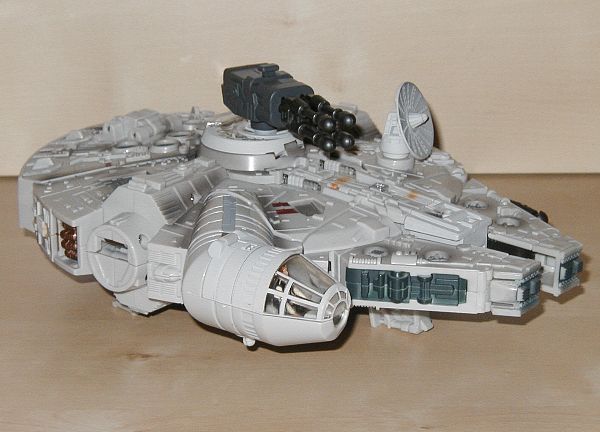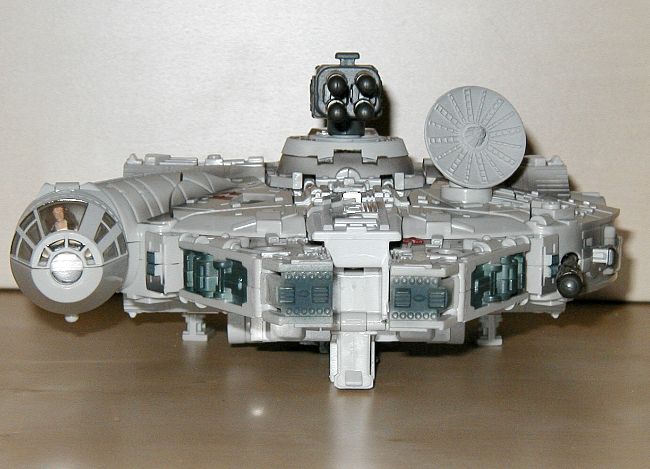 Fahrzeug Modus: Han und Chewie verbinden sich zum Millennium Falken. Chewie wird zum hinteren Teil des Diskus und bringt das Cockpit mit, Han wird zum vorderen Teil. Die Quad-Laser Kanone kommt oben rauf, Chewies Armbrust klappt zusammen und kommt unten ran. Die kleinen Figuren sitzen beide im Cockpit. Der Falke ist gut detailliert und bietet ein paar nette Features wie z.B. ein Landegestell. Eine gute Abbildung des Raumschiffs aus dem Film und kein Grund zur Klage.
