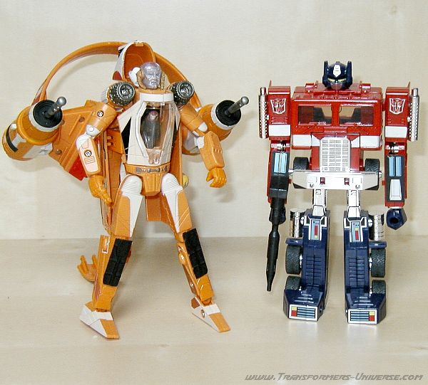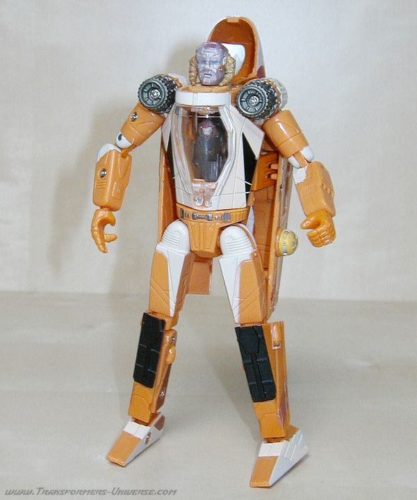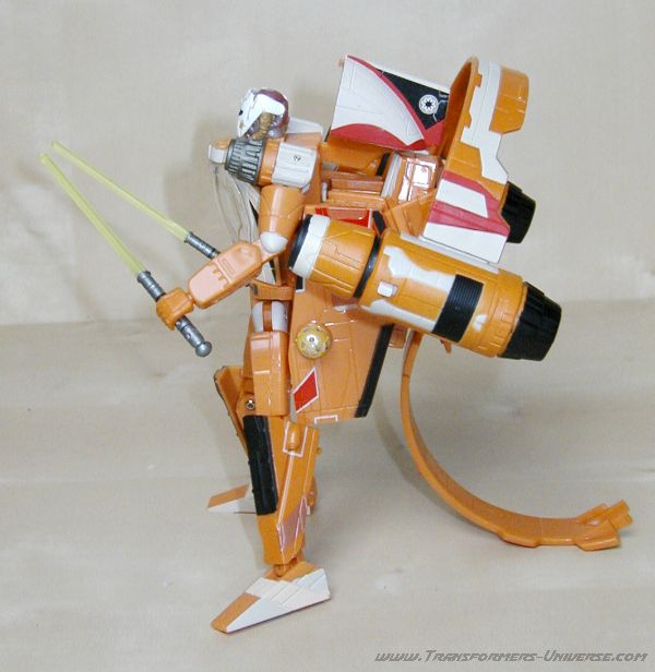 Der Robotermodus kann durch den Hyperraum Beschleunigerring aus dem Jetmodus verstärkt werden. Er fungiert als Rucksack für Tiin und gibt ihm Flugkraft und mehr Feuerkraft, wie man's halt sehen will. Man kann den Ring lassen wie er ist, oder die eine Hälfte abmachen und als zusätzliches Standbein hinten anbringen. Letzteres macht Sinn, da Tiin durch den Rucksack dazu neigt, nach hinten umzukippen. Seine beiden Lichtschwerter kann er als Raketen aus den Triebwerken des Rings abfeuern. Alles in allem gefällt mir Tiin ohne den Rucksack besser, aber es ist trotzdem ein gutes Extra. In Summe also ein toller Robotermodus (solange man den Helm zulässt).