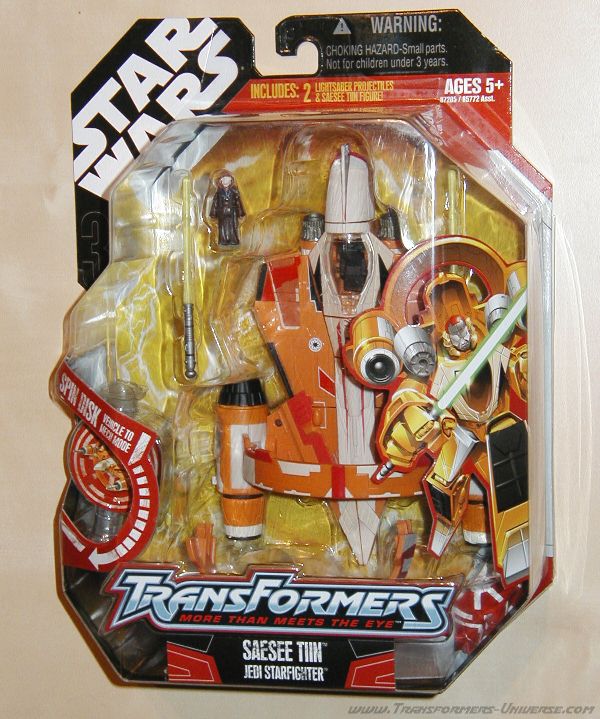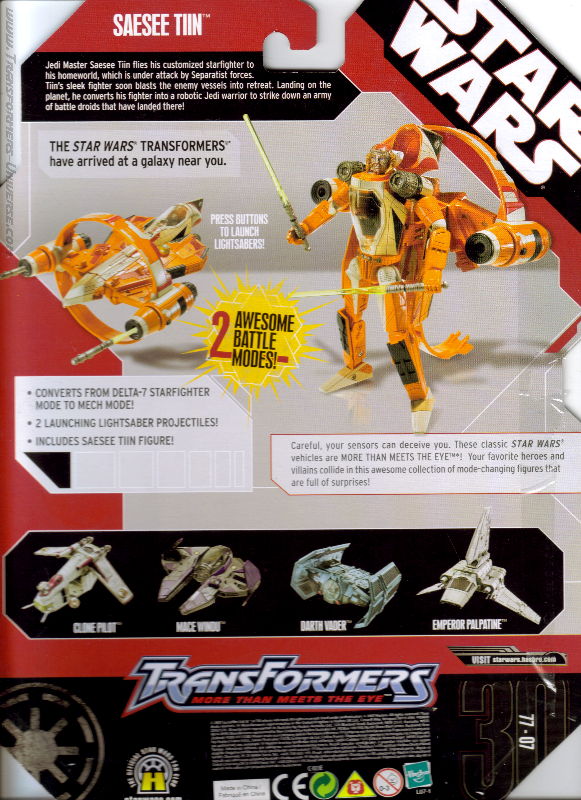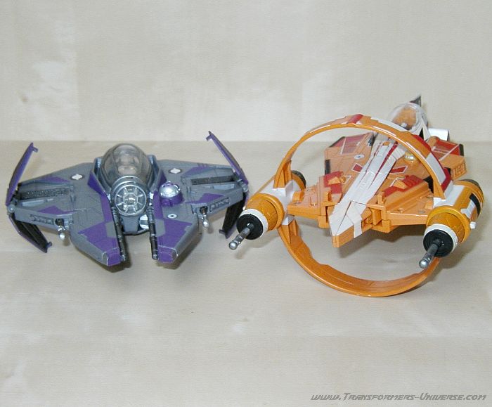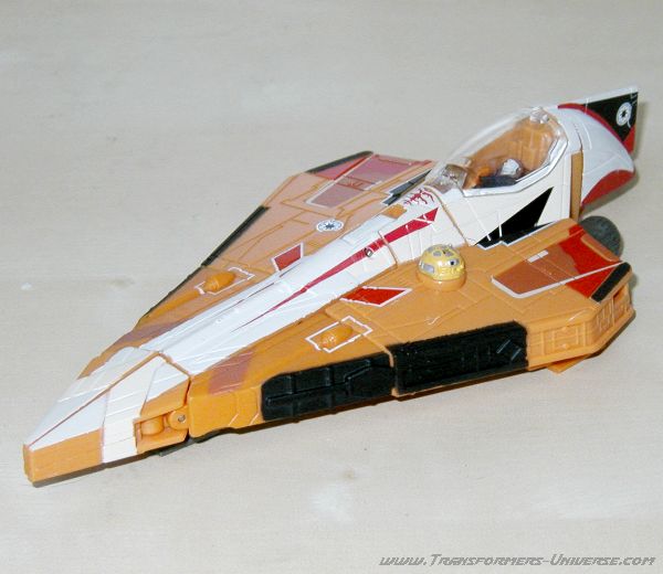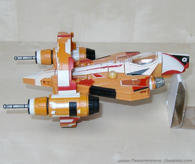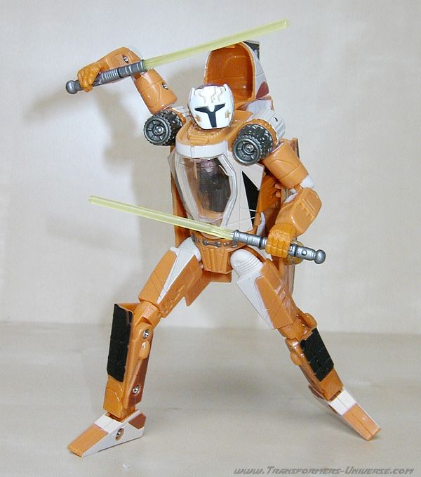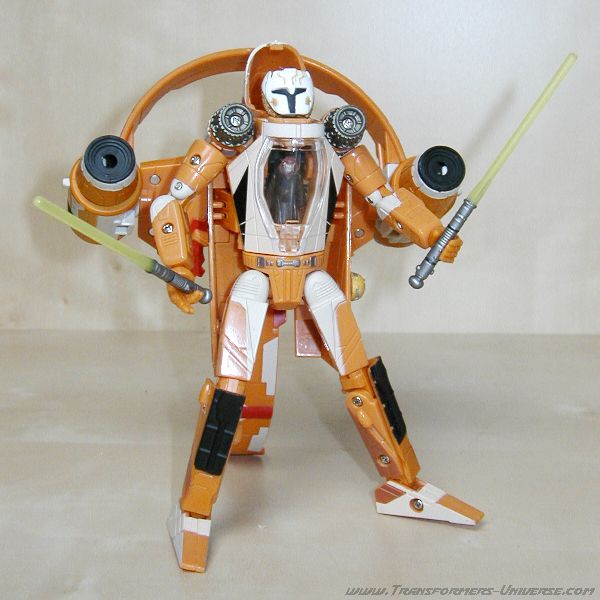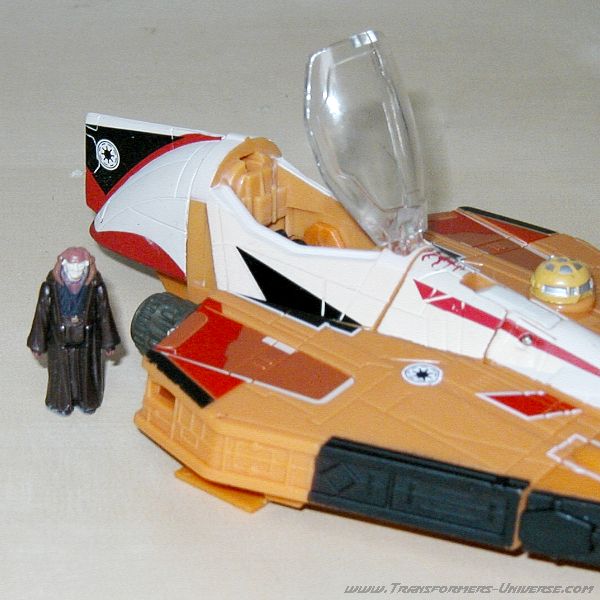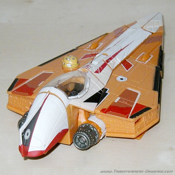 Alternativmodus: Saesee Tiin verwandelt sich in den Jedi Raumjäger, den Obi-Wan Kenobi in Episode II geflogen hat. Ein deltaförmiger Jäger, dem Aussehen nach mehr für Tempo denn Kampf gebaut. Die Detaillierung auf dem Raumjäger sieht ziemlich gut aus und er hat ein toll gemachtes Fahrgestell. Das Cockpit bietet Platz für die kleine Tiin Figur, die dort ohne Probleme platz nehmen kann.