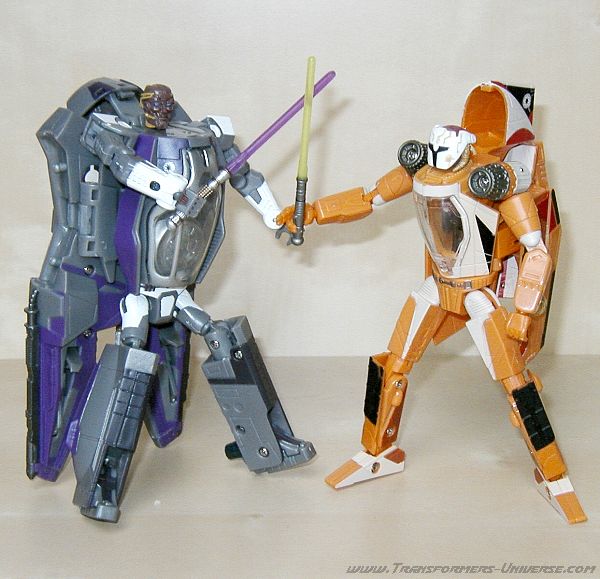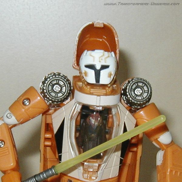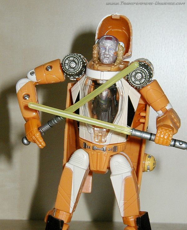 Robotermodus: Am Anfang gefiel mir der Robotermodus überhaupt nicht. Der Kopf sieht aus wie der eines alten Mannes (eines sehr häßlichen alten Mannes), während der Körper eher einem Teenager zu gehören scheint. Aber dann klappte ich den Helm runter und dann sieht er verdammt cool aus, speziell wenn man ihm beide Lichtschwerter in die Hand drückt. Tiin wirkt wie ein tödlicher Ninja, schlank und gefährlich. Seine Beweglichkeit ist exzellent, wenn man sich auch erst ein wenig daran gewöhnen muss, wie die Schultergelenke funktionieren. Hat man den Dreh aber raus, dann kann man ihn in alle möglichen coolen Posen werfen. Auf mich wirkt er wie eine Kombination aus dem Nazi Attentäter aus Hellboy und Prowl aus der Animated Serie. Sehr cool.