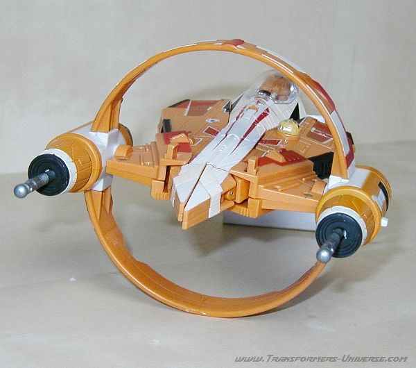 Um interplanetare Distanzen zurückzulegen braucht der Jäger einen Hyperraum Beschleunigerring, der auf der Nase des Jägers aufsitzt. Mit dem Ring drauf sieht der Jäger zwar cool aus, aber man kann ihn nicht mehr hinstellen, ohne dass er zur Seite rollt. In den Filmen blieb der Ring im Weltraum zurück, während der Jäger auf dem entsprechenden Planeten landete, insofern macht das ganze auch Sinn. Trotzdem war es für die Fotos nicht gerade eine einfache Aufgabe. Trotzdem, der Ring sieht auf dem Jäger cool aus (besser als auf dem Roboter) und gibt dem Fahrzeug außerdem zusätzliche Feuerkraft, den die Lichtschwerter kann man natürlich auch in diesem Modus als Raketen abfeuern. Alles in allem also ein guter Fahrzeugmodus.