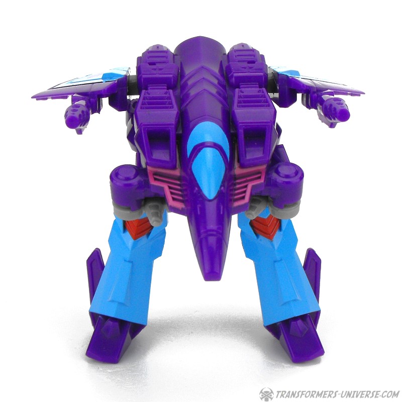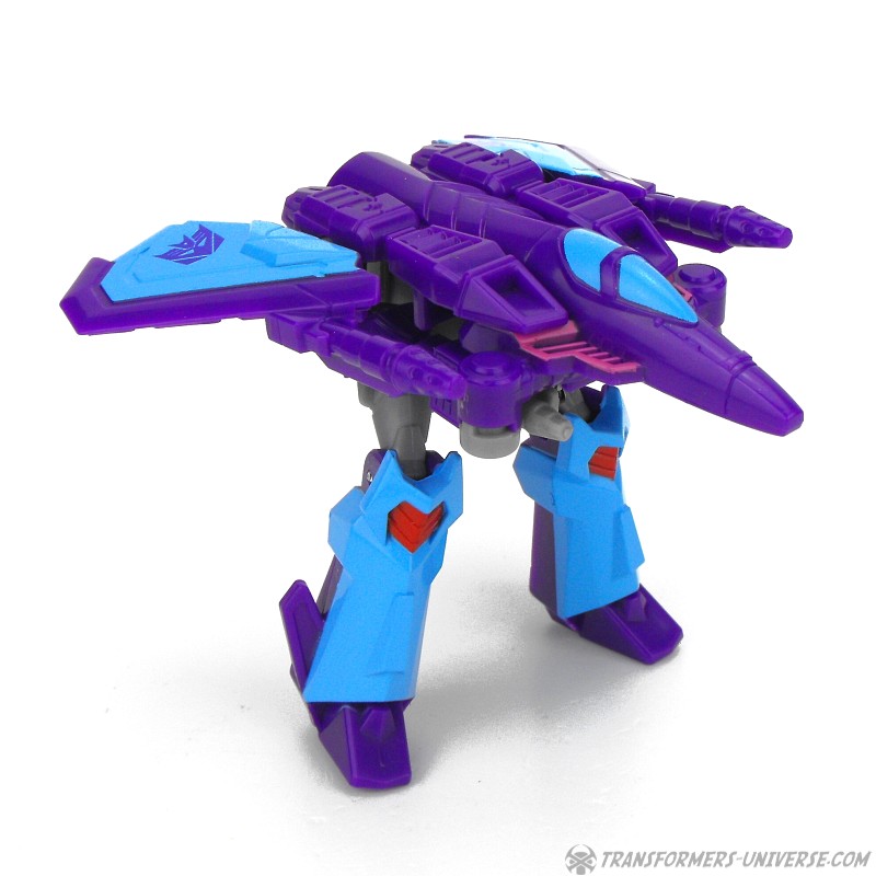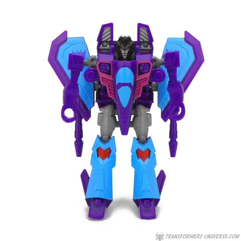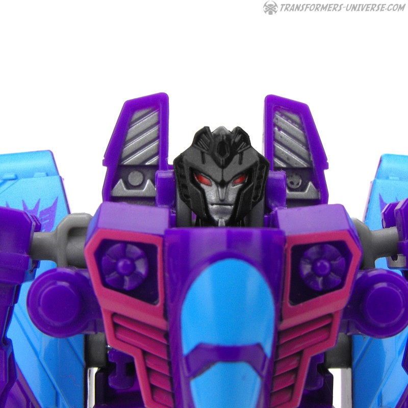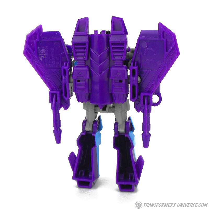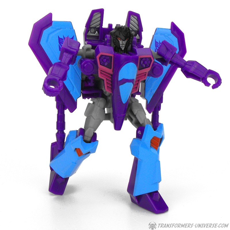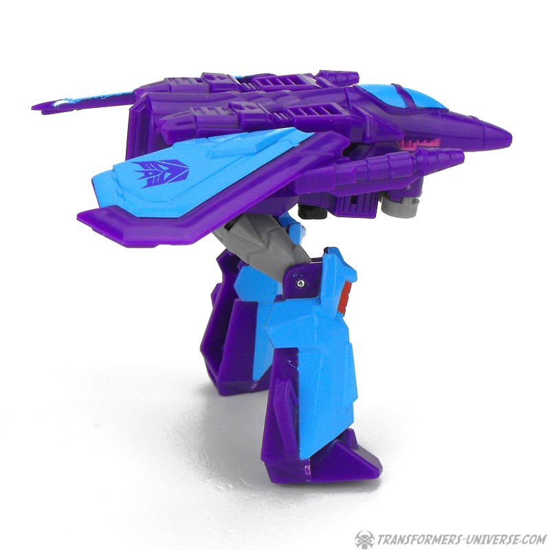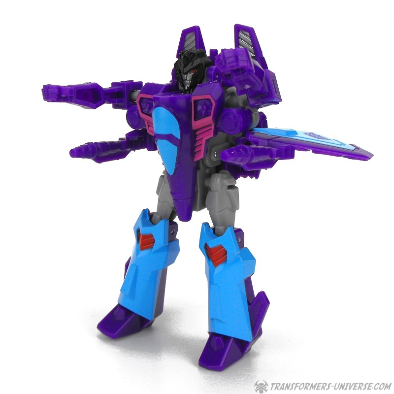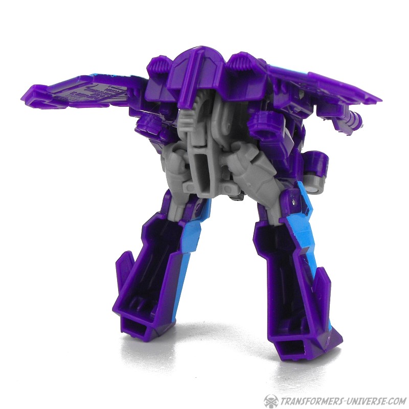 Die Farben, Lila und Türkis, stehen Slipstream sehr gut und auch wenn nichts an der Figur, die ursprünglich ein Starscream war, verändert wurde um sie femininer zu machen, funktioniert sie trotzdem sehr gut für den Charakter, wie ich finde. Die Arme sind ein wenig kurz und dürr, aber ansonsten kann man an der Figur vom Look her wenig aussetzen.