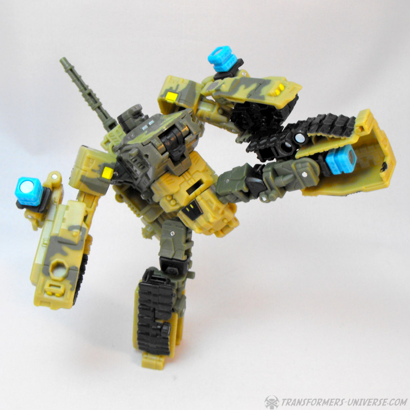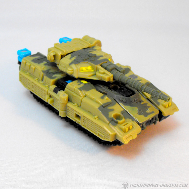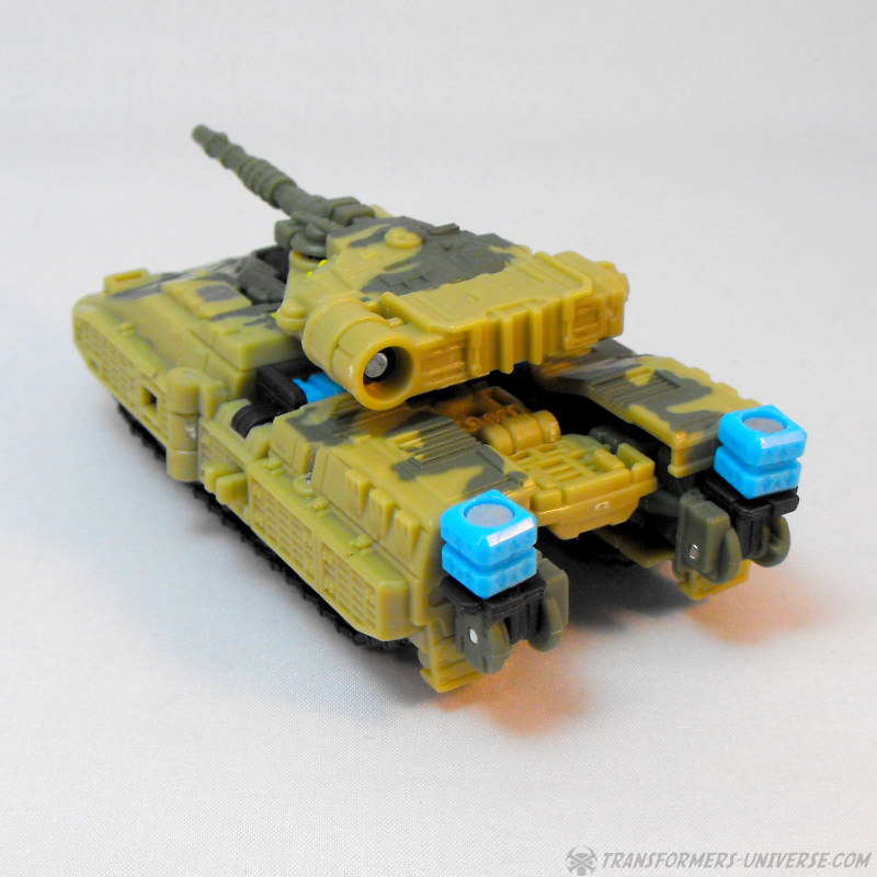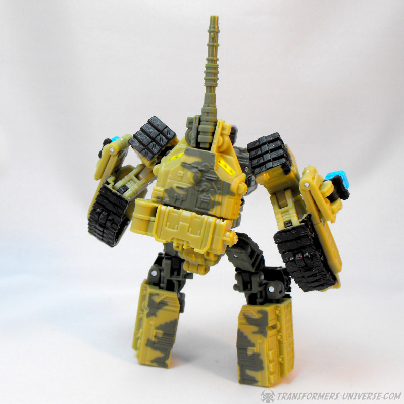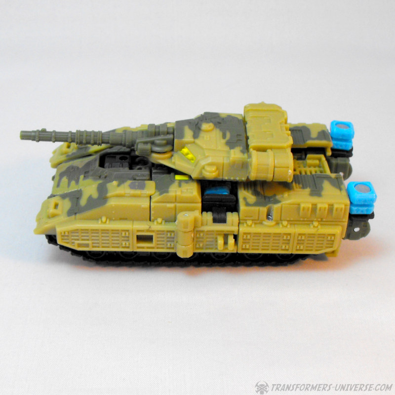 Robotermodus: Heavytread ist ein gedrungener kleiner Kerl und kann nicht wirklich verbergen, in was er sich da verwandelt. Er hat Panzerketten an Armen und Beinen, sowie einen großen Geschützturm als Rucksack. An dieser Stelle gleich mal was sehr positives: anders als viele andere Panzer-Transformer, die den Geschützturm auf dem Rücken haben, kann Heavytread das Geschütz trotzdem noch im Robotermodus einsetzen. Der ganze Turm kann hoch/vor auf seine Schultern hinter dem Kopf gleiten und er muss sich nur ein klein wenig vorbeugen, dann kann er feuern. Schön gemacht.