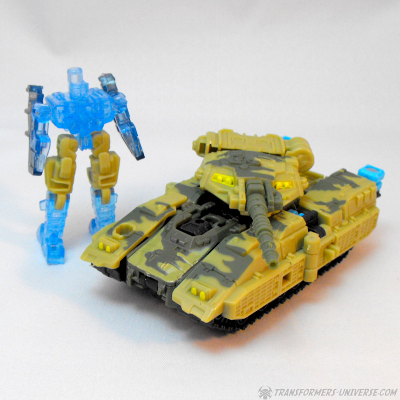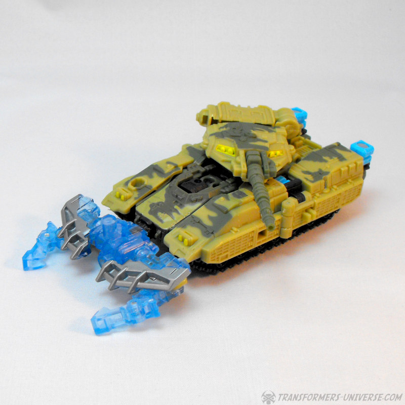 Partner / Zubehör: Heavytreads Minicon Partner ist Groundspike. Sein Robotermodus sieht gut aus, auch wenn es die transparent-blauen Teile etwas schwer machen, seine Details zu erkennen. Wie alle PCC Minicons hat er drei Alternativmodi und anders als bei den meisten PCC Minicons unterscheiden sich die drei Modi sogar optisch. Er kann zu einer Brustplatte für Heavytread (Roboter oder Combiner) werden, eine Art Mienenräumer der vorne an den Panzer andockt, sowie eine Fleischerhaken-artige Waffe, die Heavytread in der Hand halten kann. Unterm Strich also einer der besseren PCC Minicons.