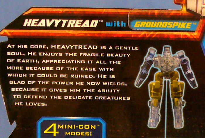 In seinem Inneren ist Heavytread ein sanfter Typ. Er bewundert die zerbrechliche Schönheit der Erde, besonders weil es so leicht wäre, sie zu zerstören. Er ist froh um die Kraft, die er nun hat, denn sie gibt ihm die Fähigkeit die verwundbaren Kreaturen zu beschützen, die er liebt.