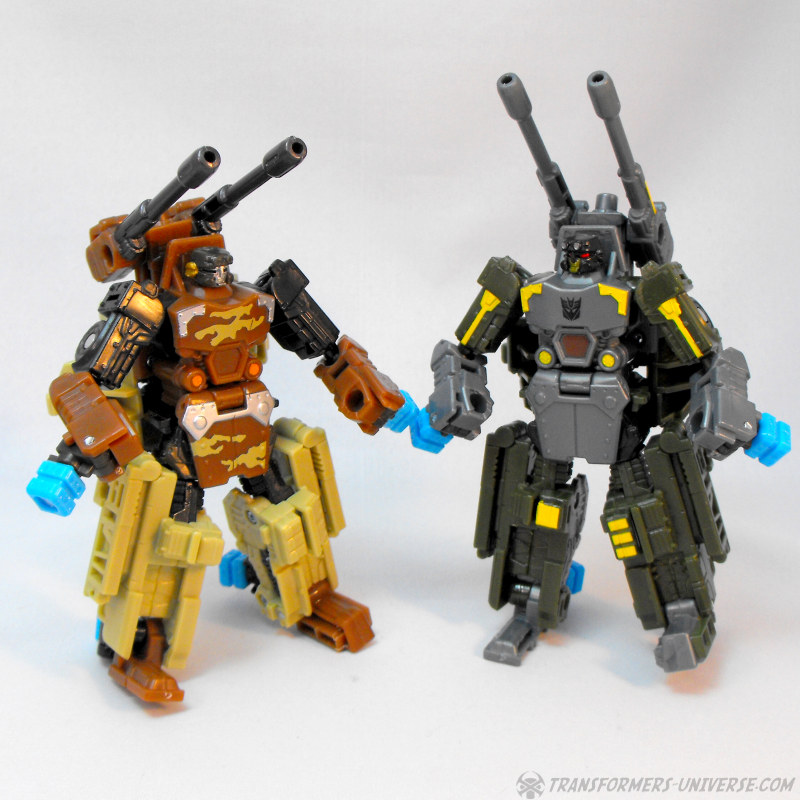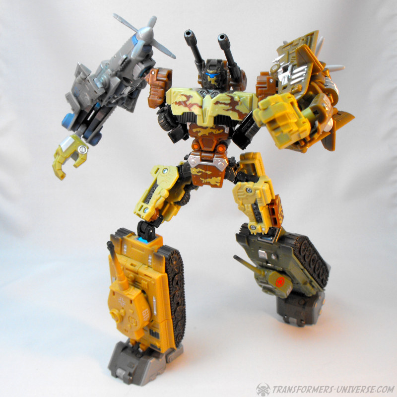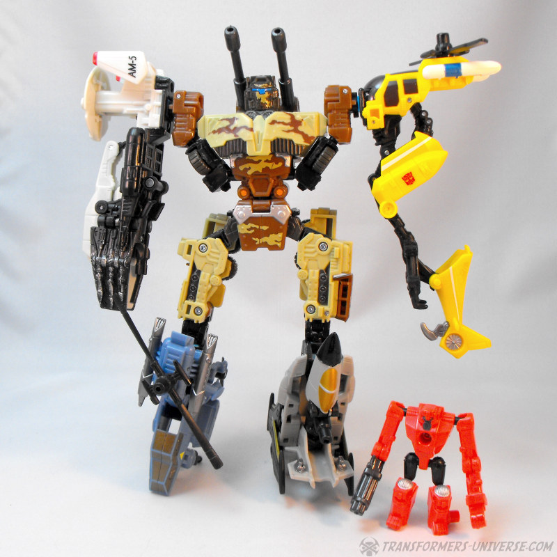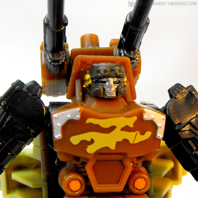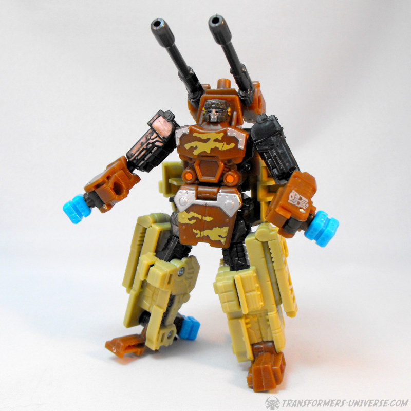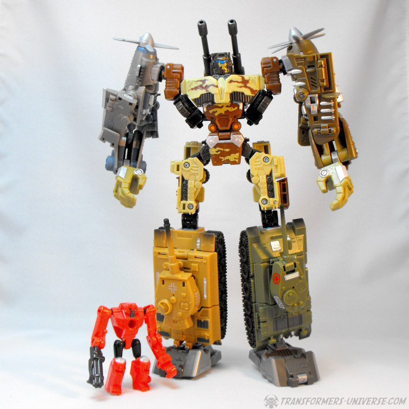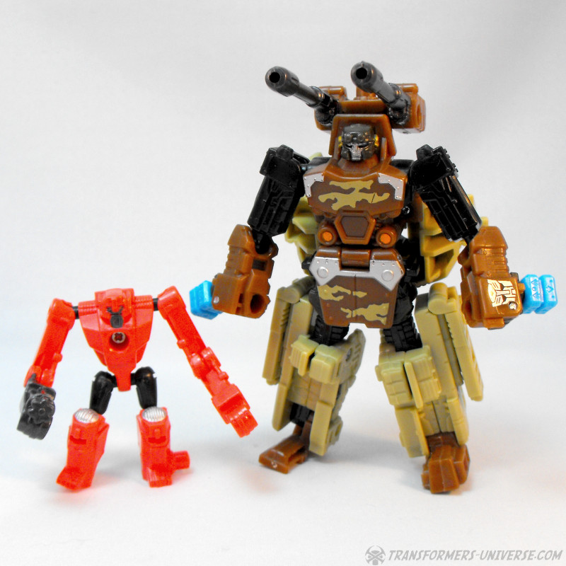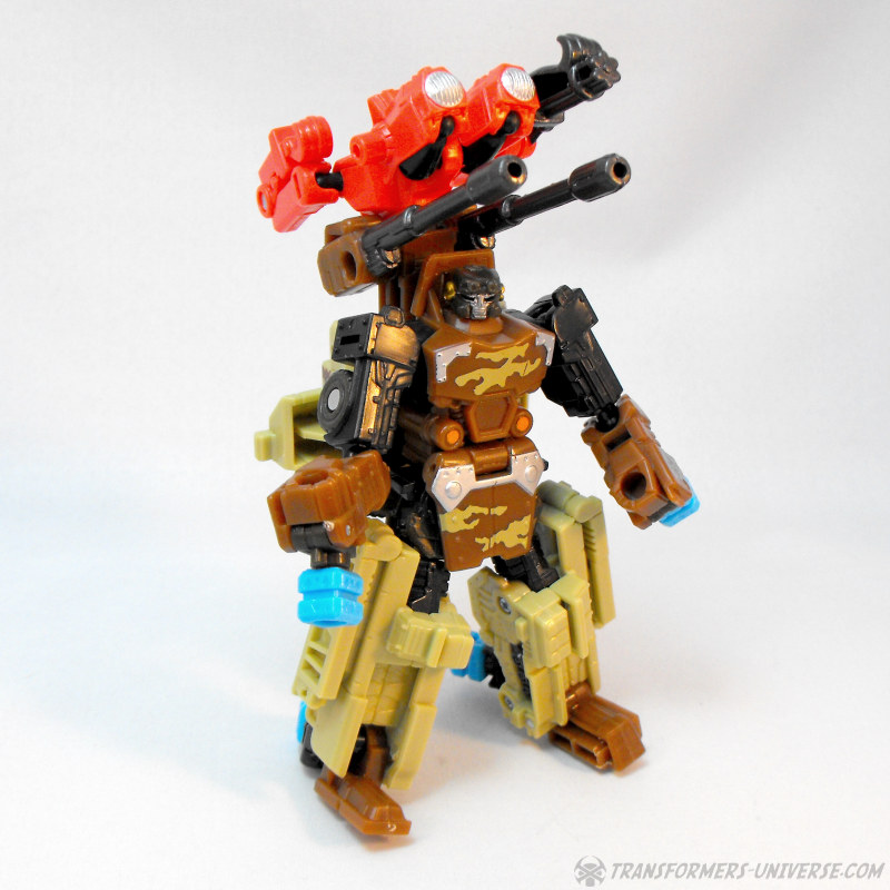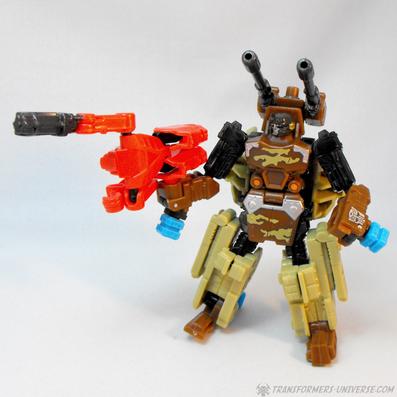Kombinationsmodus: Wie alle nicht-Minicons der Power Core Reihe kann auch Steelshot zum Torso eines Power Core Combiners werden. Und da Steelshot natürlich Onslaught nachempfunden ist, dürfte es nicht überraschen dass der Combiner Modus an Bruticus erinnert, oder besser gesagt an die Wüstentarnmuster-Version von RID Bruticus. Steelshot kann beliebige PCC Drohnen als Gliedmassen nutzen, am besten sieht er aber mit der TFC Iron Army aus. Insgesamt ist Steelshot definitiv einer der besseren Combiner Torsos aus der PCC Reihe, er sieht sowohl gut aus und ist gut proportioniert. Somit hier einen dicken Daumen hoch.