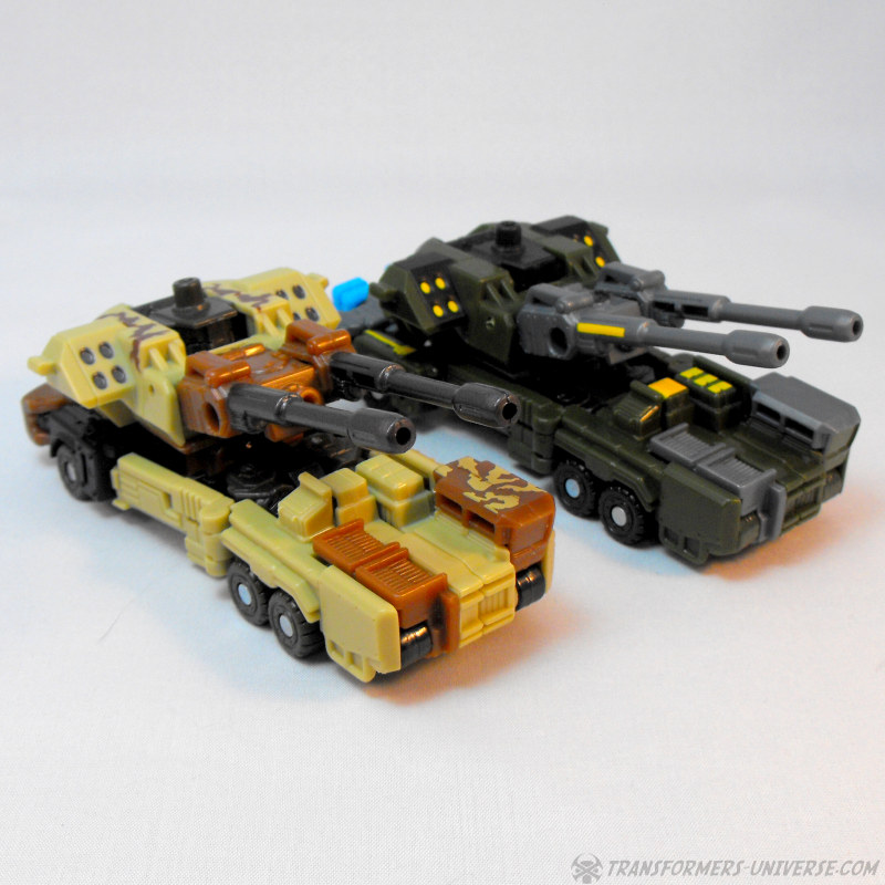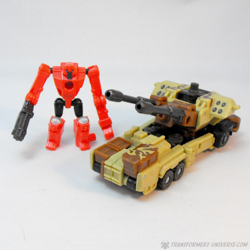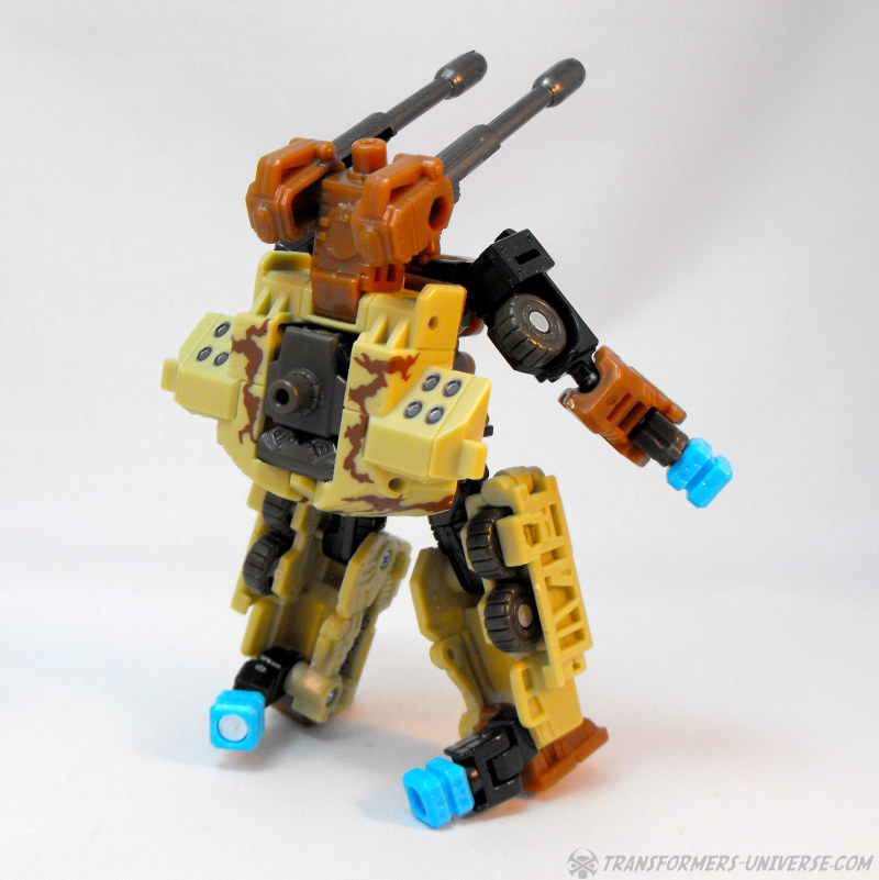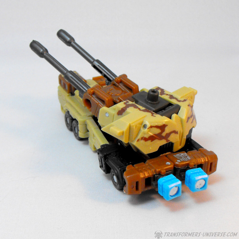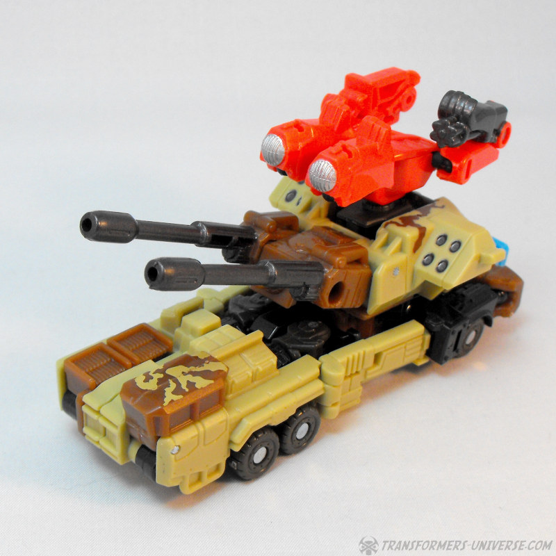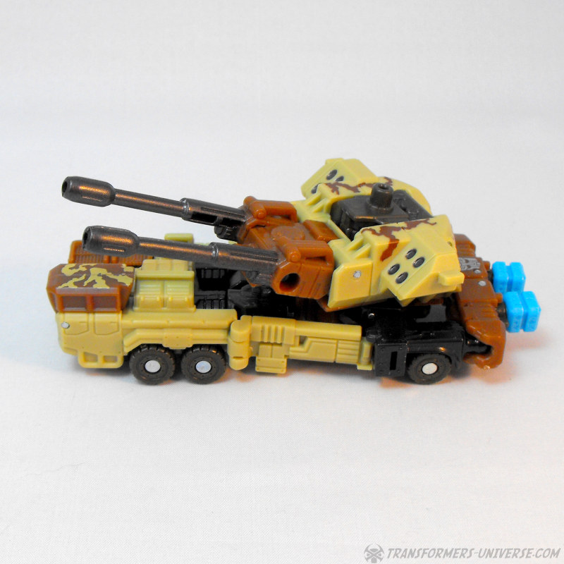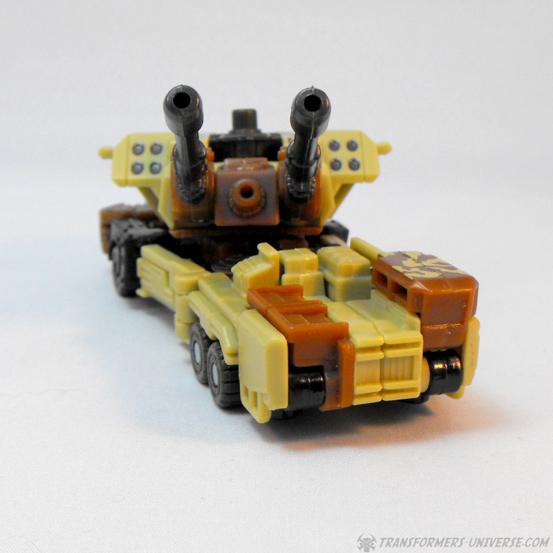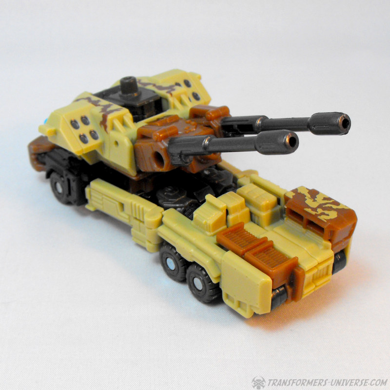 Alternativmodus: Wenig überraschend wird Steelshot zu einem militärischen Artilleriefahrzeug, dominiert von den beiden Kanonen oben drauf. Das Wüstentarnschema ist natürlich auch hier präsent und das Fahrzeug sieht für mein Laienauge so realistisch aus, wie es in diesem Maßstab wohl machbar ist. Der Geschützturm mit den beiden Kanonen und den skulptierten Raketenwerfern ist voll drehbar und die Kanonen können angehoben werden, somit sehr breites Schussfeld. Insgesamt ein solider, wenn auch eher unspektakulärer Fahrzeugmodus.