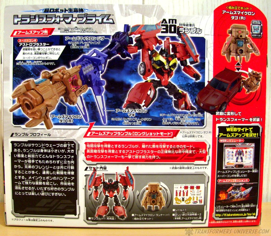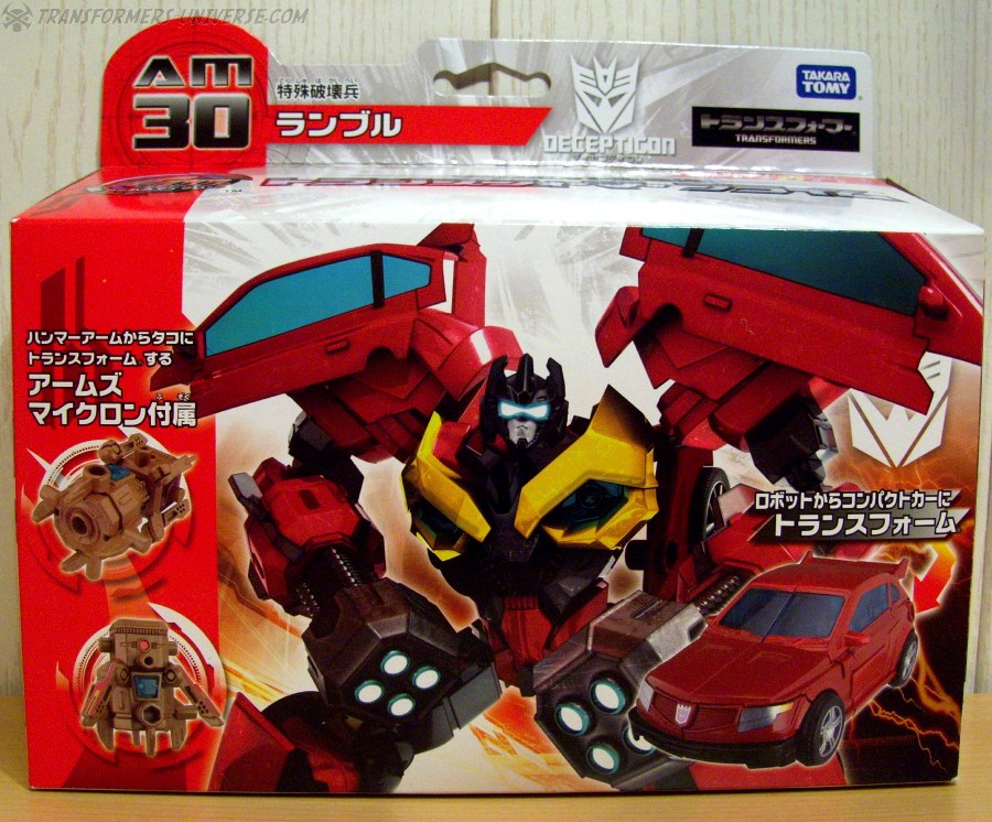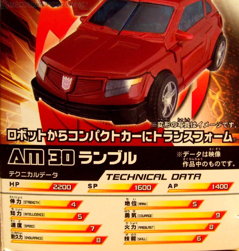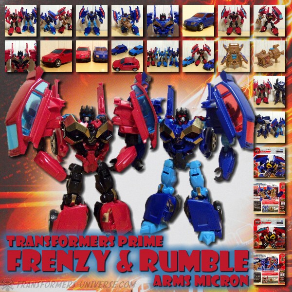 Rumble ist Soundwaves Untergebener. Obwohl sein Körper klein ist, nimmt er es mit seiner Einstellung und Kampfstärke mit jedem Transformer auf. Er und sein Bruder Frenzy arbeiten oft zusammen und sind auf koordinierten Kampf spezialisiert. Seine Hauptwaffe, seine Hammerarme, verursachen schwere Erdstöße und zerstören urbane Gegenden. Frenzy liebt es Streiche zu spielen, für ihn ist das alles nur ein Spiel.
