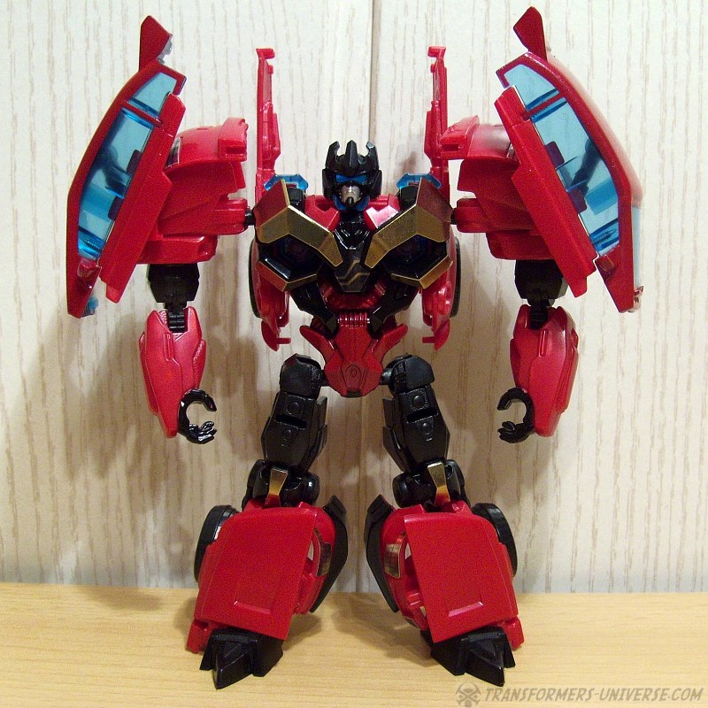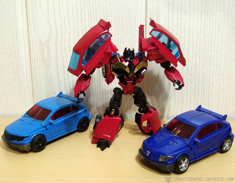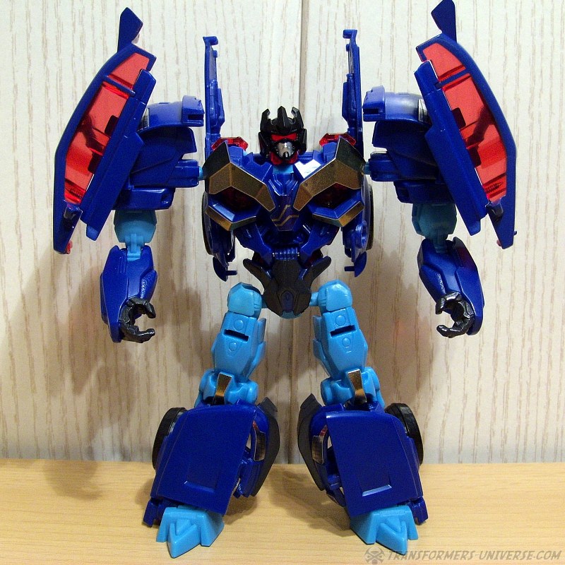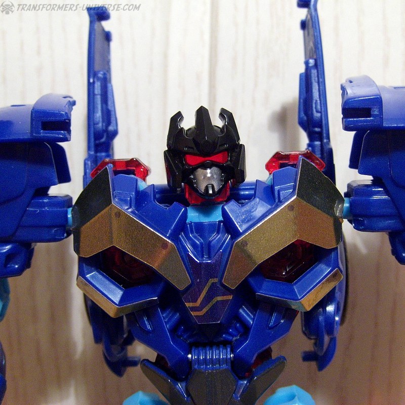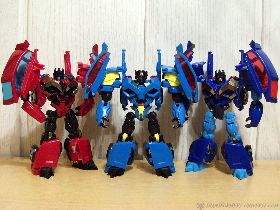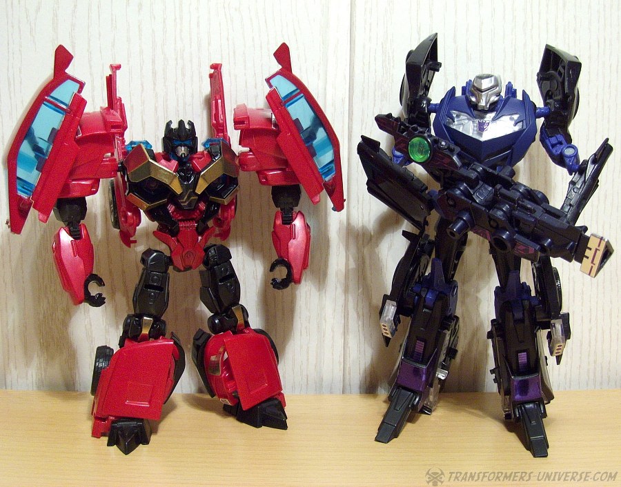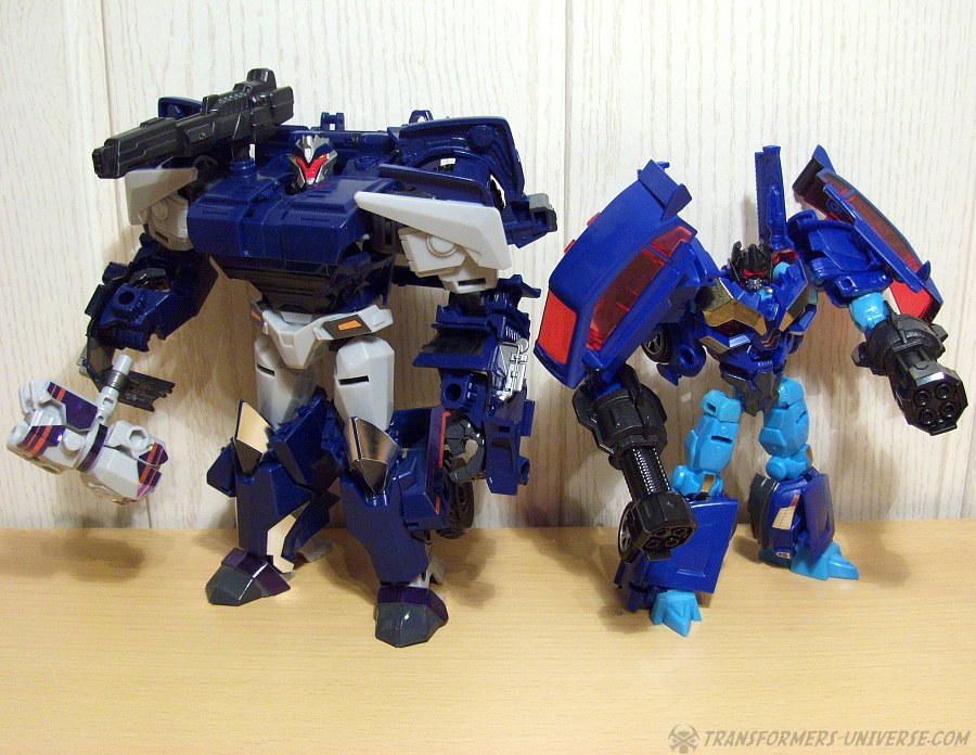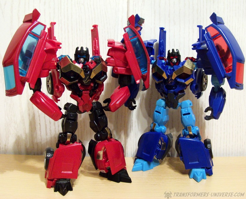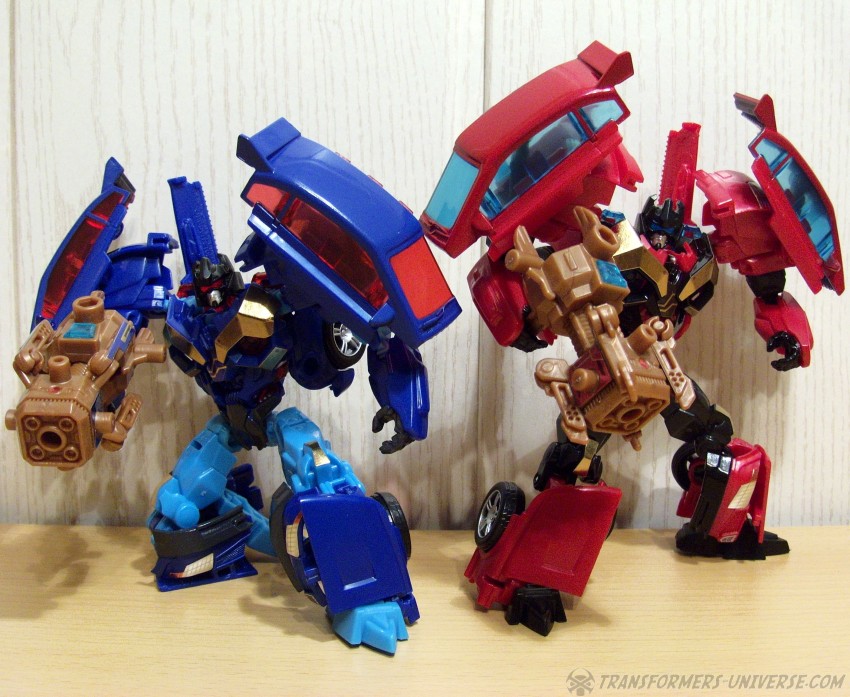 Roboter Modus: Wie auch im Fahrzeugmodus gibt es hier technisch keine Änderungen. Doch das Bild, welches sich zeigt, ist völlig anders. Zusammen mit den Stickern erscheinen beide deutlich farbenprächtiger als die Hasbro Version. Etwas seltsam ist, dass beide den neuen Kopf nutzen anstelle nur einer von ihnen, allerdings gefällt mir der neue wesentlich besser. Und auch hier genial, Blau mit roten Augen, Rot mit blauen Augen. Schön, wenn an solche Kleinigkeiten gedacht wird. Die Sticker wirken hier Wunder, die Figuren wirken farbenfroh und haben ein gewisses Leuchten. Im Vorfeld wurde kritisiert, dass Frenzy zuviel Blau am Körper hätte. Kann ich so nicht behaupten, aufgrund der dunkleren Fahrzeugteile passt das sehr gut. Beide sehen einfach Klasse aus und sind auch spitze in Sachen Beweglichkeit. Dennoch gibt es einen Punkt für Hasbro. Auch wenn sie unbemalt sind, die Waffen sind hier besser als die Microns. Aber das ist ein schwacher Trost. Persönlich und für Soundwave würde ich hier jederzeit die Arms Micron Figuren vorziehen. Technisch und in Sachen Beweglichkeit tolle Figuren und optisch ein klarer Sieg für Takara.