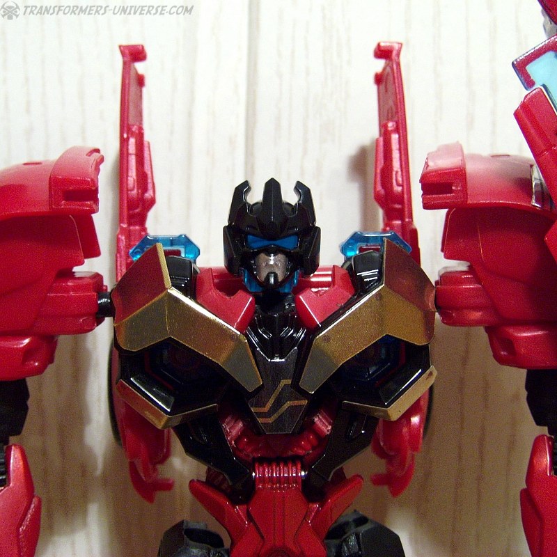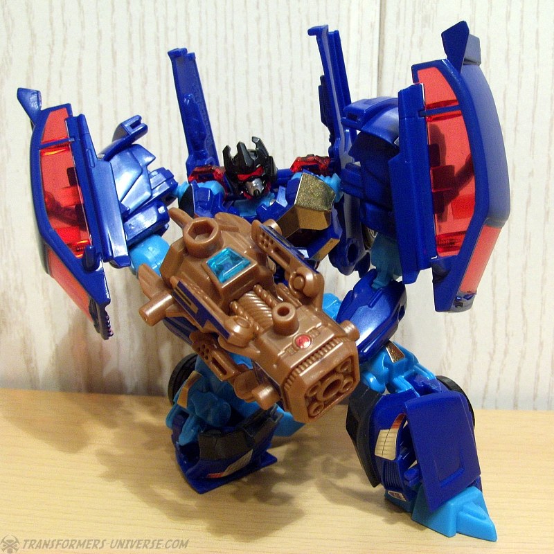 Arms Micron: Beide kommen mit dem gleichen Micron welcher sich nur in den Stickern unterscheidet. Der eine bekommt rote, der andere blaue Aufkleber, jeweils passend zur eigentlichen Figur. Auch beim Namen wurde gespart, einfach als Dago F oder R betitelt. Im Robotermodus könnten beide einer der vielen Androiden aus Star Wars sein, sieht nett aus. Im Waffenmodus als Piledriver jetzt weniger zu gebrauchen, aber als Handfeuerwaffen und Raketenwerfer durchaus gut. Somit nicht unter den besten, aber einer der besseren Microns.