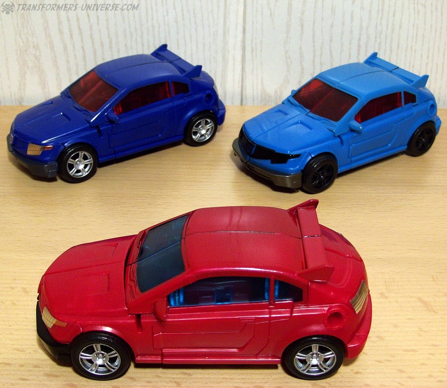 Fahrzeugmodus: In diesem Fall ein rotes und ein blaues Auto und im Aufbau an sich keinerlei Änderungen. Und nein, es gibt nicht einmal die berühmt-berüchtigten Micron Knubbel. Abgesehen von Farbe und Sticker alles gleich. Weil wir gerade von Farbe reden, gegen Hasbro Rumble sind DOTM Toys im Vergleich ja schon richtig bunt. Daher ist es wohl keine Kunst, dass die AM Versionen da mehr punkten können. Ohne Sticker fehlen ihnen zwar die Frontscheinwerfer, dafür gibt’s aber auch welche für Rücklichter und es wurde trotzdem mehr Farbe als bei Hasbro verwendet. Ihr ahnt es, die Felgen sind bemalt! Und das macht alleine einen gewaltigen Unterschied. Neben dem Rot von Rumble ist das Blau von Frenzy sehr viel dunkler gehalten und beide bieten eine Art Farbumkehr. Blaues Auto mit roten Fenstern und rotes Auto mit blauen Fenstern. Passt sehr gut und unterm Strich deutlich ansehnlicher als die Hasbro Version. Somit beide klein aber fein.