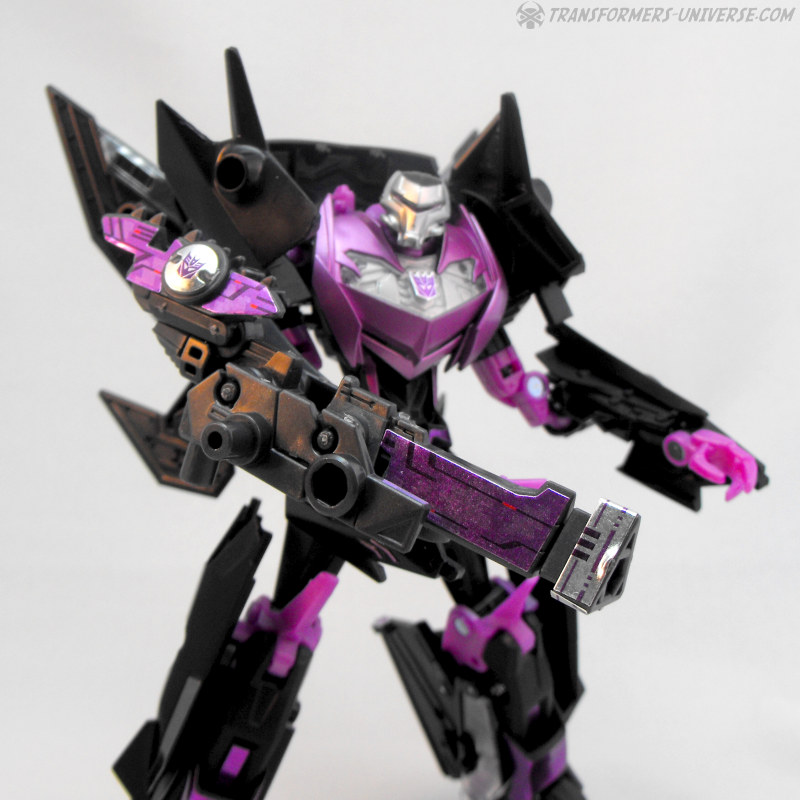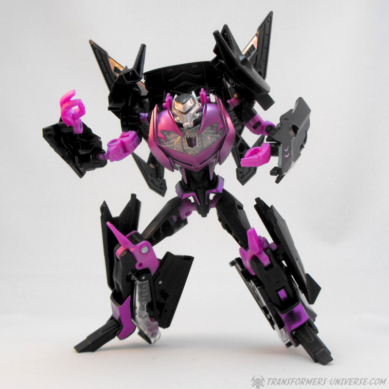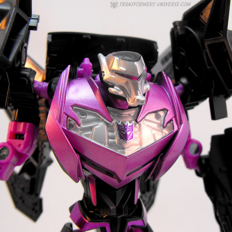 Und wo wir schon vom Auto Vehicon gesprochen haben (den ich leider noch nicht besitze), der Jet Vehicon ist praktisch der gleiche Roboter, nur mit Flügeln auf dem Rücken und lila Farbakzenten. Der Fahrzeugmodus (siehe unten) ist fast komplett neu, was den Robotermodus aber kaum betrifft. Jet Vehicon ist ein sehr cool aussehender und schön detaillierter Roboter. Okay, einige der Details sind nur Sticker, was man jetzt entweder mag oder nicht, aber das fertige Produkt sieht auf jeden Fall sehr gut aus.