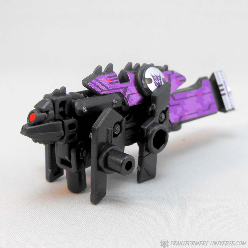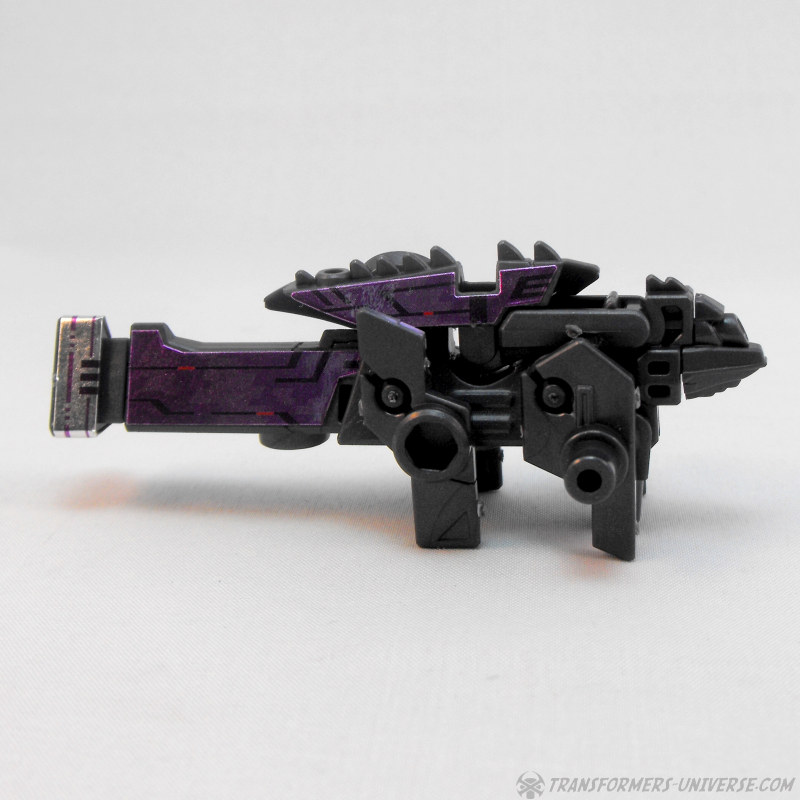 Außerdem sehr gut, die Beweglichkeit der Figur. Da sie kaum Anhängsel und alle notwendigen Gelenke hat, kann Jet Vehicon problemlos posieren und hat auch mit dem Gleichgewicht keine Probleme. Und dann gibt’s da noch seine Waffe, eine große Wumme mit dreieckiger Mündung, die außerdem transformiert... also, so ein bißchen. Mehr dazu unten. Persönlich hätte ich zwei etwas kleinere Waffen bevorzugt (wäre auch vorbildgetreuer), aber das ist ja kein Beinbruch. Die Waffe passt in die Löcher an Unterarmen oder Schultern, wie übrigens auch die meisten DOTM Mechtech Waffen.