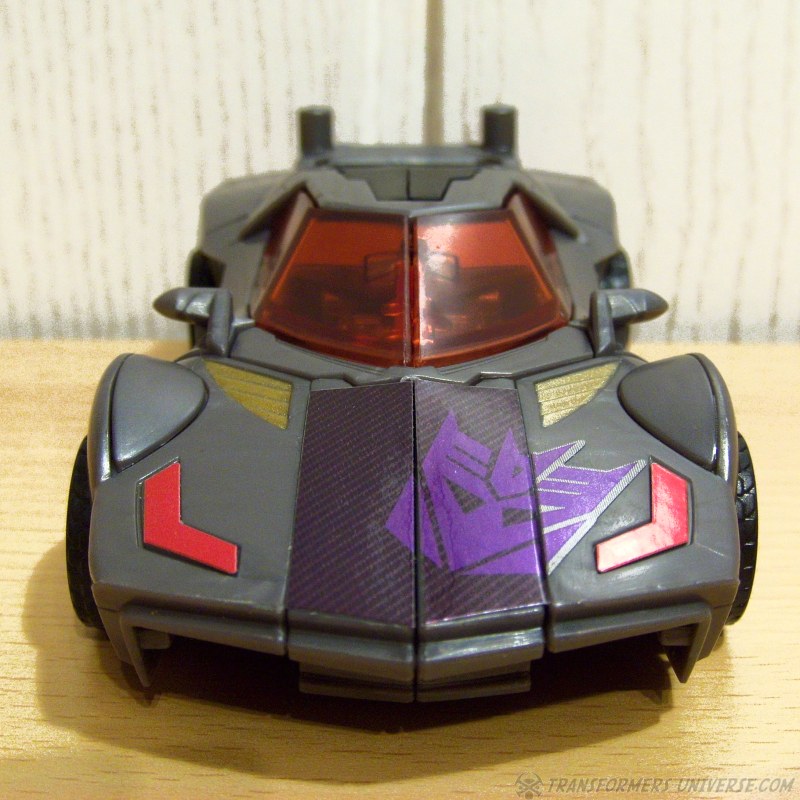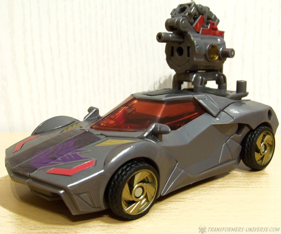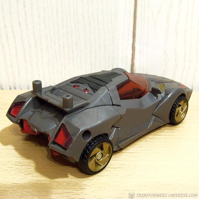Fahrzeugmodus: Der Fahrzeugmodus also solcher basiert auf Takaras Version von Wheeljack, also mit den zusätzlichen Micron Knubbeln. Mag nicht ganz so schnittig aussehen, aber stört auch nicht wirklich. Zumal glücklicherweise die Knubbel an den vorderen Kotflügeln weggelassen wurden. Neben der grauen Farbgebung mit den goldenen Felgen nicht wirklich etwas Neues; ein kleines aber schönes Auto, das Geschwindigkeit vermittelt. Eine nette Idee finde ich das große Decepticon Symbol auf der Motorhaube.