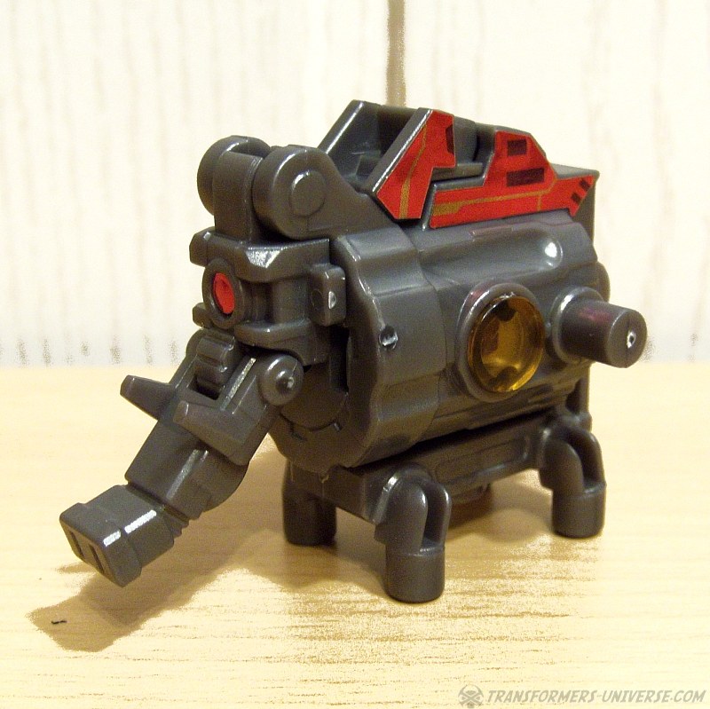 Arms Micron: Ozu stellt wohl einen Elefanten dar. Der erste Elefant in Wagenfarbe. Trotzdem für das Auto noch immer ohne Nutzen. Sieht witzig aus, aber nicht mehr. Wie vermutet verwandelt er sich in eine Waffe, auch wenn sich mir nicht ganz erschließen will in was für eine. Könnte eine Handwaffe sein, könnte aber auch etwas anderes darstellen. Denke man merkt, dass der wohl nicht zu den besten Arms Microns gehört. Als Raketenwerfer für Wildrider funktioniert er, aber mehr nicht.