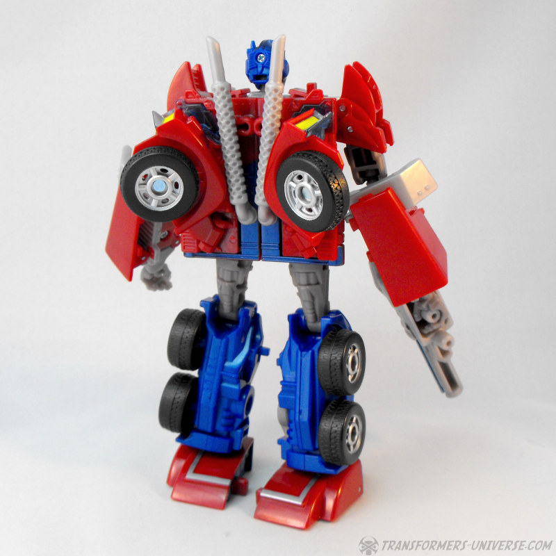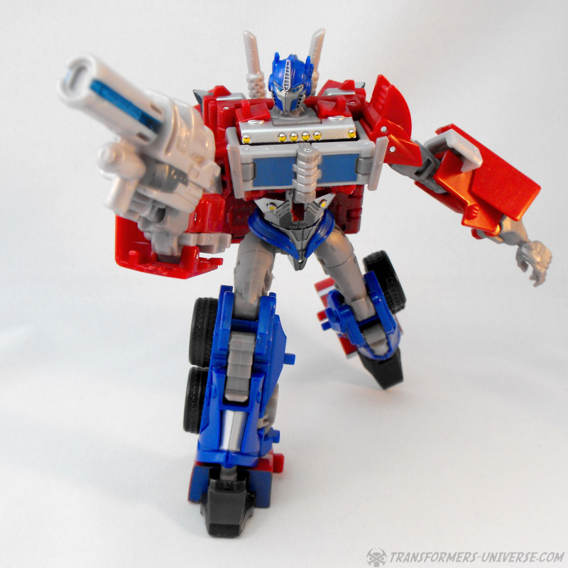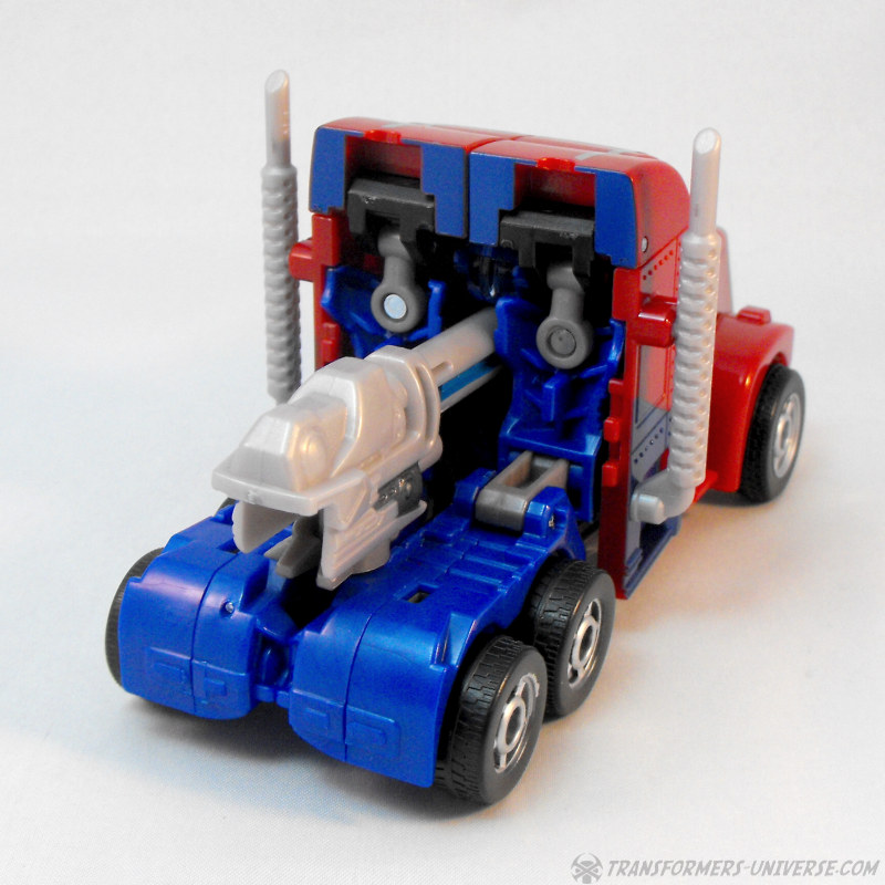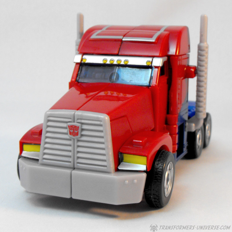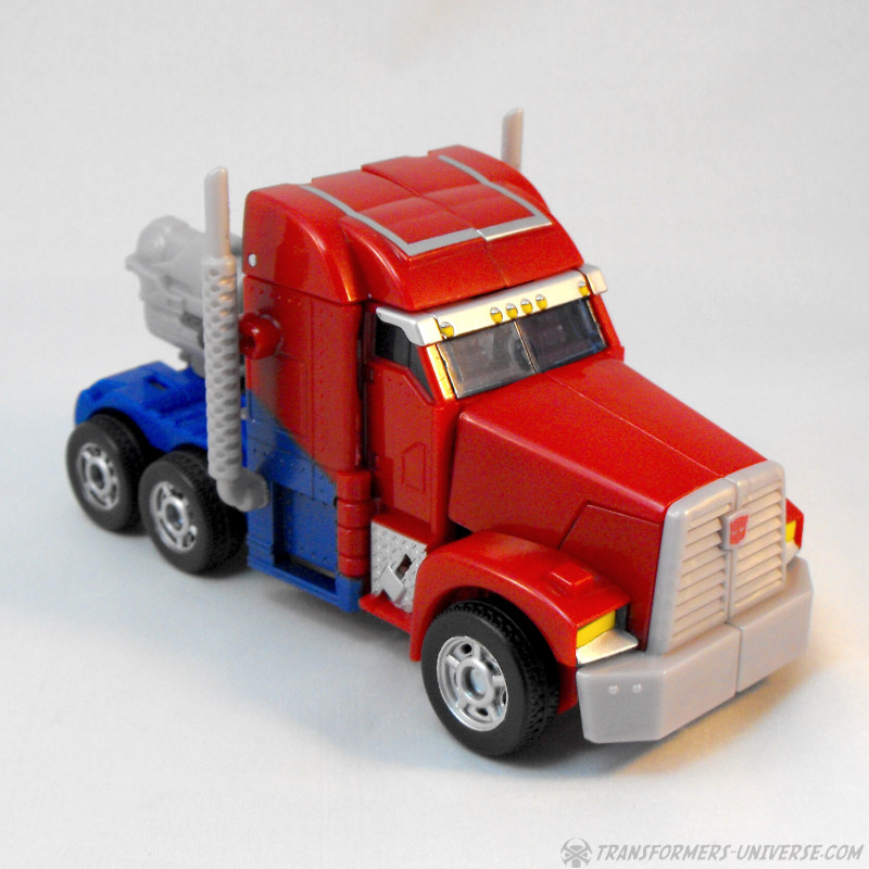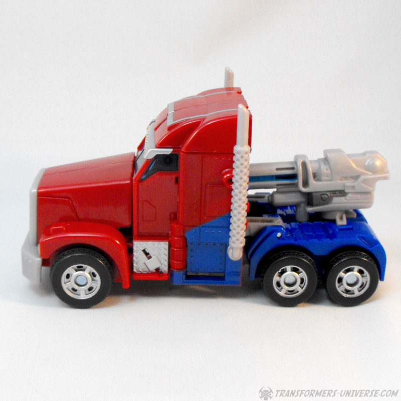 Alternativmodus: Wenig überraschend wird Optimus zu einem größtenteils roten LKW, ähnlich dem Peterbuild Truck, der als Vorlage für die diversen Movie Primes fungierte, nur ohne Flammen und Tuning. Ein langer roter Truck ohne Anzeichen, dass sich ein Roboter darin verbirgt, es sei denn man montiert hinten seine Kanone drauf. Und... ja, mehr fällt mir hierzu auch nicht mehr ein, ehrlich gesagt. Ein rotblauer LKW. Sieht gut aus, keine Beschwerden.