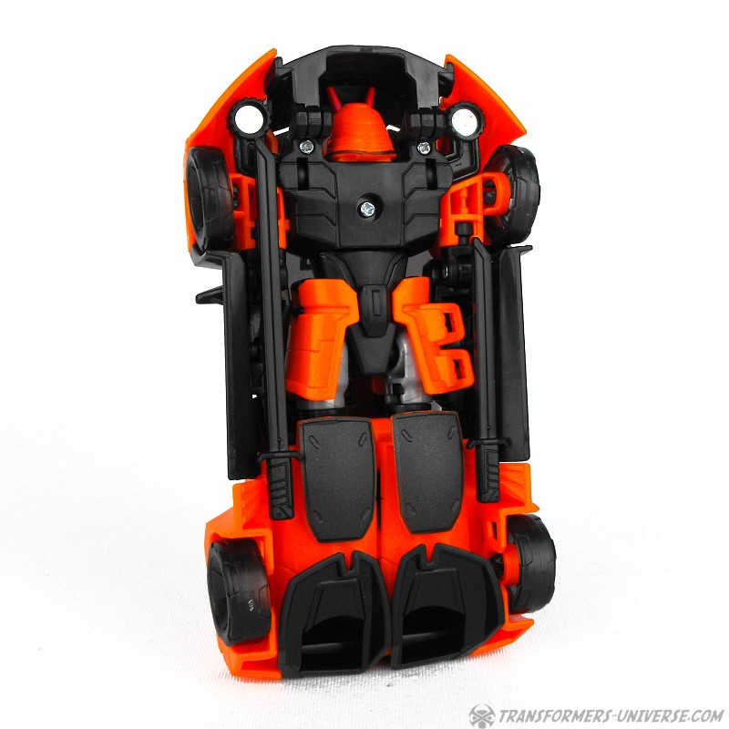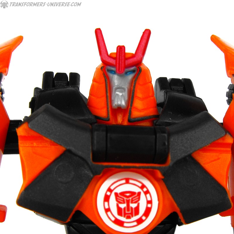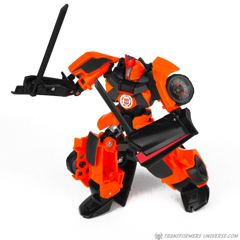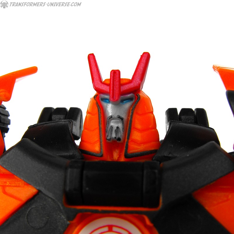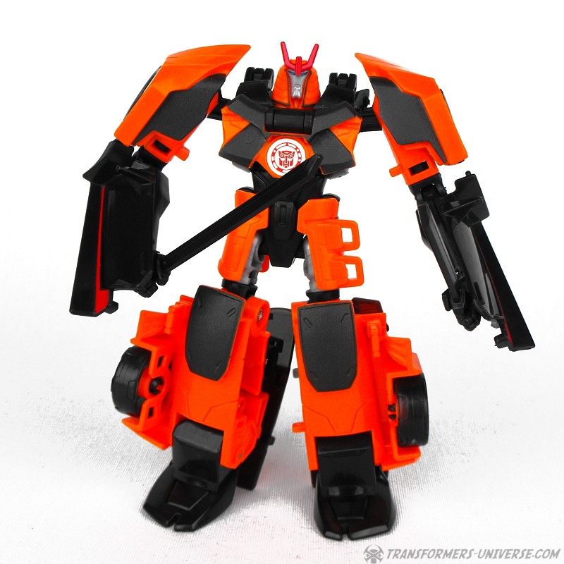 Robotermodus: Drift hat ja bereits ein paar verschiedene Farben ausprobiert. Der erste Drift (aus den IDW Comics) war weiß. Darauf folgte Age of Extinction Drift, der war blau. Und nun sind wir in der neuen Robots in Disguise Reihe und hier ist er jetzt orange. Was sich nicht geändert hat hingegen ist, dass er ein Samurai-Typ ist, inklusive der beiden traditionellen Schwerter und einem stark japanisch angehauchten Design. Ähnlich wie sein Age of Extinction Vorgänger hat er einen Kopf, der an den Helm eines mittelalterlichen Samurai erinnert, und auf dem Gesicht hat er ein skulptiertes (aber leider nicht bemaltes) Bärtchen im japanischen Stil. Seine Füße im Robotermodus sind Tabi nachempfunden, diese japanischen Socken mit dem separierten großen Zeh. Und dann hat er noch so einen Waffenrock um die Hüfte, was den Samurai-Look vervollständigt.
