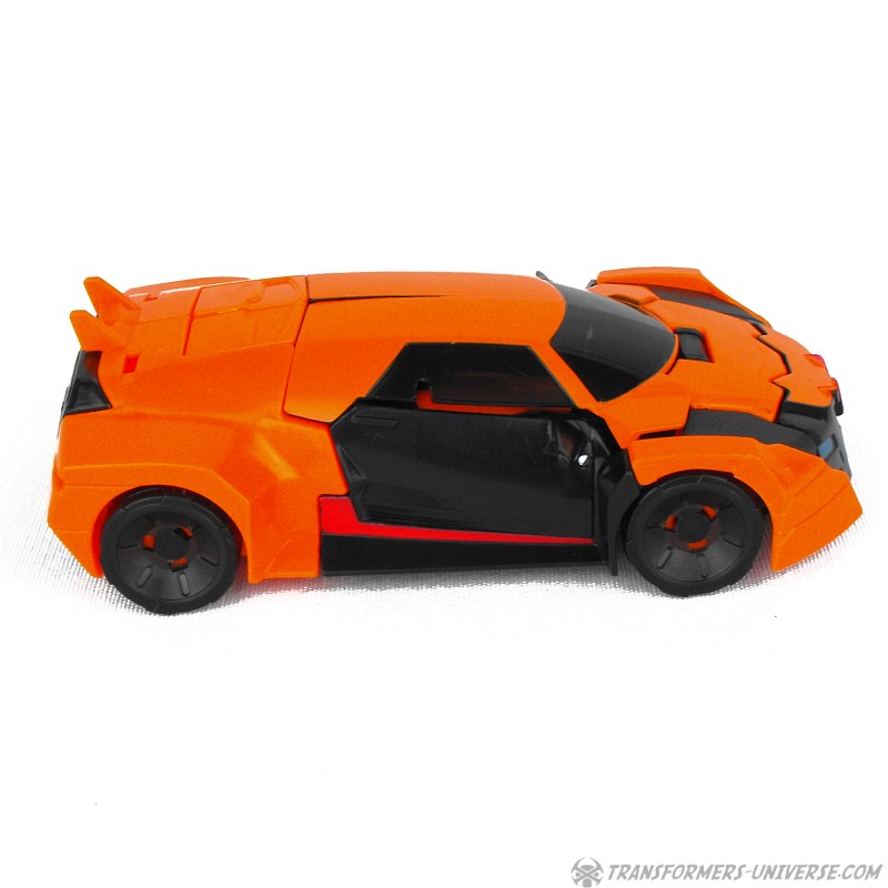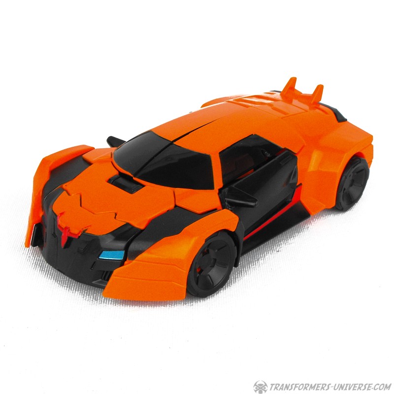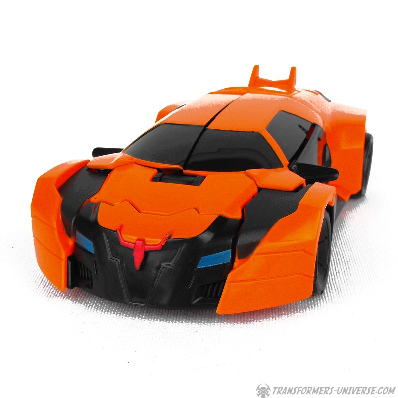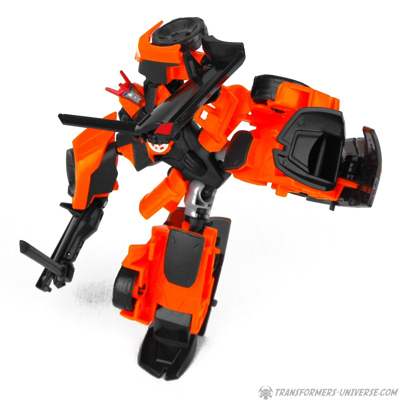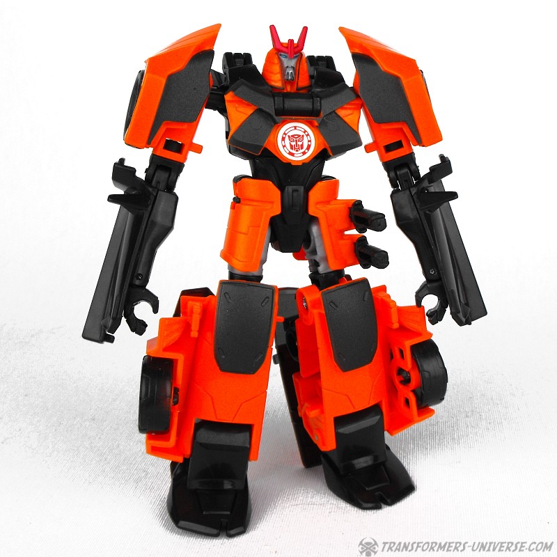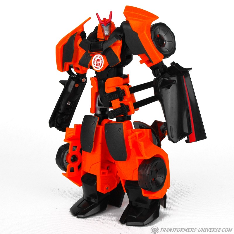 Robotermodus: Drift hat ja bereits ein paar verschiedene Farben ausprobiert. Der erste Drift (aus den IDW Comics) war weiß. Darauf folgte Age of Extinction Drift, der war blau. Und nun sind wir in der neuen Robots in Disguise Reihe und hier ist er jetzt orange. Was sich nicht geändert hat hingegen ist, dass er ein Samurai-Typ ist, inklusive der beiden traditionellen Schwerter und einem stark japanisch angehauchten Design. Ähnlich wie sein Age of Extinction Vorgänger hat er einen Kopf, der an den Helm eines mittelalterlichen Samurai erinnert, und auf dem Gesicht hat er ein skulptiertes (aber leider nicht bemaltes) Bärtchen im japanischen Stil. Seine Füße im Robotermodus sind Tabi nachempfunden, diese japanischen Socken mit dem separierten großen Zeh. Und dann hat er noch so einen Waffenrock um die Hüfte, was den Samurai-Look vervollständigt.