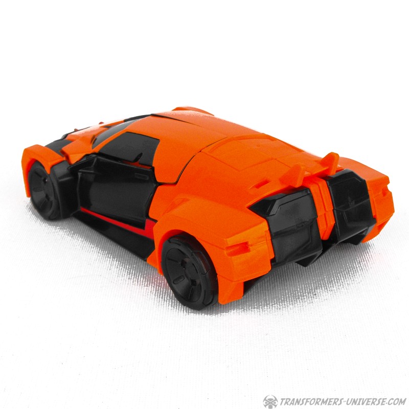 Alternativmodus: Drift behält das gleiche Automodell als Alternativmodus, dass er schon in Age of Extinction hatte, nämlich einen Bugatti. Das genaue Modell kann ich jetzt nicht benennen, aber das Auto sieht toll aus. Detaillierung ist jetzt nicht in Massen vorhanden, aber wir haben blau bemalte Scheinwerfer, das rote Logo vorne entspricht dem auf Drifts Helm im Robotermodus, und die schwarzen Scheiben sehen auch edel aus. Okay, etwas mehr hätte man hier noch haben können, aber mir gefällt das Auto. Die beiden Schwerter kann man an der Unterseite verstauen (auch hier kein Hinweis darauf in der Anleitung). Unterm Strich somit: ein guter Automodus.