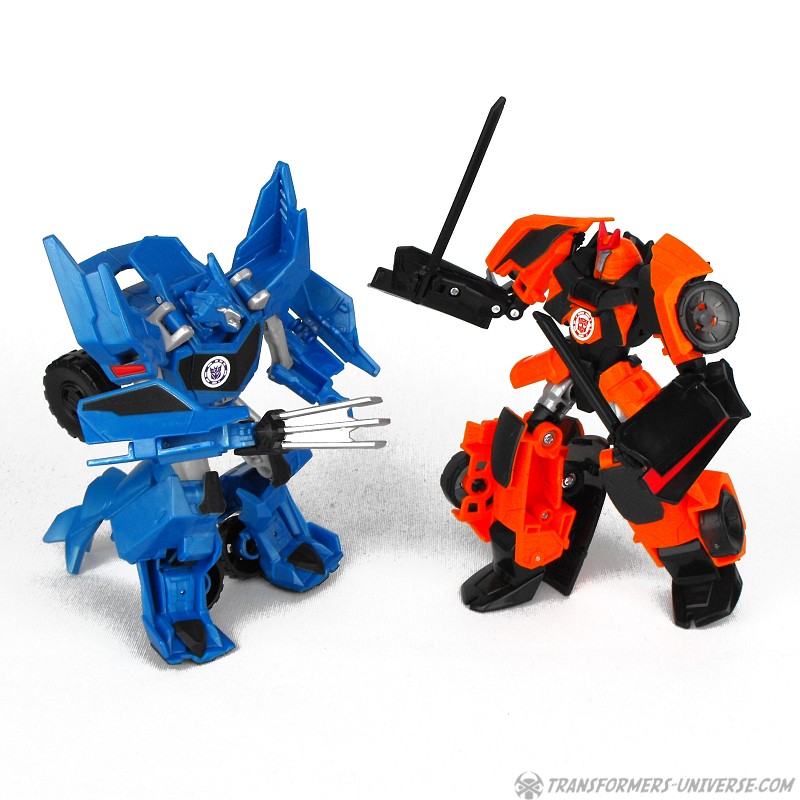 Drifts Proportionen sind ein wenig seltsam. Er hat riesige Unterschenkel, Füße und Schultern, während sein Torso und der Kopf eher klein geraten sind. Funktioniert aber gut, wie ich finde, speziell mit dem stilisierten Design der neuen RID Serie. Keine Beschwerden in punkto Beweglichkeit, Drift kann gut posieren. Ihm fehlen zwar die drehbaren Handgelenke, die ich bei schwertschwingenden Bots gerne sehe, macht das aber mit doppelten Ellbogengelenken wett. Schwertkampf-Posen sind somit kein Problem. Wenn er die Hände frei haben will, kann er die Schwerter an der linken Hüfte befestigen (was in der Anleitung übrigens nicht erwähnt wird).