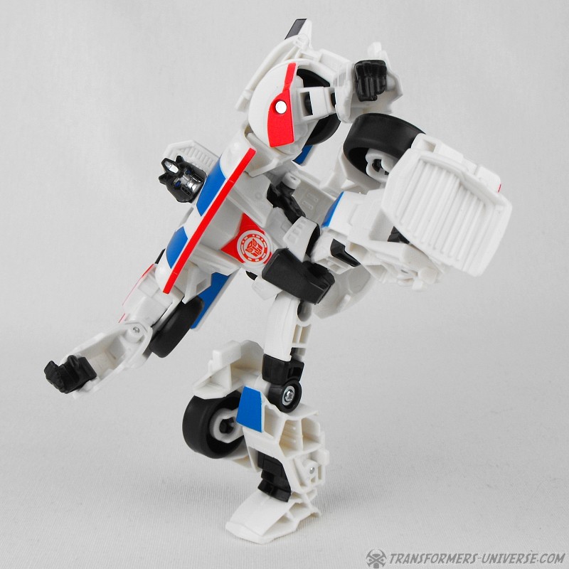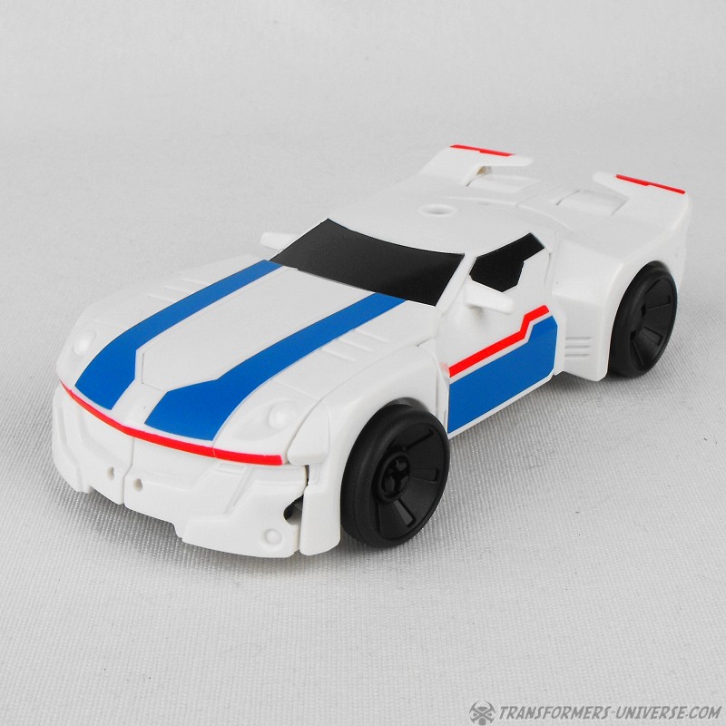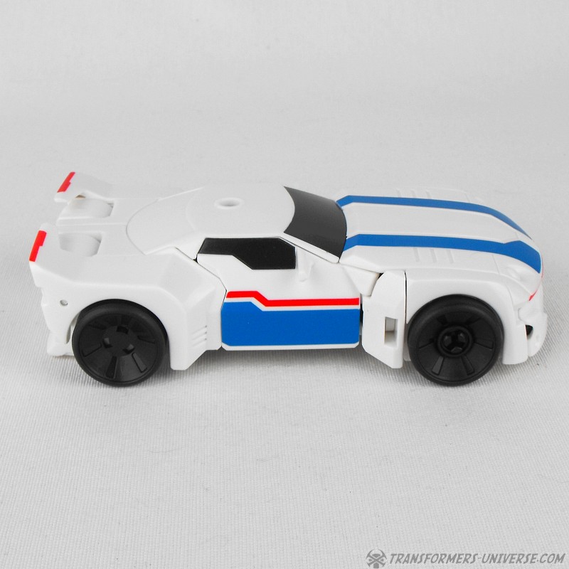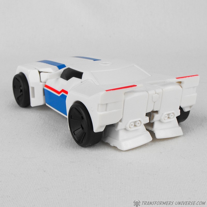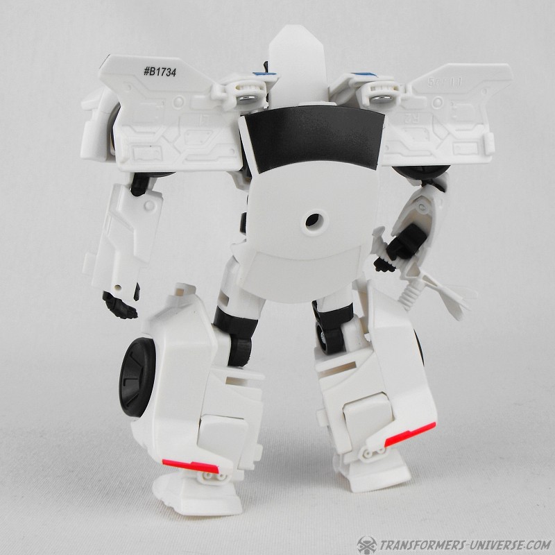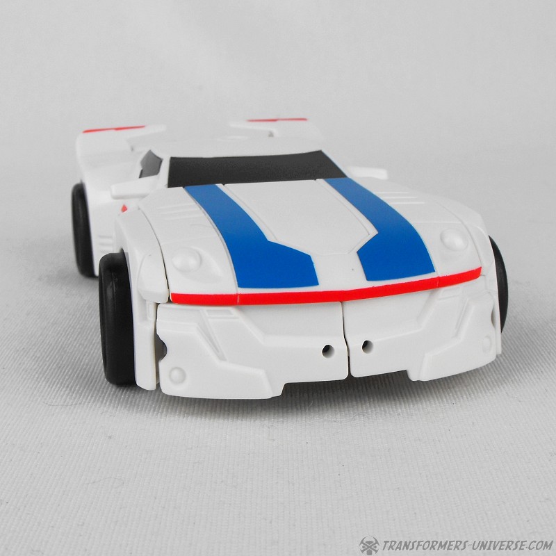 Alternativmodus: Jazz verwandelt sich in einen futuristischen weißen Sportwagen mit seinen traditionellen blauen Streifen. Das Auto als solches sieht gut aus und alles faltet sich gut zusammen, aber hier fällt einem der Mangel an farbigen Highlights noch deutlich mehr ins Auge. Jazz hat skulptierte Scheinwerfer und Rücklichter, Platz für Nummernschilder und hinten einen Fleck, der ganz deutlich für ein Autobot Symbol gedacht ist, aber alles nur weißes Plastik, was die Details einfach verschluckt. Jazz‘ Waffe kann oben auf dem Dach montiert werden, was... komisch aussieht. Lasst sie besser beiseite. In Summe ein guter Automodus, aber bitte, bitte, bitte gebt ihm ein paar mehr farbige Details, irgendjemand!