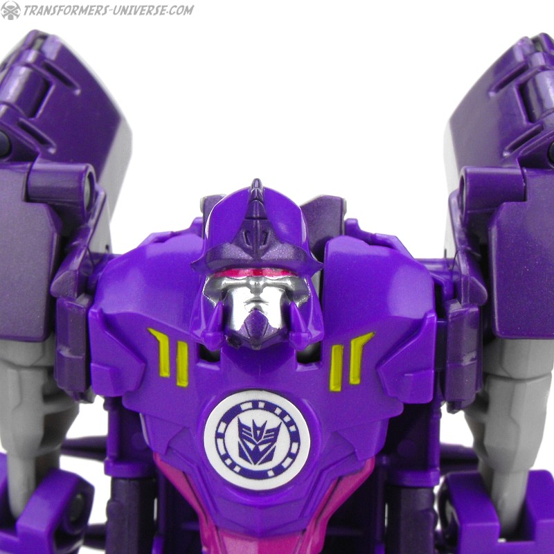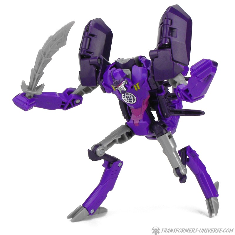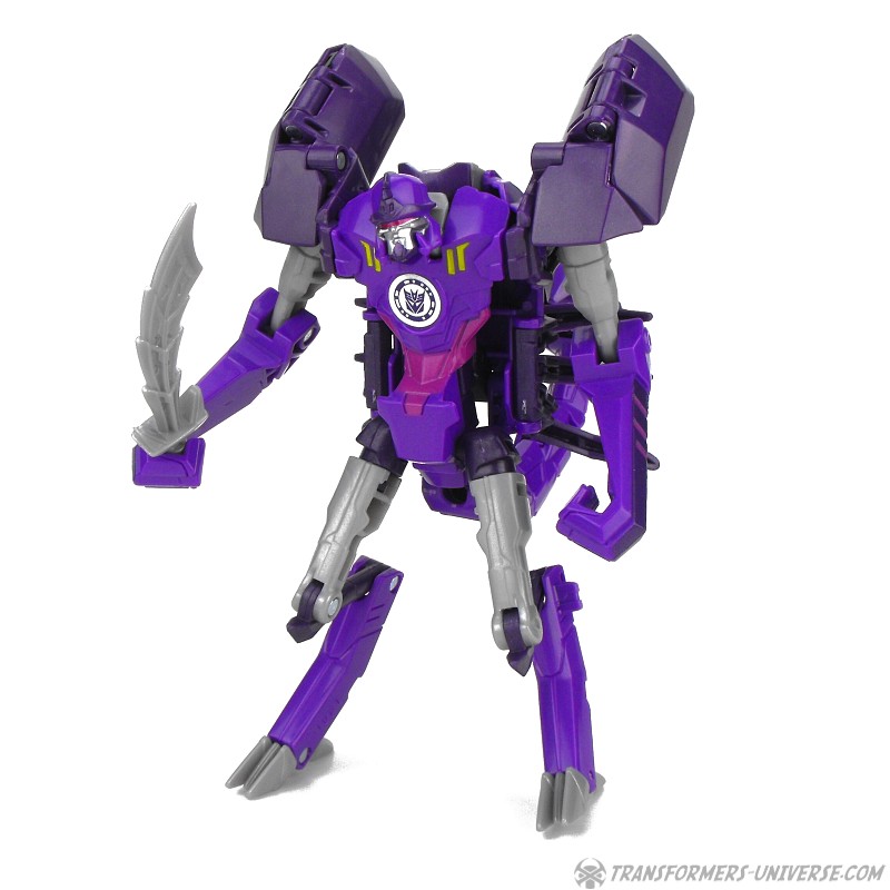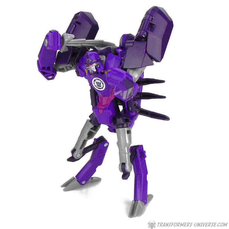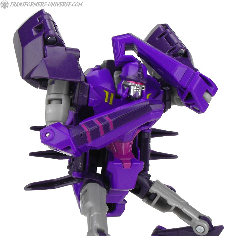Davon abgesehen ist Paralon aber auch ein ziemlich guter Roboter. Er ist ein ziemlich dürres Gestell, mal abgesehen von seinen großen Schulterstücken, hat aber trotz der kleinen Füße und Hühnerbeinchen einen soliden Stand. Die Beweglichkeit ist gut und die Detaillierung für eine RID Warrior Figur ebenfalls gelungen. Okay, ja, er ist größtenteils lila, so wie eine ganze Reihe anderer RID Decepticons auch, aber das ist nun mal ihre Farbe. Man kann sie ja nicht dafür bestrafen, dass sie ihre Corporate Identity verinnerlicht haben, oder?