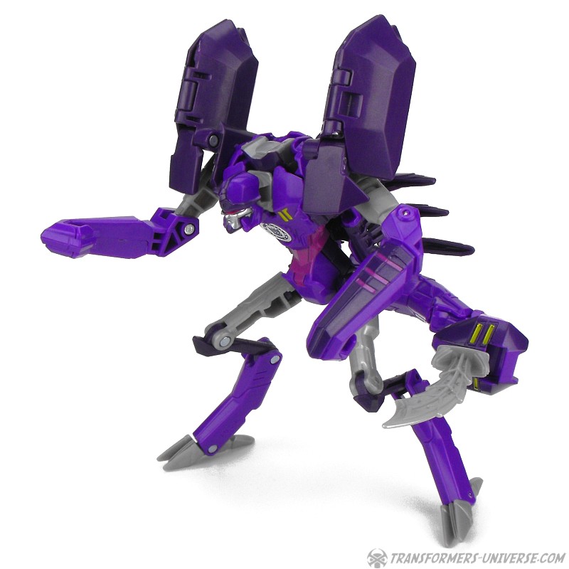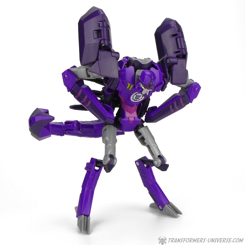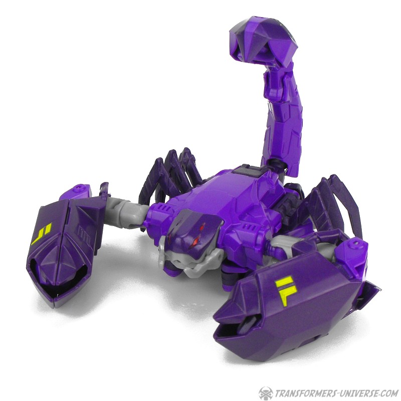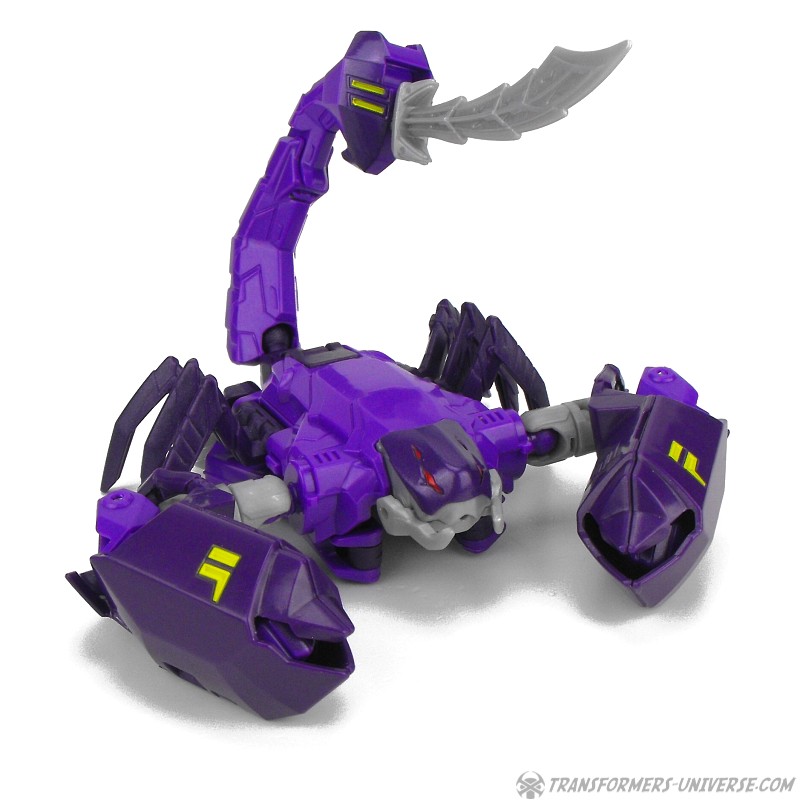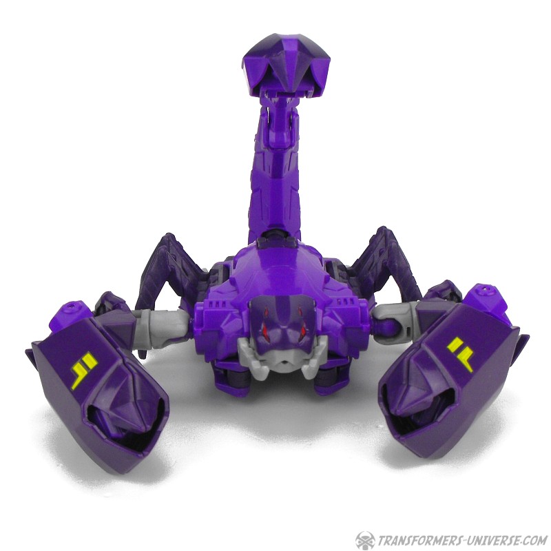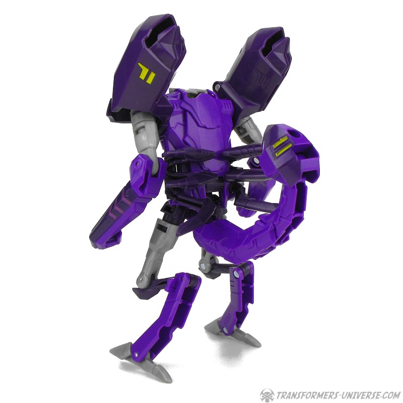Robotermodus: Das Wichtigste gleichmal vorweg. Obwohl er natürlich einen Robots in Disguise Charakter darstellt, ist Paralon außerdem eine Hommage an einen Beast Wars Charakter, nämlich Scorponok. Nicht nur weil er ein lila Roboter ist, der sich in einen Skorpion verwandelt, sondern speziell wegen seinem Kopf. Dieser ist eine fast perfekte Nachbildung der Rübe von Beast Wars Scorponok aus der TV Serie (weniger die des Toys). Was besonders interessant ist, weil Paralons Kopf im RID Cartoon etwas anders aussieht, aber für mich als Beast Wars Fanatiker ist das natürlich Nebensache, ich liebe die Hommage.