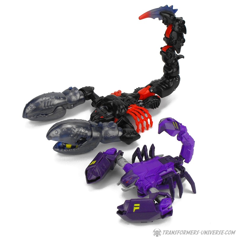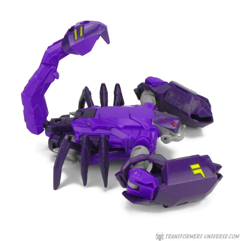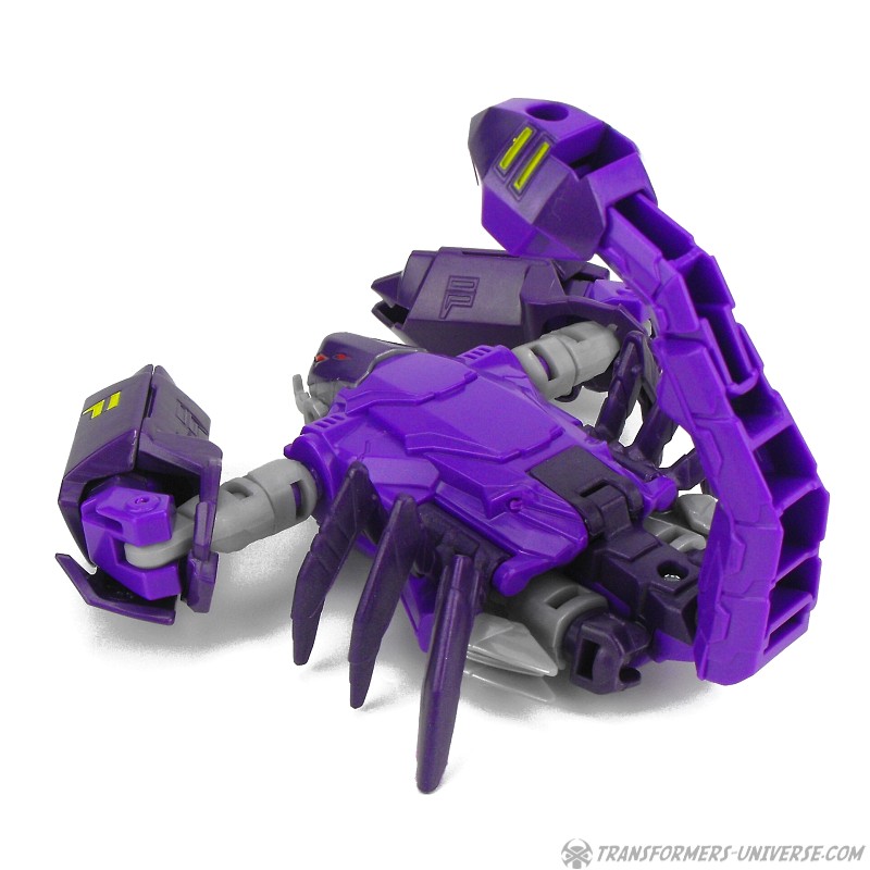 Alternativmodus: Paralon verwandelt sich in einen Roboter-Skorpion. Die Transformation ist für eine RID Warrior Figur sogar recht komplex. Die großen Schulterstücke wandern am Arm runter und werden zu den Klauen des Skorpions. Die Klauen sehen gut aus, nur leider sorgt das Design dafür, dass sie nur noch an den Schultern beweglich sind. Ansonsten legt sich Paralon im Prinzip auf den Bauch, zieht die Beine an, und fertig ist der Skorpion. Das Resultat sieht gut aus, behält den beweglichen Schwanz und man kann natürlich auch in dieser Form das Schwert als vergrößerten Stachel anstecken. Insgesamt also ein gelungener Biestmodus. Ein wenig mehr Beweglichkeit für die Arme/Klauen wäre schön gewesen, aber davon abgesehen: gut gemacht.