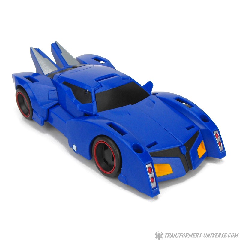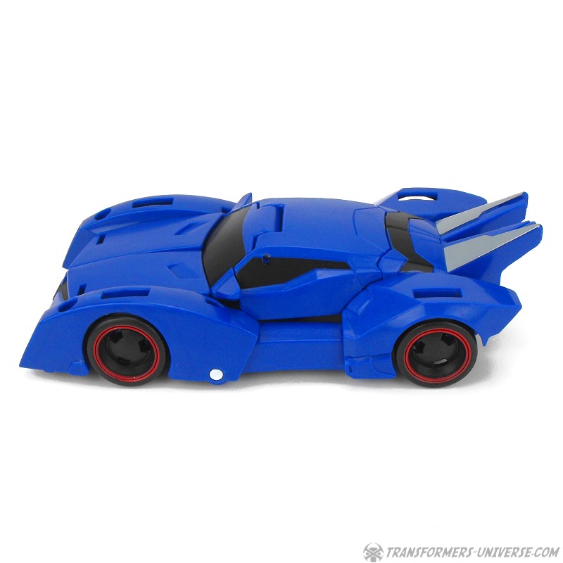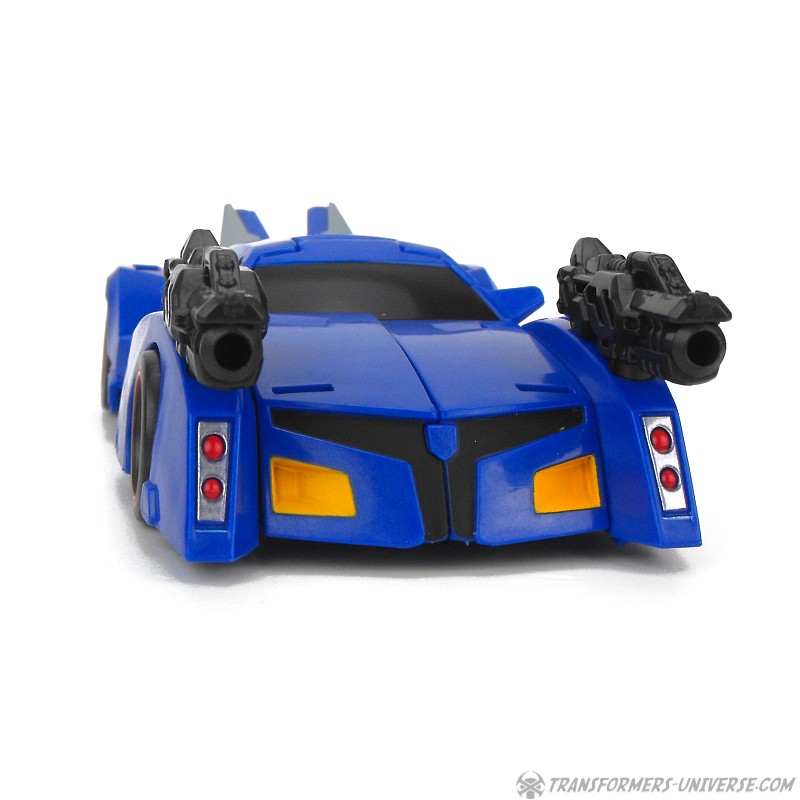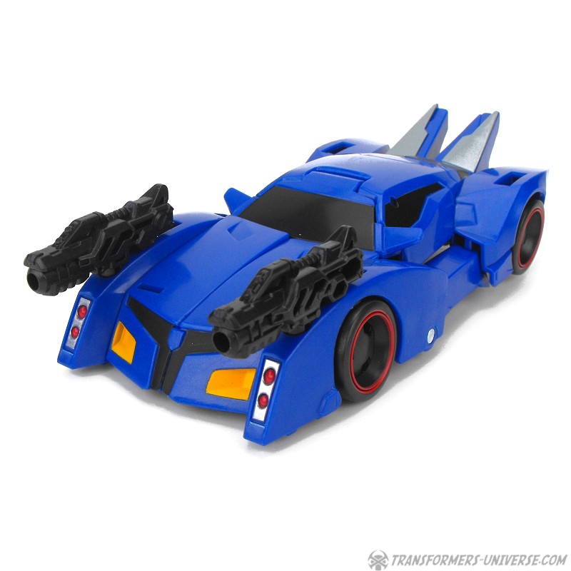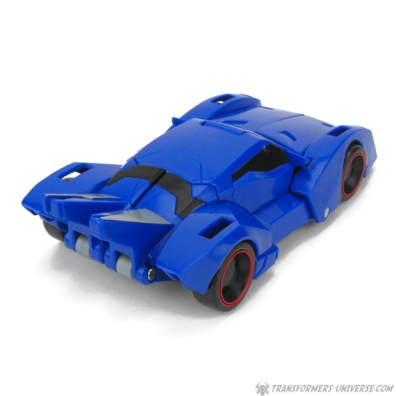 Alternativmodus: Thermidor verwandelt sich in einen futuristischen blauen Sportwagen mit schwarzen Scheiben und Rotbandreifen. Das Auto wirkt verdammt schnittig und schnell, ein schöner Kontrast zu dem bulligen Roboter, in den es sich verwandelt. Es gibt keine sichtbaren Roboterteile, alles fügt sich gut zusammen und man kann Thermidors zwei schwarze Kanonen vorne montieren, um dem Gefährt Feuerkraft zu geben. Unterm Strich somit: ein sehr schöner, cool aussehender Automodus. Schön gemacht.