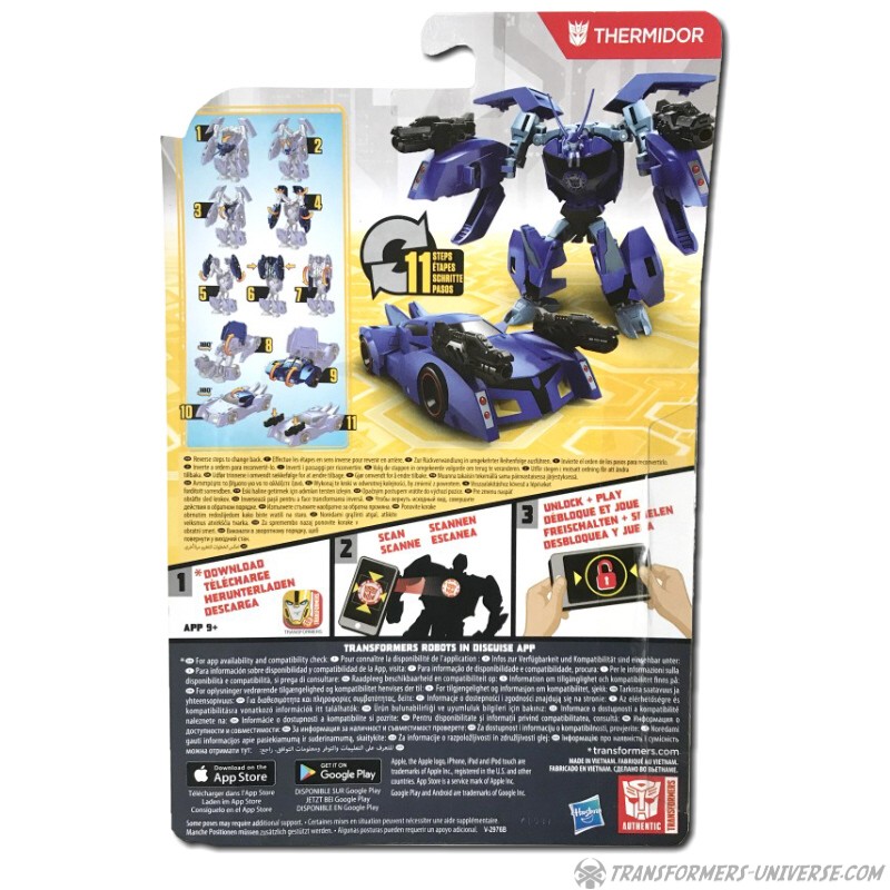 Robotermodus: Thermidor ist ein großer, breiter Roboter dessen Design jede Menge Kraft und Muskeln suggeriert. Er ist beinahe genauso breit wie hoch mit kurzen Beinen und riesigen Scheren als Händen. Wie die meisten RID Decepticons ist sein Design an ein Tier angelehnt, in seinem Fall ein Hummer. Der Kopf folgt diesem Design mit den zwei langen Antennen und einer Art Bart. Sehr schön gemacht, ich liebe das Design dieses Jungens.