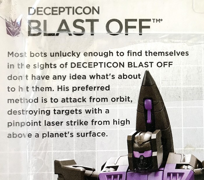 Bemerkungen: Die Combaticons wurden von ihren Charakterzügen schon oft mit dem A-Team verglichen. Somit wäre dann Blast Off wohl am ehesten Amy Amanda „Triple A“ Allen, die einzige Dame im Team, die meist nicht direkt bei der Action dabei war, sondern ihr Team eher von Weitem unterstützte. Da wir Blast Off ja auch des Öfteren im Orbit sehen, wo er aus großer Entfernung feuert, passt das ja irgendwie. Und zumindest in den IDW Comics hatte er ja auch was mit seinem Teamleiter Onslaught.