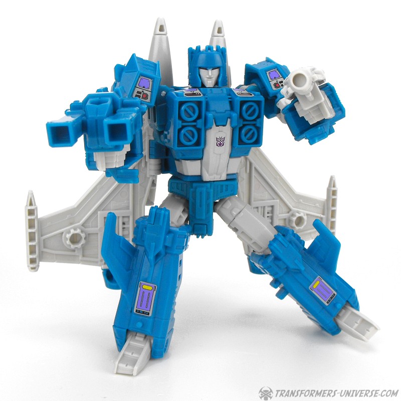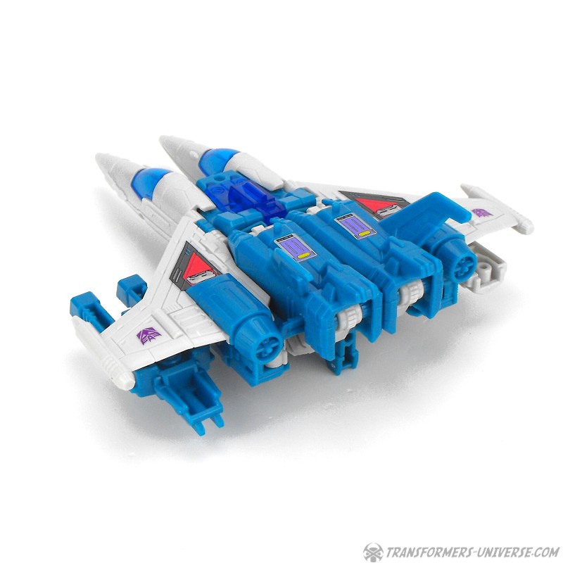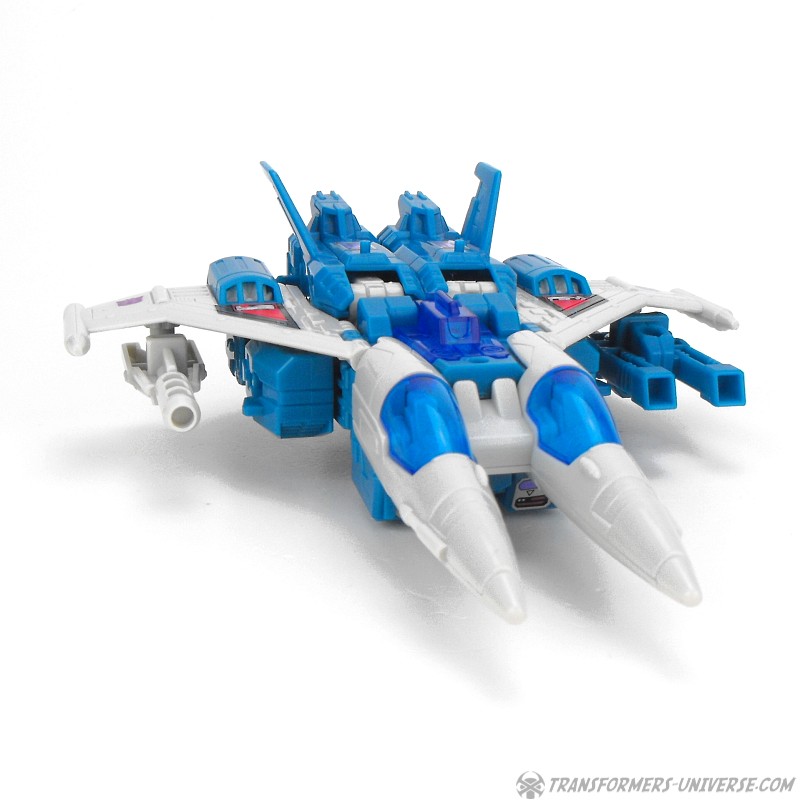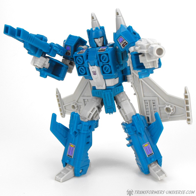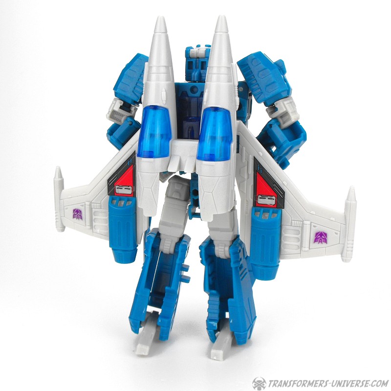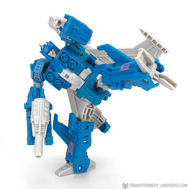 Alternativmodus: Viel hatte G1 Slugslinger ja nicht, was ihn von der Masse abhob, aber sein Jetdesign war recht einzigartig. Das Design mit den zwei Cockpits wurde für die Energon Version wieder aufgegriffen und jetzt auch hier bei Titans Return. Natürlich liegt das eigentliche Cockpit für seinen Titan Master Caliburts weiter hinten, die beiden nur angedeuteten Cockpits weiter vorne wären nicht annähernd groß genug. Trotzdem sehr schön dieses Design wiederzusehen. Ansonsten immer noch ein exzellenter Jetmodus. Keine Beschwerden.