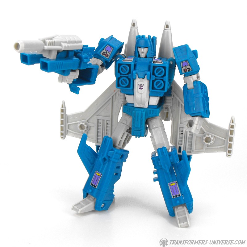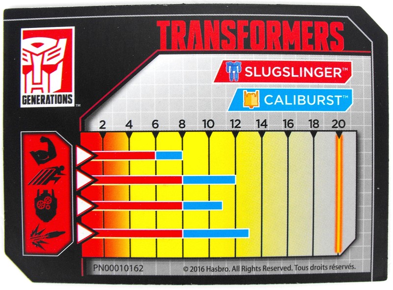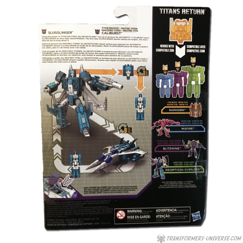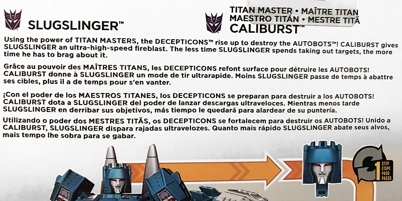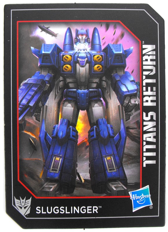 Bemerkungen: Slugslinger gehörte zu den 1987 vorgestellten Decepticon Targetmasters und spielte eine Hintergrundrolle im Serienfinale „Die Wiedergeburt“. Und... ja, das war’s eigentlich auch schon in punkto Medienpräsenz für diesen Jungen, der wenn überhaupt nur als der „Zwillings-Cockpit-Jet-Typ“ bekannt ist. Es ist trotzdem schön ihn in Titans Return wieder zu sehen. Wenn ich die drei Varianten dieser tollen Figur vergleiche, dann ist Triggerhappy mein Favorit, mit Slugslinger in der Mitte und Misfire auf Platz drei.