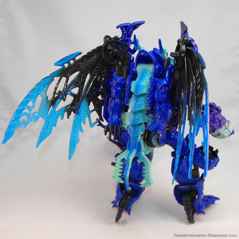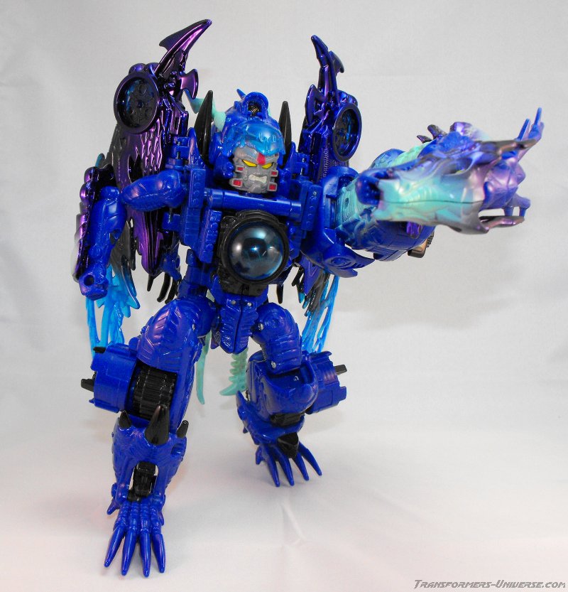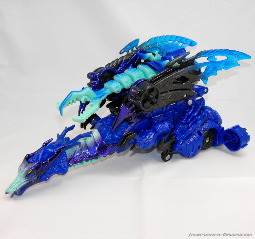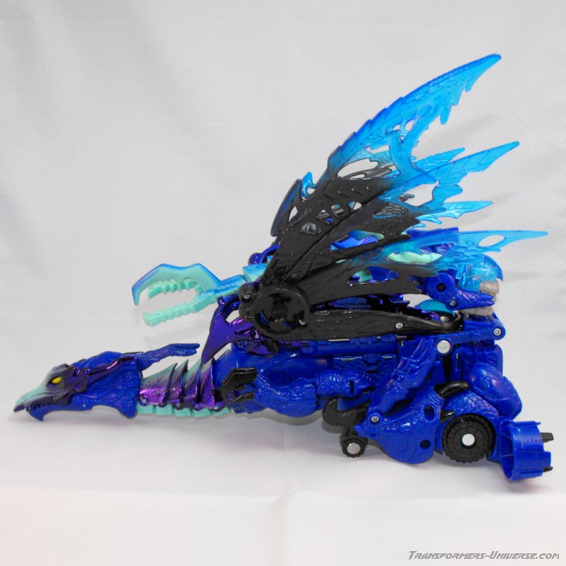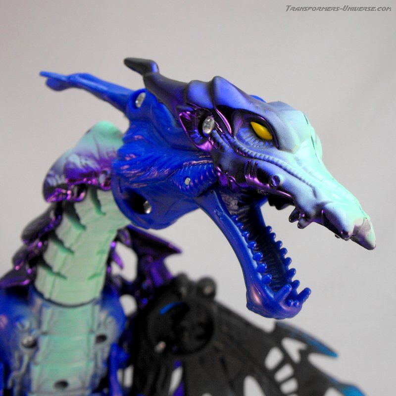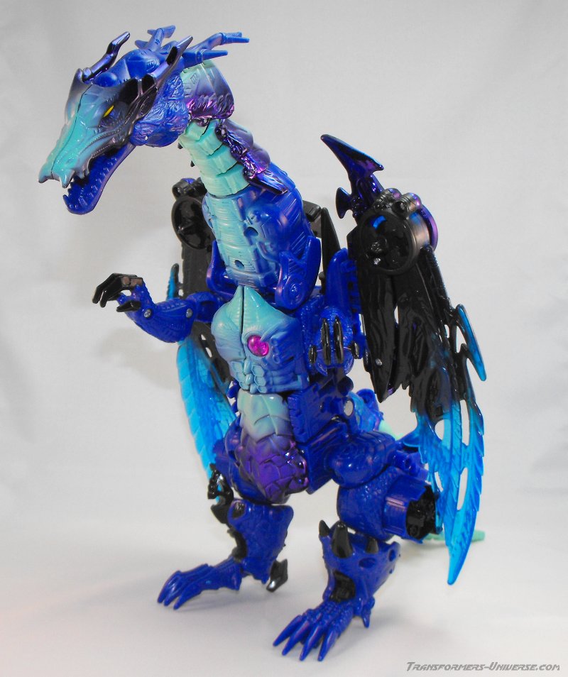 Alternativmodus: Wie die meisten Transmetals geht Cryotek gerade so als Triple Changer durch (oder vielleicht eher als Zwei-Einhalb-Changer?). Er hat einen Biestmodus, der durch geringfügige Modifikation zu einer Art Fahrzeugmodus werden kann. Fangen wir mit dem Biestmodus an. Wenig überraschend wird Cryotek zu einem Drachen. Die Transformation vom Roboter zum Drachen ist ein wenig knifflig, aber wenn man den Bogen erstmal raus hat, geht's relativ schnell. Der Drache selbst ist eine wahre Schönheit und außerdem sehr beweglich. Er kann die Flügel sowohl spreizen als auch mit den Flügeln schlagen, hat einen beweglichen Gummischwanz, voll bewegliche Beine und teilbewegliche Arme. Der Gummihals kommt natürlich auch hier zum Tragen, wenn's hier auch nicht so auffällt wie im Robotermodus. Alles in allem also ein cooler Drachenmodus. Keine Beschwerden außer auch hier der Wunsch nach einem besseren Hals.