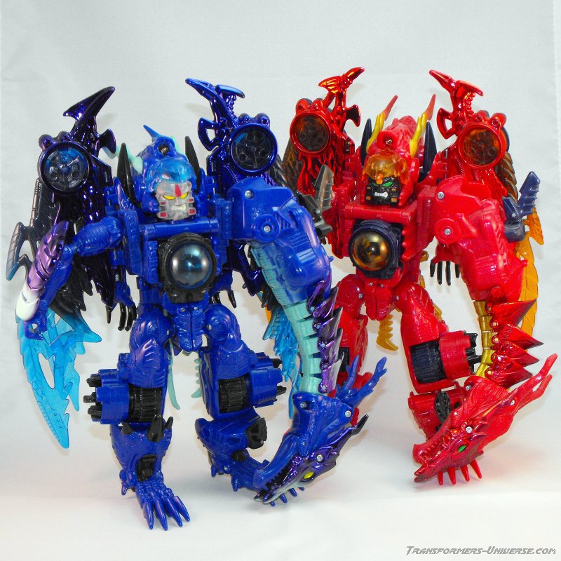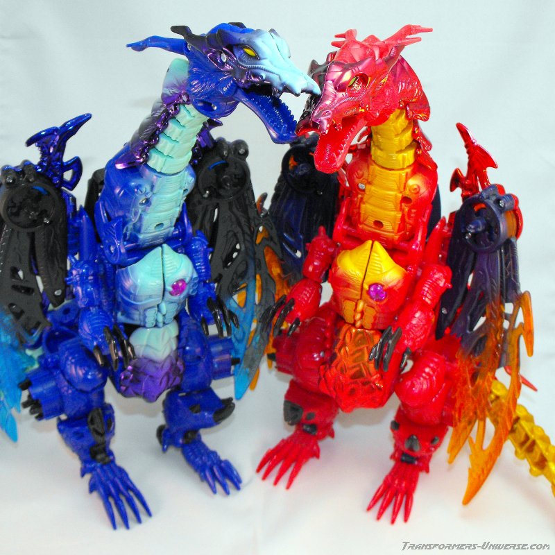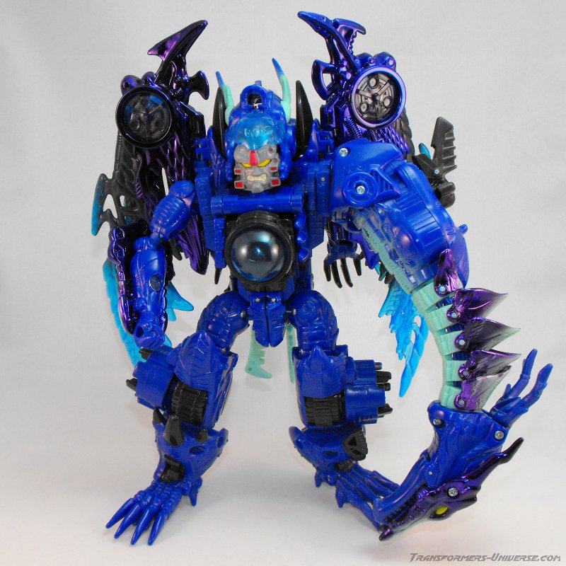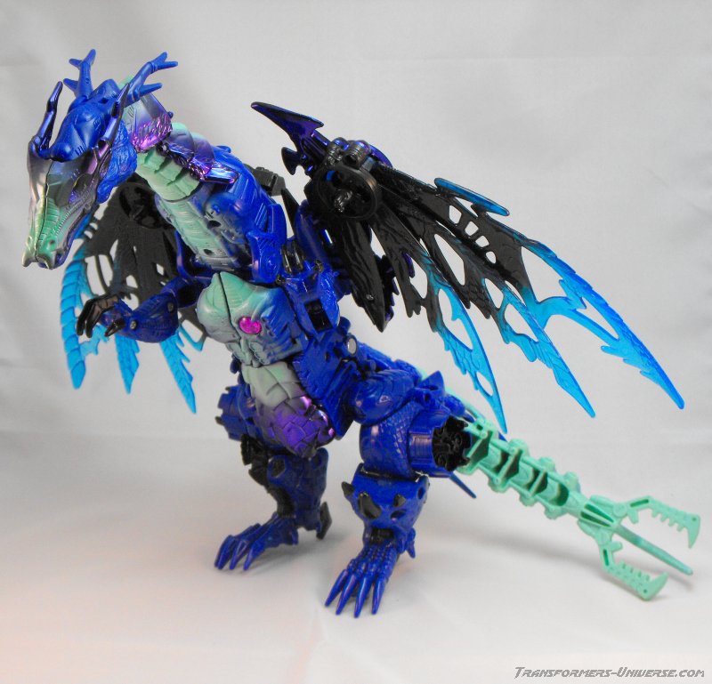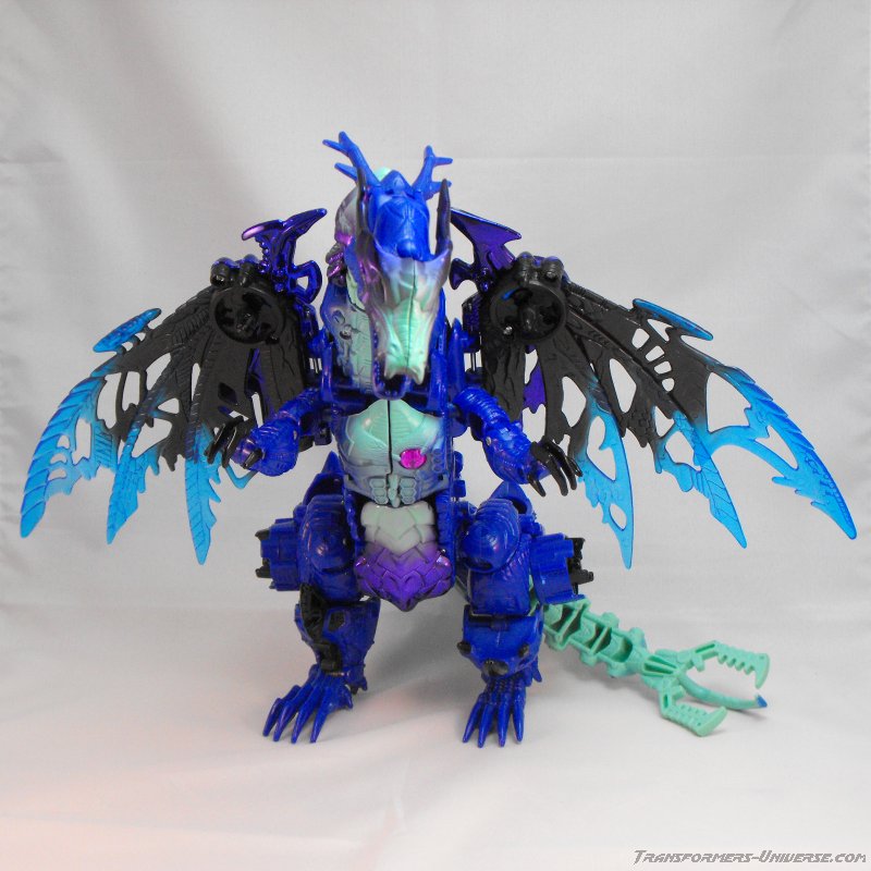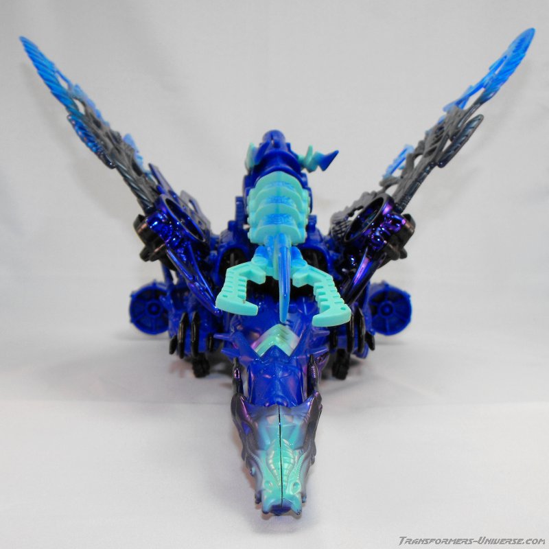 Alternativmodus: Wie die meisten Transmetals geht Cryotek gerade so als Triple Changer durch (oder vielleicht eher als Zwei-Einhalb-Changer?). Er hat einen Biestmodus, der durch geringfügige Modifikation zu einer Art Fahrzeugmodus werden kann. Fangen wir mit dem Biestmodus an. Wenig überraschend wird Cryotek zu einem Drachen. Die Transformation vom Roboter zum Drachen ist ein wenig knifflig, aber wenn man den Bogen erstmal raus hat, geht's relativ schnell. Der Drache selbst ist eine wahre Schönheit und außerdem sehr beweglich. Er kann die Flügel sowohl spreizen als auch mit den Flügeln schlagen, hat einen beweglichen Gummischwanz, voll bewegliche Beine und teilbewegliche Arme. Der Gummihals kommt natürlich auch hier zum Tragen, wenn's hier auch nicht so auffällt wie im Robotermodus. Alles in allem also ein cooler Drachenmodus. Keine Beschwerden außer auch hier der Wunsch nach einem besseren Hals.