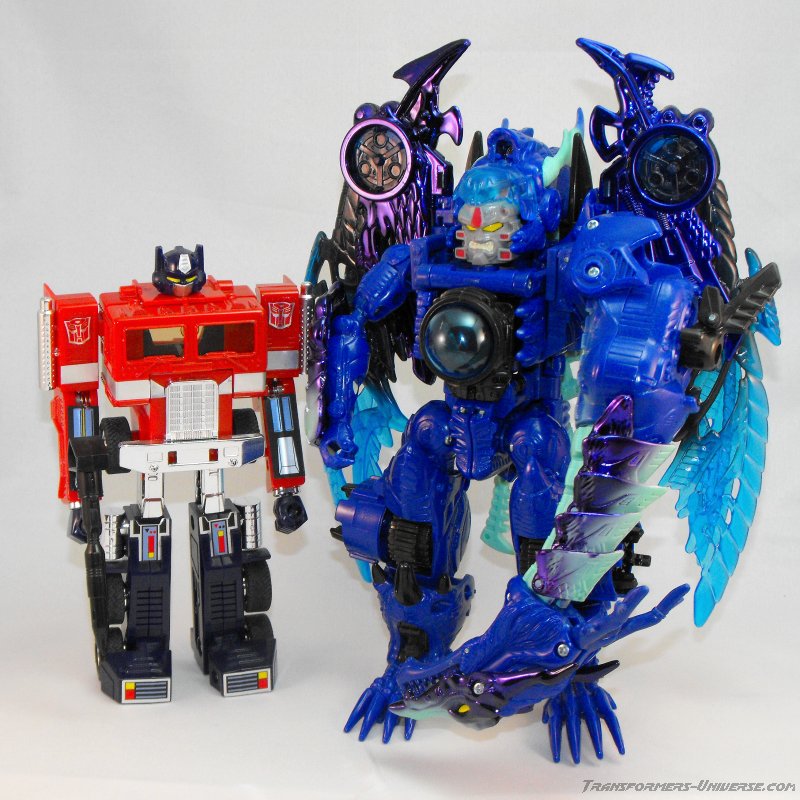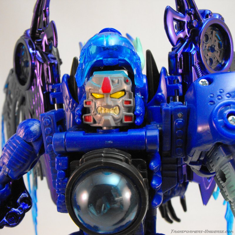 Cryoteks Geschichte in der realen Welt ist auch interessant, denn seine ersten Bilder wurden allgemein für Fakes gehalten. Man dachte es hätte jemand einfach Bilder der roten Megatron Figur per Photoshop umgestyled. Das lag auch nahe, da die ersten Cryoteks noch in der gleichen Verpackung wie Beast Wars TM2 Megatron rauskamen. Erst als die Figur dann auf einer Convention live zu sehen war, fanden die Fans den Glauben. Was die Figur selbst angeht, so muß ich sagen dass ich Cryotek, obwohl er 'nur' ein Repaint ist, doch sehr mag. Das blau bringt die tollen Details der Figur wie ich finde besser zur Geltung als Megatrons rot. Ich würde jetzt nicht so weit gehen zu sagen, dass man beide Versionen braucht, aber im direkten Vergleich liegt Cryotek bei mir eine Nasenlänge vor Megatron. Und was wäre er für eine geniale Figur, wenn er einen besseren Hals hätte...