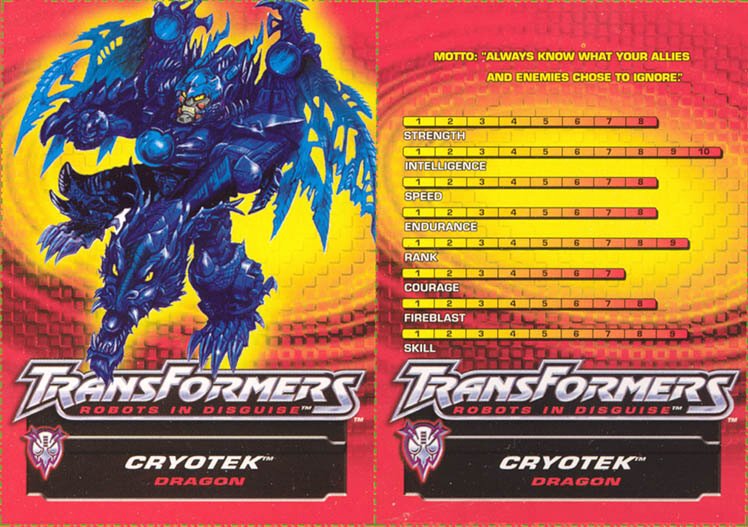 Bemerkungen: Genau wie Air Attack Optimus Primal und Megatron Megabolt ist Cryotek zwar Teil der Robots in Disguise Spielzeugreihe, gehört aber eigentlich in die Vorgängerserie Beast Machines. Und obwohl er weder in der einen noch der anderen TV Serie auftauchte, wurde Cryotek rückwirkend in das Beast Wars / Beast Machines Universum eingefügt, nämlich durch die Universe Comicreihe von 3H Productions. Er war der Hauptbösewicht in der Universe: Wreckers Reihe, der Mentor von Beast Wars Megatron, half den Quintessons bei einer Invasion von Cybertron und brachte beinahe die Macht von Primus in seine Gewalt. Da die 3H Productions Comics aufgrund der Firmenpleite nie vollendet wurden, kann man die komplette Story nur in der Text-Story "Wreckers: Finale" nachlesen, exklusiv für Mitglieder des Transformers Collectors Club erhältlich.