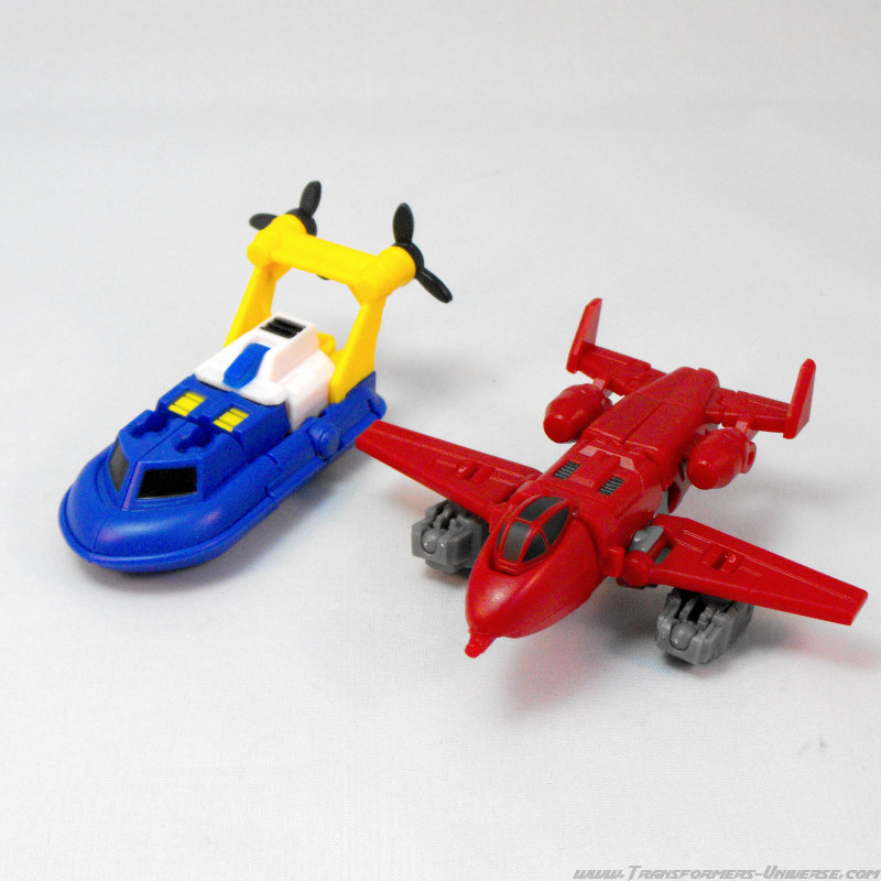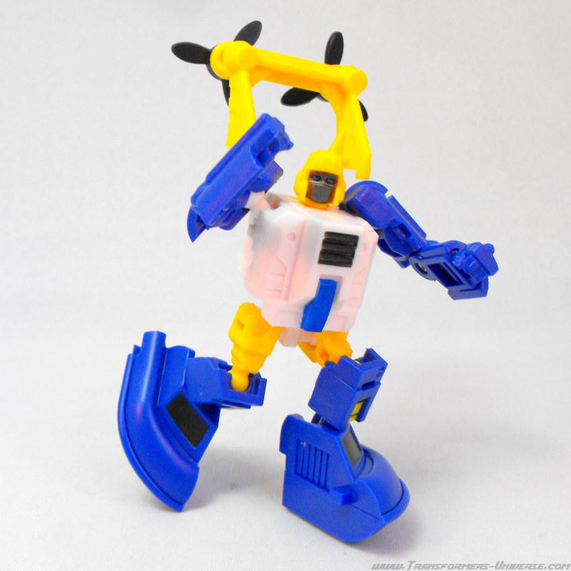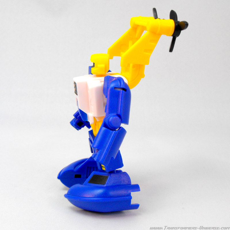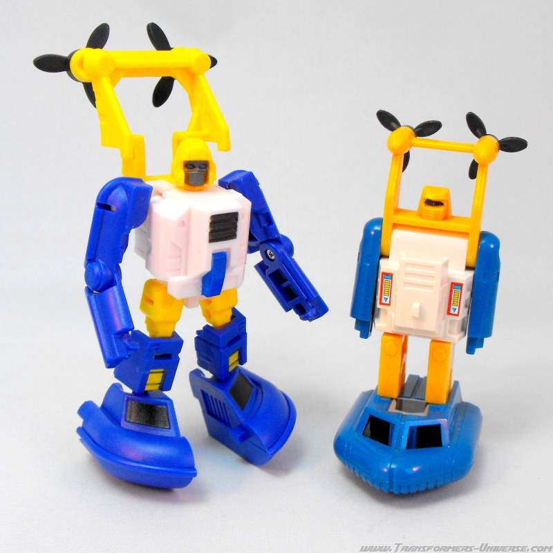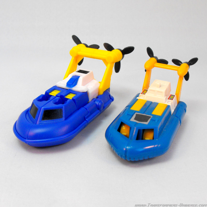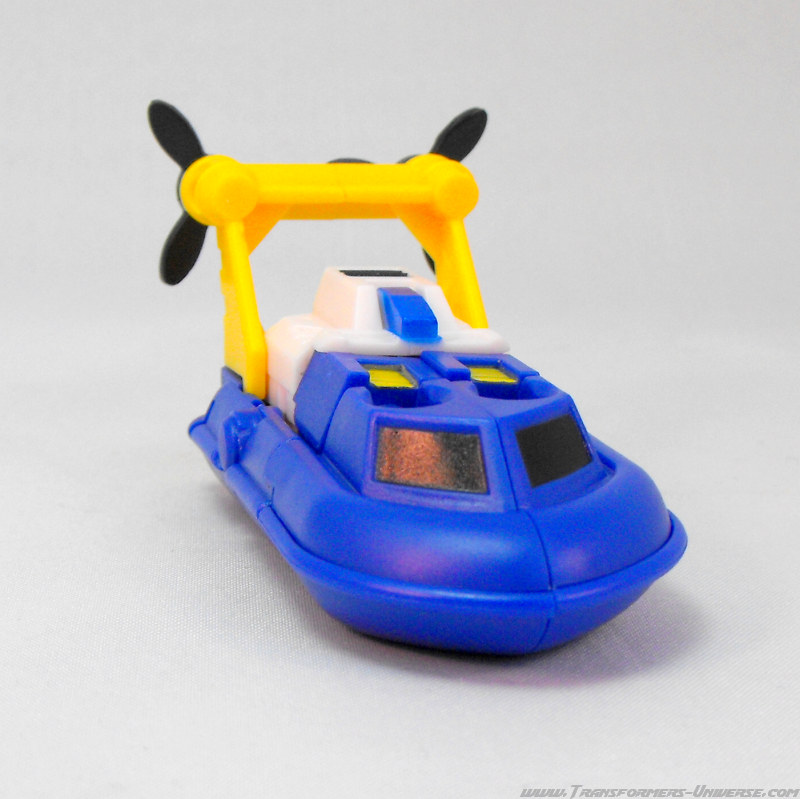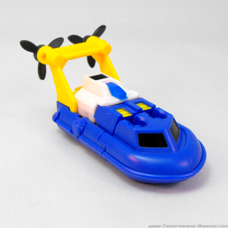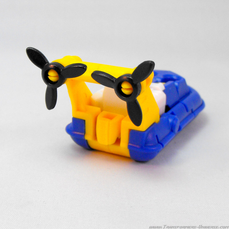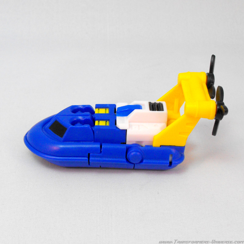 Alternativmodus: Hover verwandelt sich in das gleiche blau-weiß-gelbe Schwebeboot wie G1 Seaspray. Die zwei Schiffe sind beinahe identisch, nur ist Hover auch hier einen Tick größer. Die Detaillierung ist allerdings hier fast ein wenig schwächer als beim G1 Vorgänger, aber auch hier sind die Unterschiede wirklich minimal. Es bleibt also ein blau-weiß-gelbes Schwebeboot mit drehbaren Propellern hinten dran. Das war's, mehr gibt's nicht zu schreiben.
