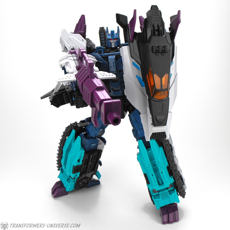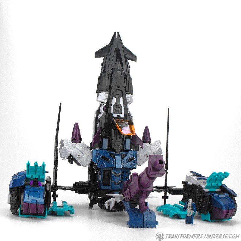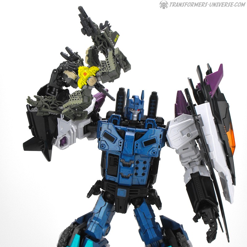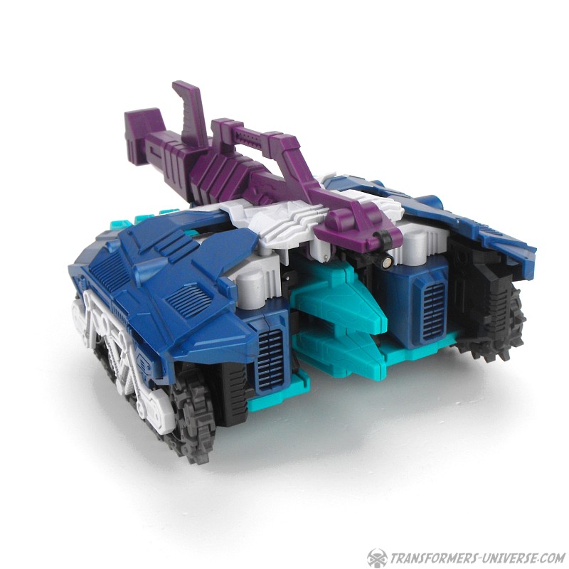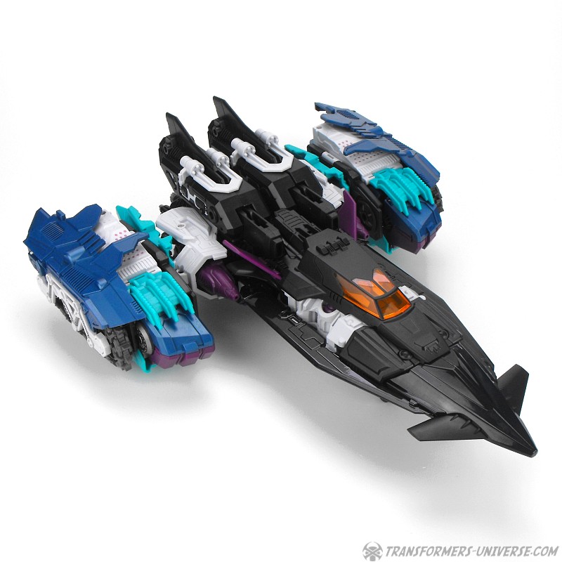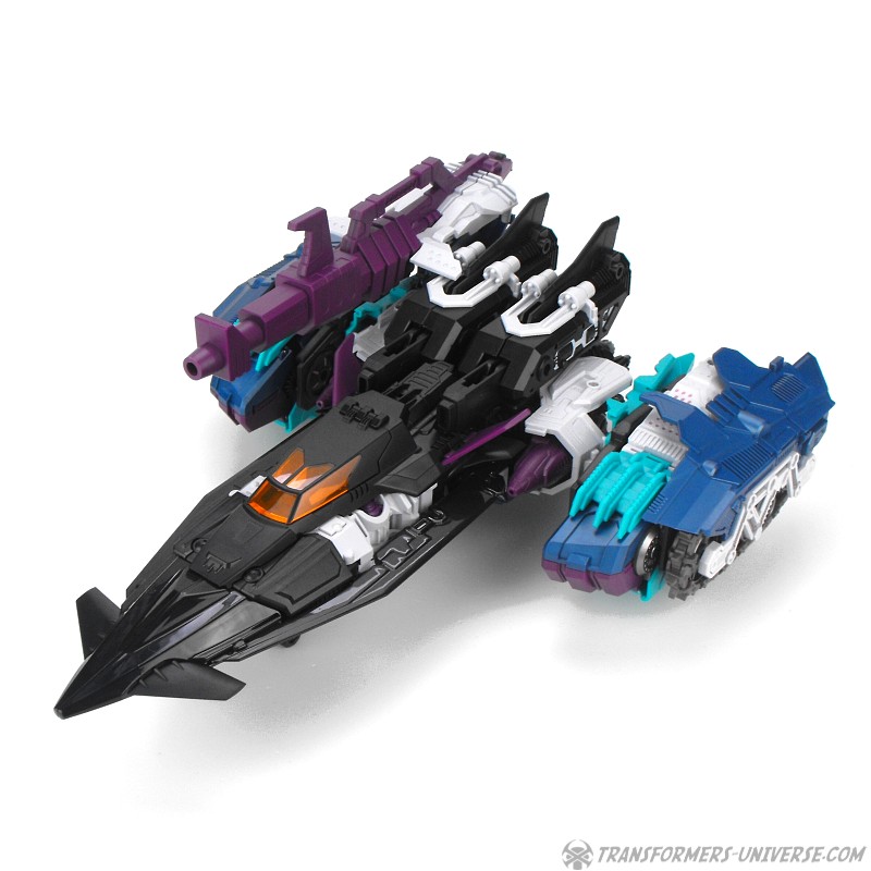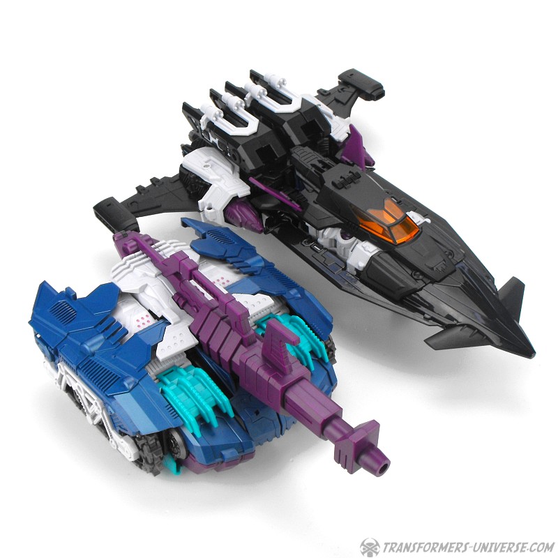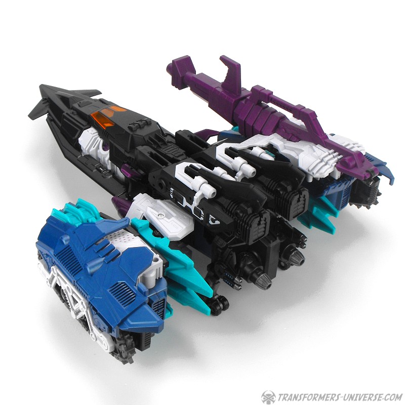 Anders als G1 Overlord kann Carnifex seine beiden Fahrzeug-Komponenten zu einem größeren Fahrzeug kombinieren, was die alte Frage beantwortet, wie er es schafft seine Beine mitzunehmen, wenn er als Jet wohin fliegt. Im Prinzip teilt man den Panzer einfach in zwei Teile, die dann seitlich am Jet andocken. Ergebnis ist ein wesentlich größerer (und weniger aerodynamischer) Jet, an den man außerdem noch das große Gewehr anbringen kann, um den Superjet Feuerkraft zu geben. Somit ist sichergestellt dass Carnifex seinen gesamten Körper auf Reisen dabei hat. Schön gemacht und eine nette Option.