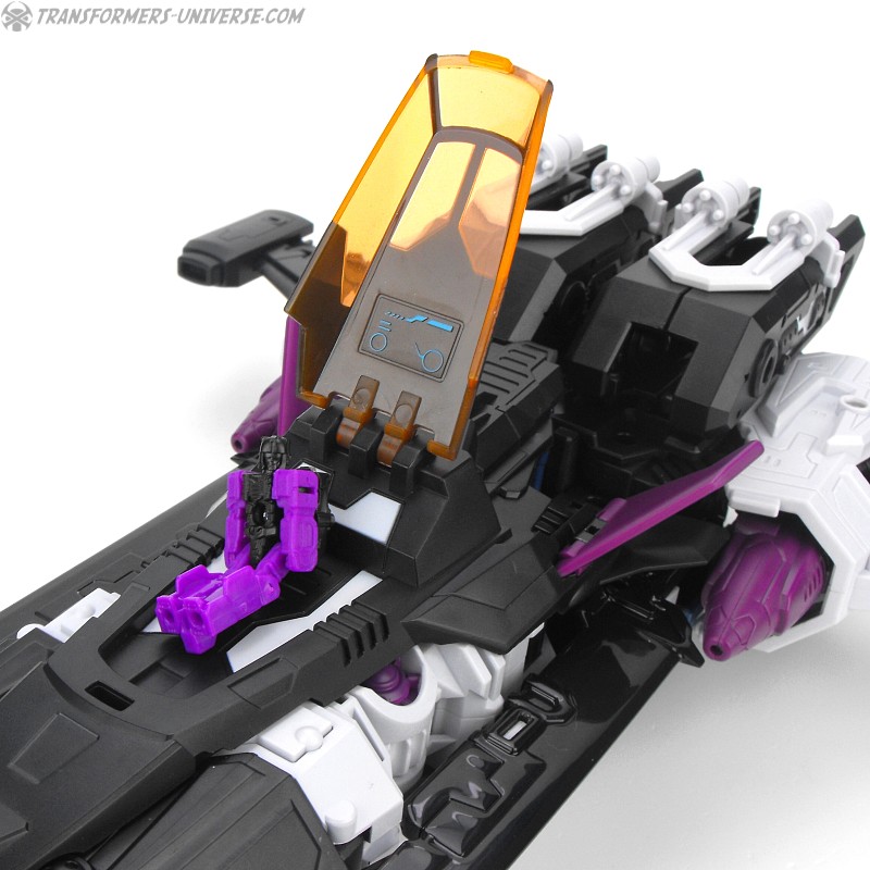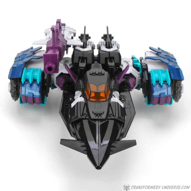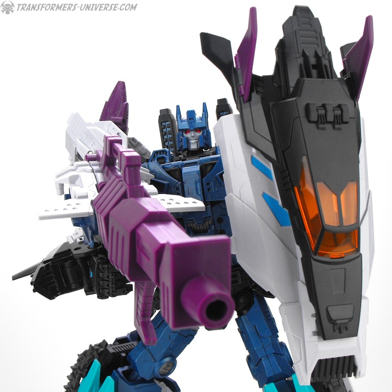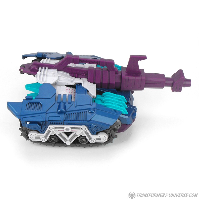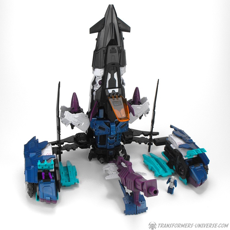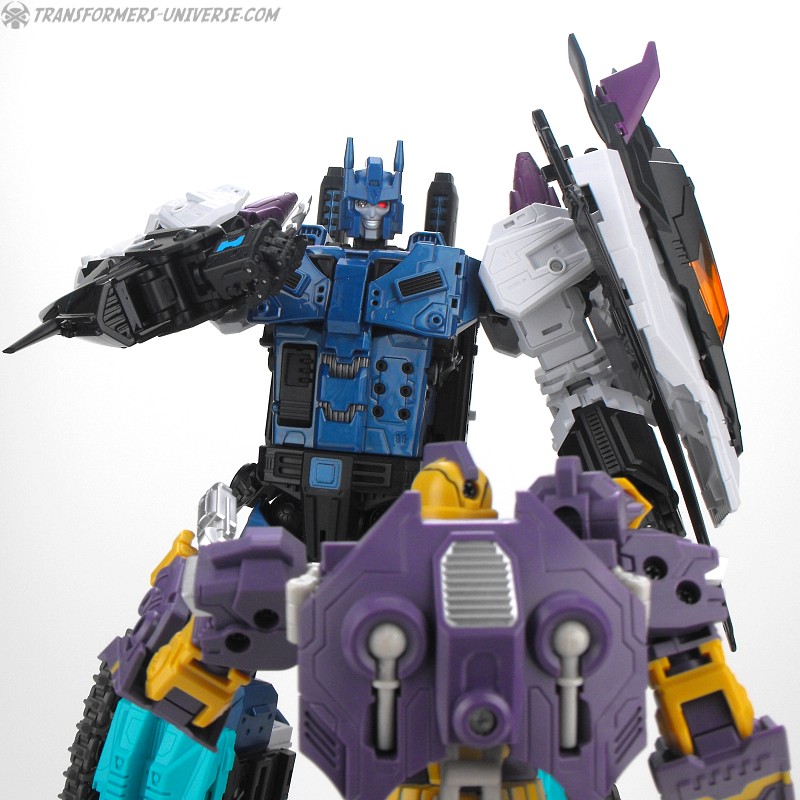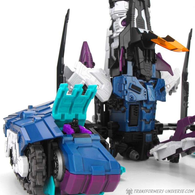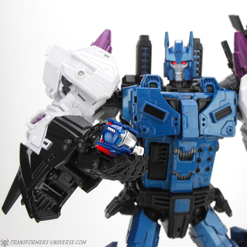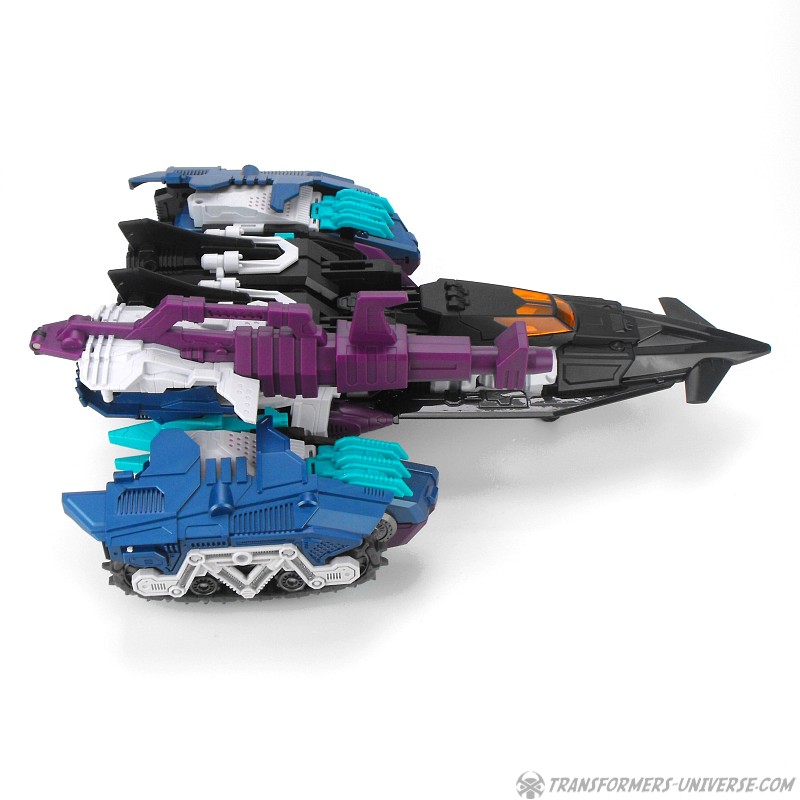 Anders als G1 Overlord kann Carnifex seine beiden Fahrzeug-Komponenten zu einem größeren Fahrzeug kombinieren, was die alte Frage beantwortet, wie er es schafft seine Beine mitzunehmen, wenn er als Jet wohin fliegt. Im Prinzip teilt man den Panzer einfach in zwei Teile, die dann seitlich am Jet andocken. Ergebnis ist ein wesentlich größerer (und weniger aerodynamischer) Jet, an den man außerdem noch das große Gewehr anbringen kann, um den Superjet Feuerkraft zu geben. Somit ist sichergestellt dass Carnifex seinen gesamten Körper auf Reisen dabei hat. Schön gemacht und eine nette Option.