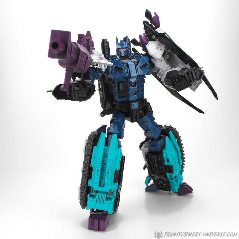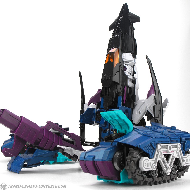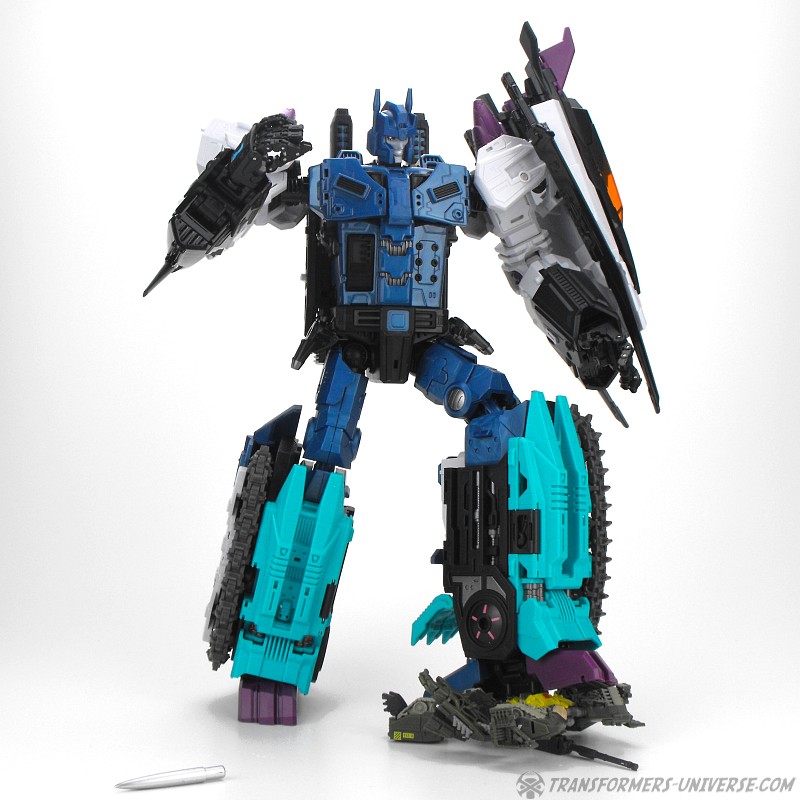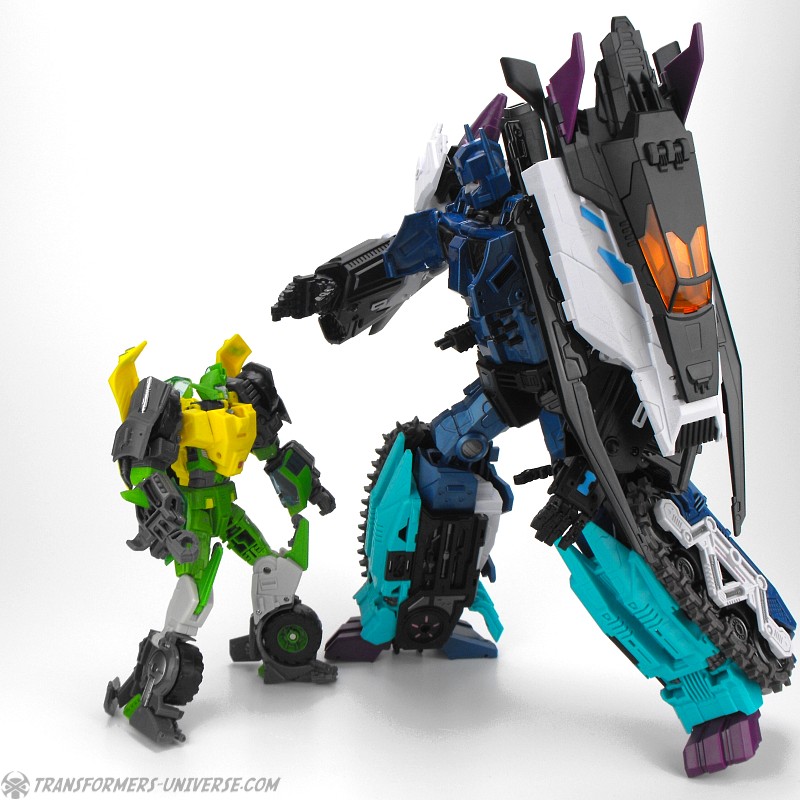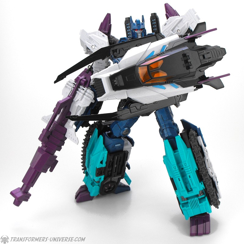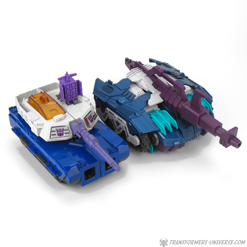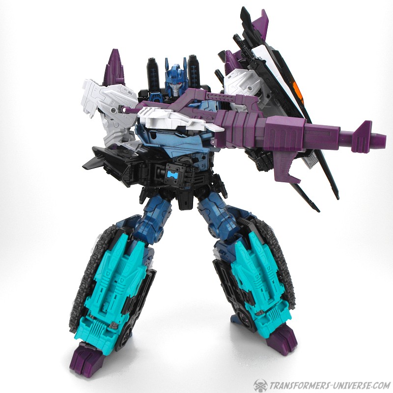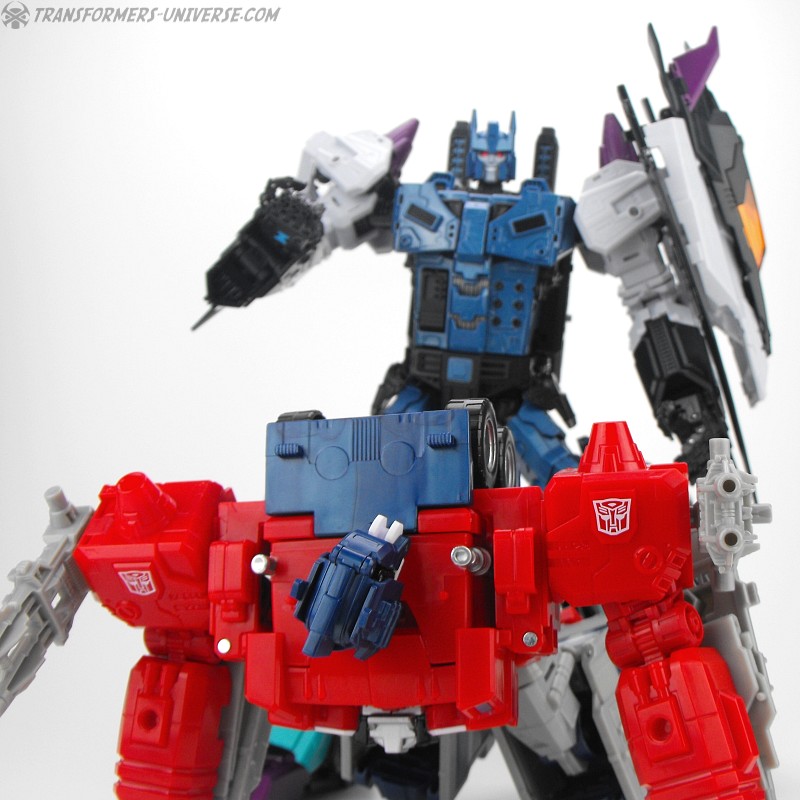 Anders als G1 Overlord kann Carnifex seine beiden Fahrzeug-Komponenten zu einem größeren Fahrzeug kombinieren, was die alte Frage beantwortet, wie er es schafft seine Beine mitzunehmen, wenn er als Jet wohin fliegt. Im Prinzip teilt man den Panzer einfach in zwei Teile, die dann seitlich am Jet andocken. Ergebnis ist ein wesentlich größerer (und weniger aerodynamischer) Jet, an den man außerdem noch das große Gewehr anbringen kann, um den Superjet Feuerkraft zu geben. Somit ist sichergestellt dass Carnifex seinen gesamten Körper auf Reisen dabei hat. Schön gemacht und eine nette Option.