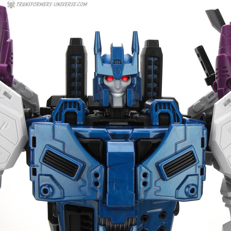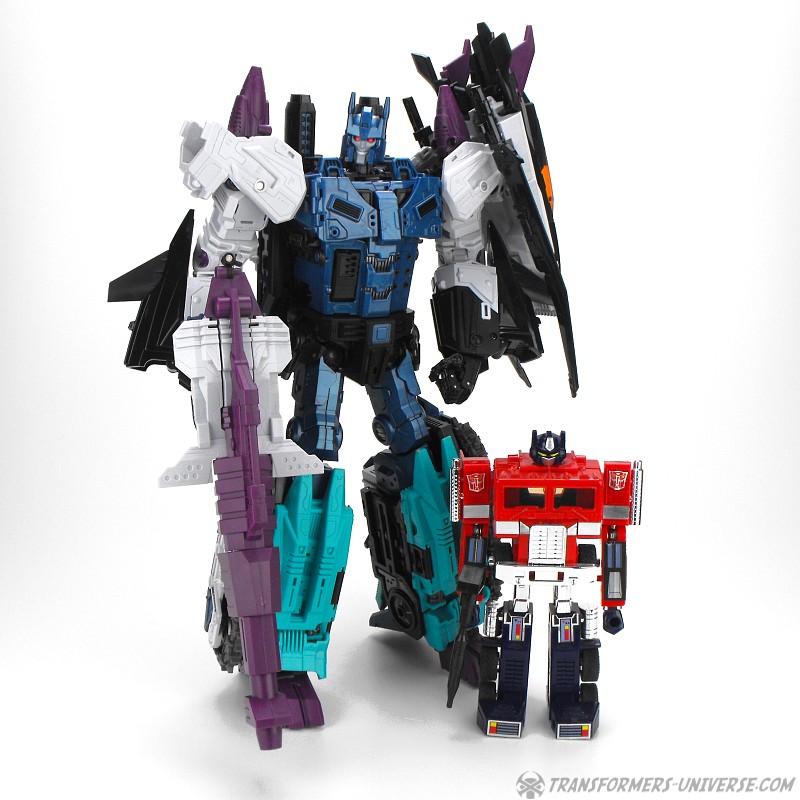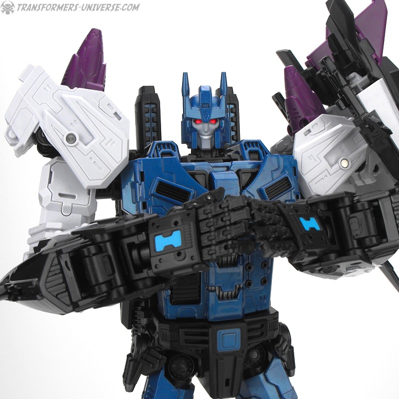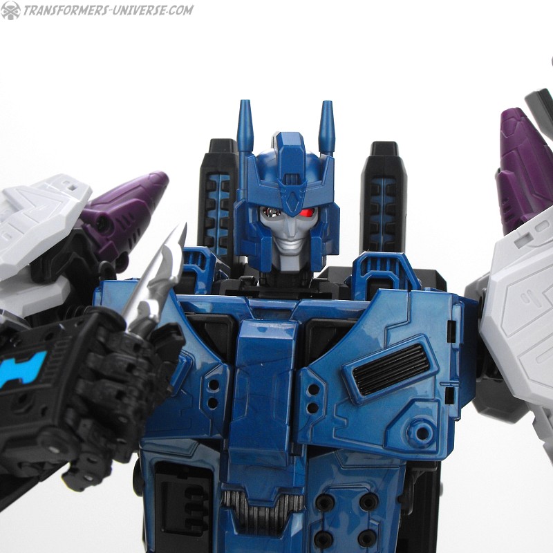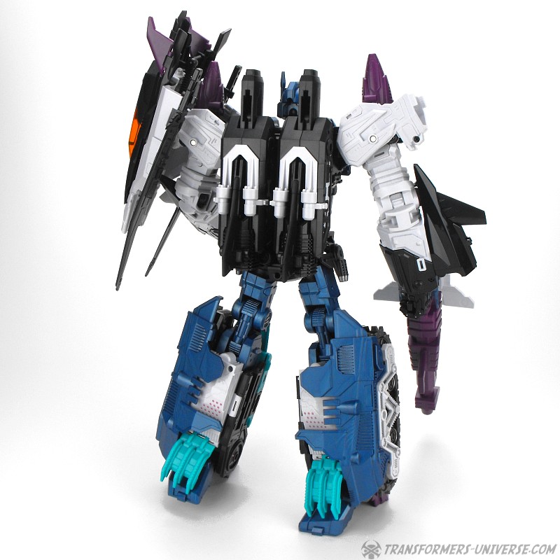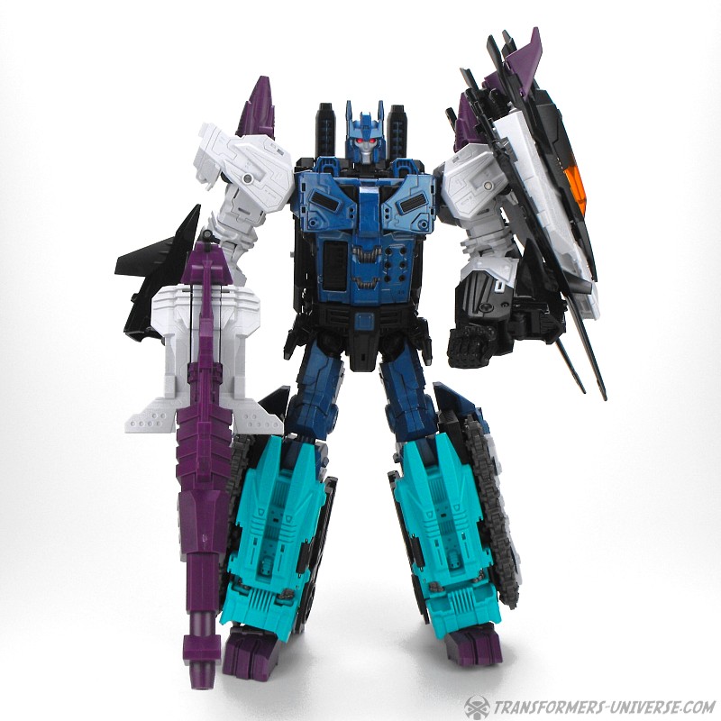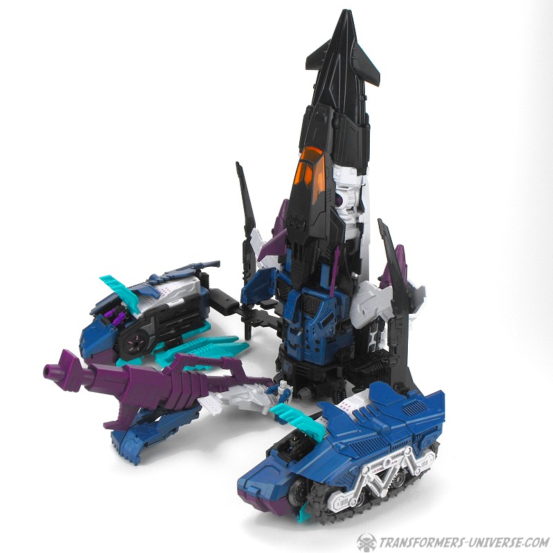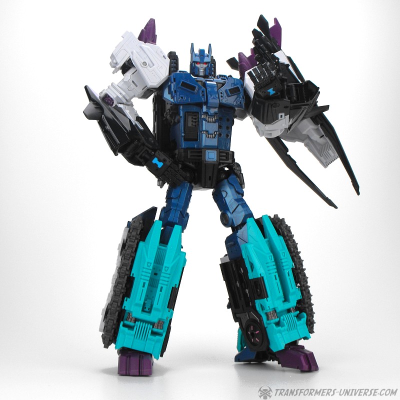 Anders als G1 Overlord kann Carnifex seine beiden Fahrzeug-Komponenten zu einem größeren Fahrzeug kombinieren, was die alte Frage beantwortet, wie er es schafft seine Beine mitzunehmen, wenn er als Jet wohin fliegt. Im Prinzip teilt man den Panzer einfach in zwei Teile, die dann seitlich am Jet andocken. Ergebnis ist ein wesentlich größerer (und weniger aerodynamischer) Jet, an den man außerdem noch das große Gewehr anbringen kann, um den Superjet Feuerkraft zu geben. Somit ist sichergestellt dass Carnifex seinen gesamten Körper auf Reisen dabei hat. Schön gemacht und eine nette Option.