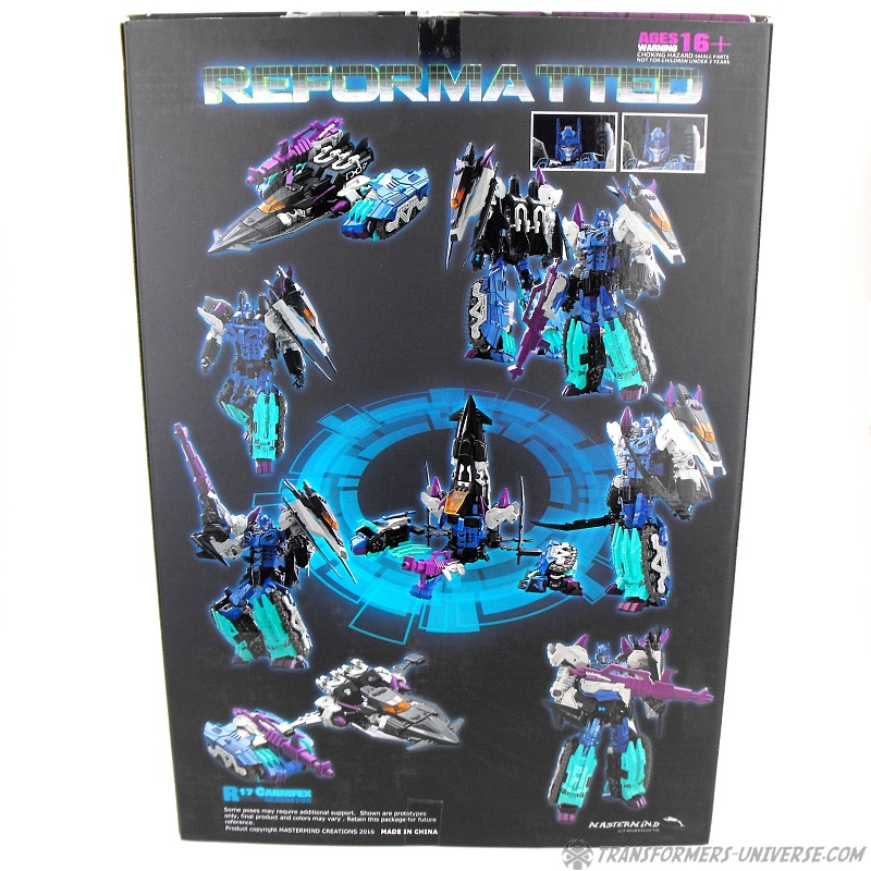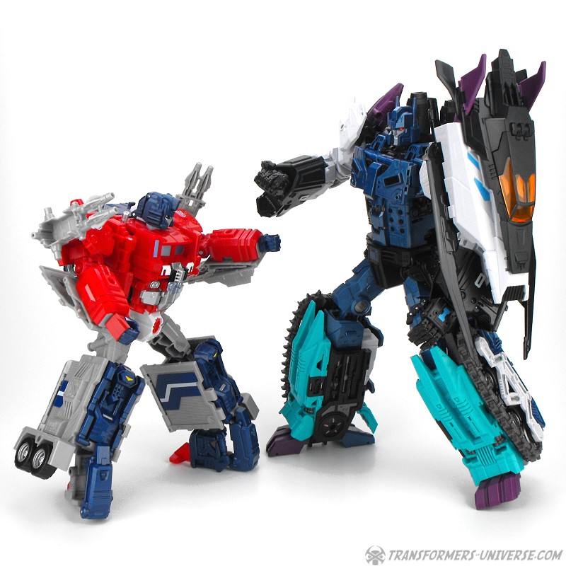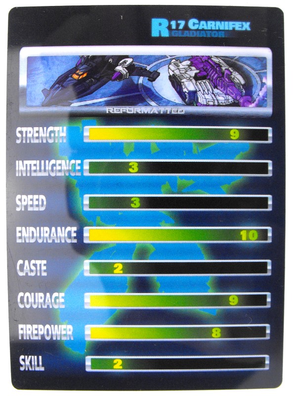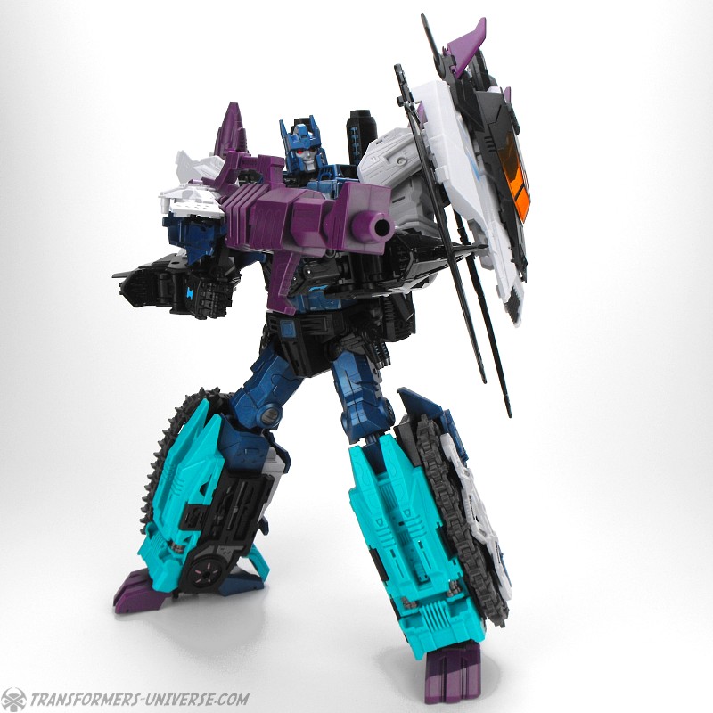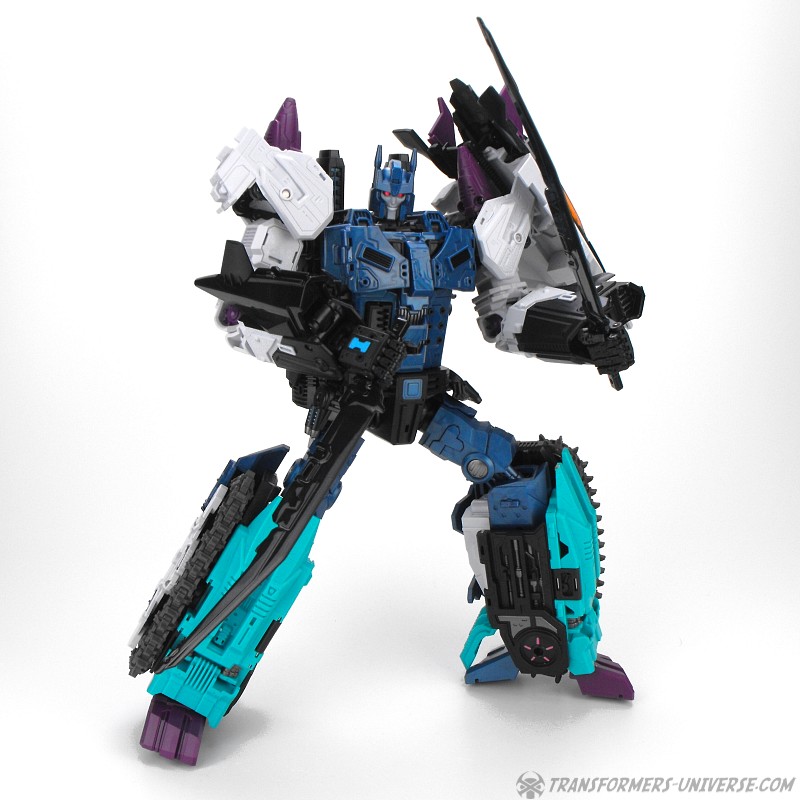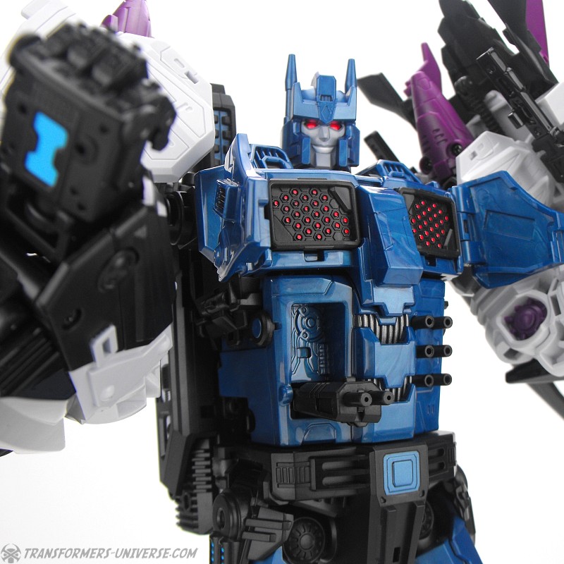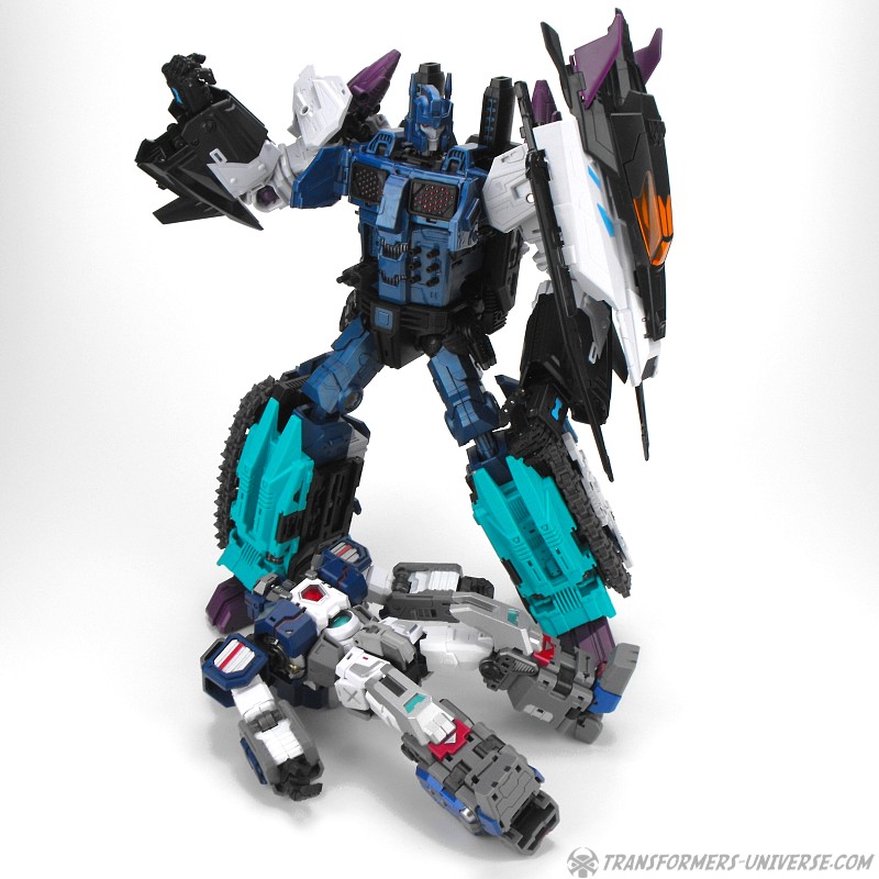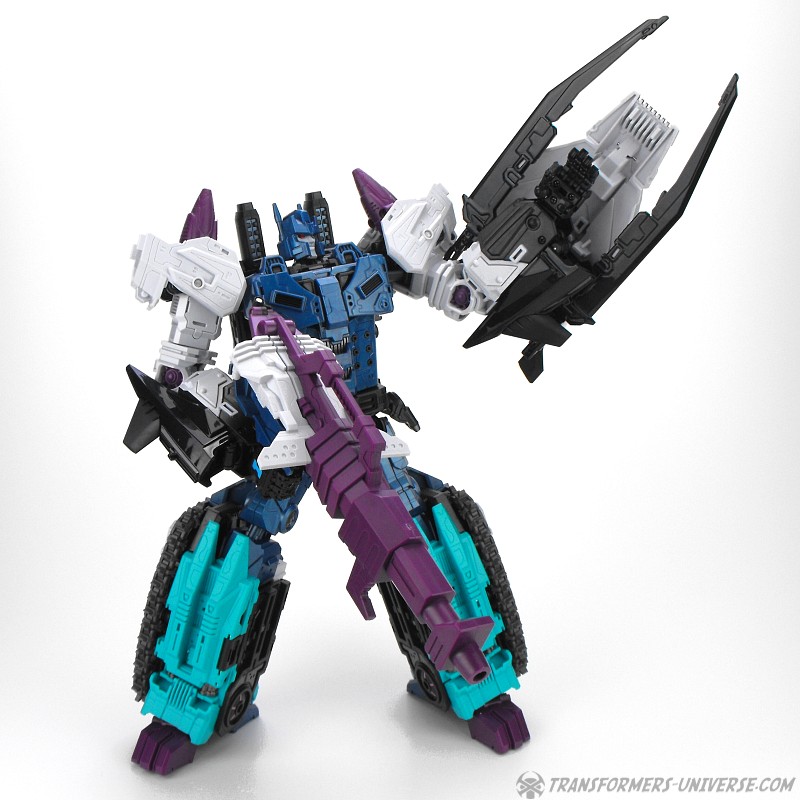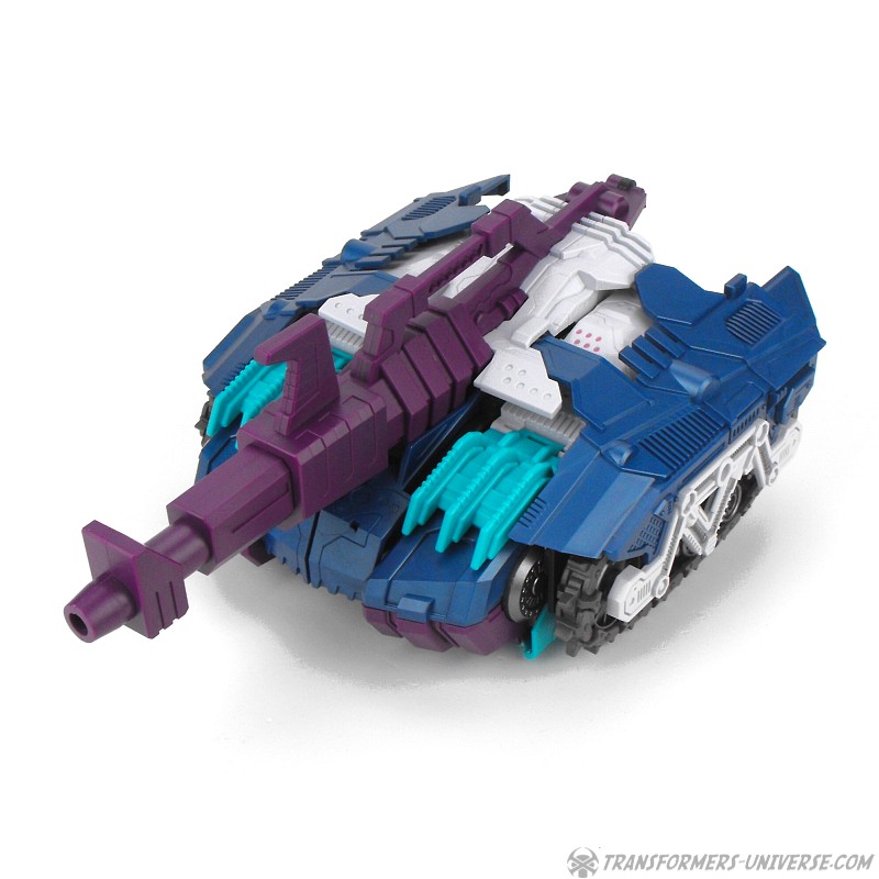 Anders als G1 Overlord kann Carnifex seine beiden Fahrzeug-Komponenten zu einem größeren Fahrzeug kombinieren, was die alte Frage beantwortet, wie er es schafft seine Beine mitzunehmen, wenn er als Jet wohin fliegt. Im Prinzip teilt man den Panzer einfach in zwei Teile, die dann seitlich am Jet andocken. Ergebnis ist ein wesentlich größerer (und weniger aerodynamischer) Jet, an den man außerdem noch das große Gewehr anbringen kann, um den Superjet Feuerkraft zu geben. Somit ist sichergestellt dass Carnifex seinen gesamten Körper auf Reisen dabei hat. Schön gemacht und eine nette Option.