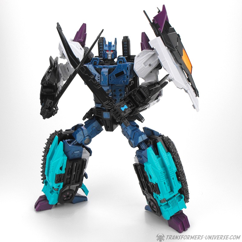 Robotermodus: Carnifex ist ein wahrer Riese, deutlich über Leader-Klasse Größe, beinahe so groß (wenn auch nicht ganz) wie sein G1 Vorgänger. Natürlich ist er deutlich beweglicher und hat so ziemlich jedes denkbare Gelenk, bis hin zu einzeln beweglichen Fingern (was ein sehr schönes böses-Finger-Verschränken ermöglicht). Seine Füße sind groß genug um ihm einen stabilen Stand zu geben. Das einzig leicht instabile ist die Flugdrohne an seiner Schulter, wo man bei Armbewegungen etwas vorsichtig sein muss, damit sie nicht abgeht.