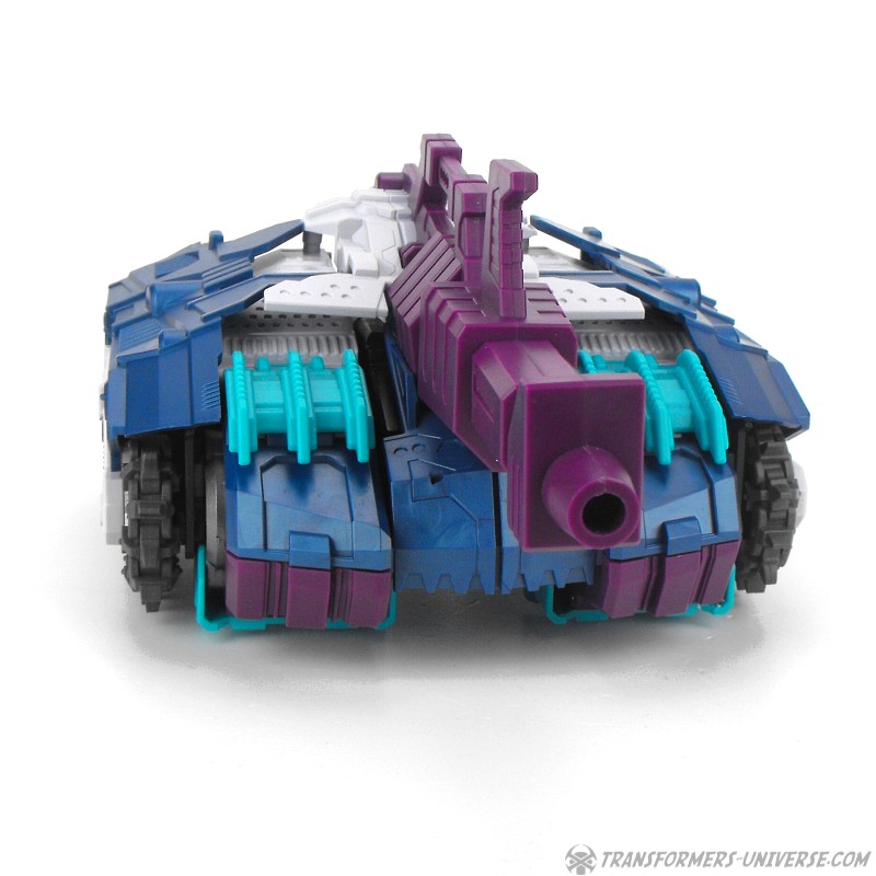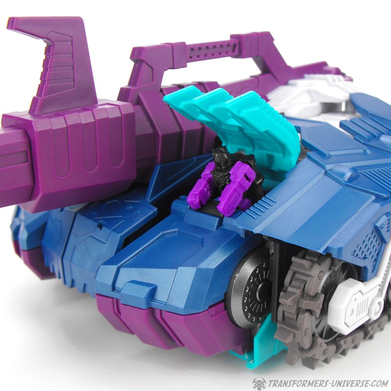 Alternativmodi: Rein technisch gesehen ist Carnifex ein Duocon, also zwei Fahrzeuge die zu einem Roboter werden. Sein Unterkörper wird zu einem Panzer, der Oberkörper zu einem Jet. Die Fahrzeuge von G1 Overlord waren noch ganz klar irdischen Urpsrungs, aber Carnifex geht mehr in den Science Fiction Sektor und gibt uns cybertronische Fahrzeuge. Das kleinere der beiden ist der Panzer, der auch Carnifex‘ großes Gewehr als Geschütz mit einbaut. Der Panzer hat funktionsfähige Panzerketten und so eine Art Cockpit, wo man eine Titan Master Figur reinsetzen kann. Viel mehr kann ich über den Panzer kaum schreiben. Klar als das erkennbar was er sein soll, schön gemacht.