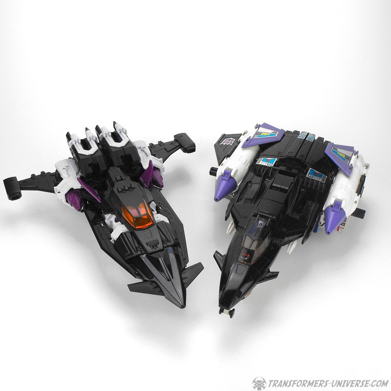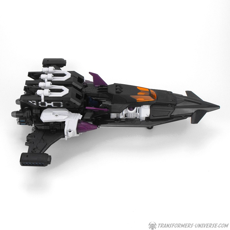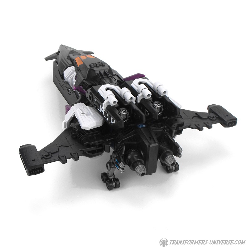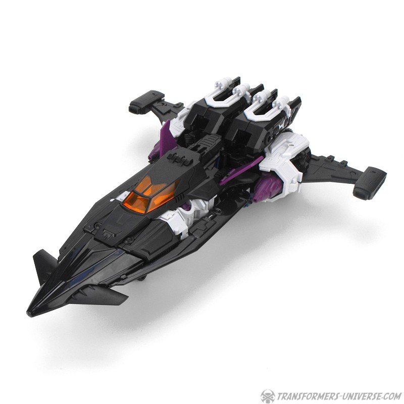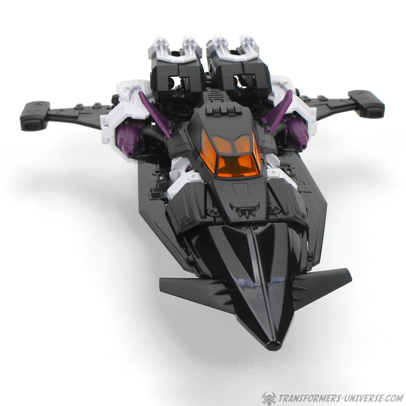 Carnifex‘ Oberkörper wird zu einem Jet. G1 Overlord hatte hier meinen absoluten Lieblingsjet als Vorlage, den SR-71 Blackbird. Carnifex geht auch hier mehr in den Science Fiction Bereich, aber der entstehende Jet hat immer noch so einige Elemente des Blackbird. Eingebaut sind ein Fahrgestell und ein sich öffnendes Cockpit, wobei die Titan Master Figur hier nur dann reinpasst, wenn sie flach auf dem Bauch liegt. Auch hier, ein sehr gelungener Jetmodus.