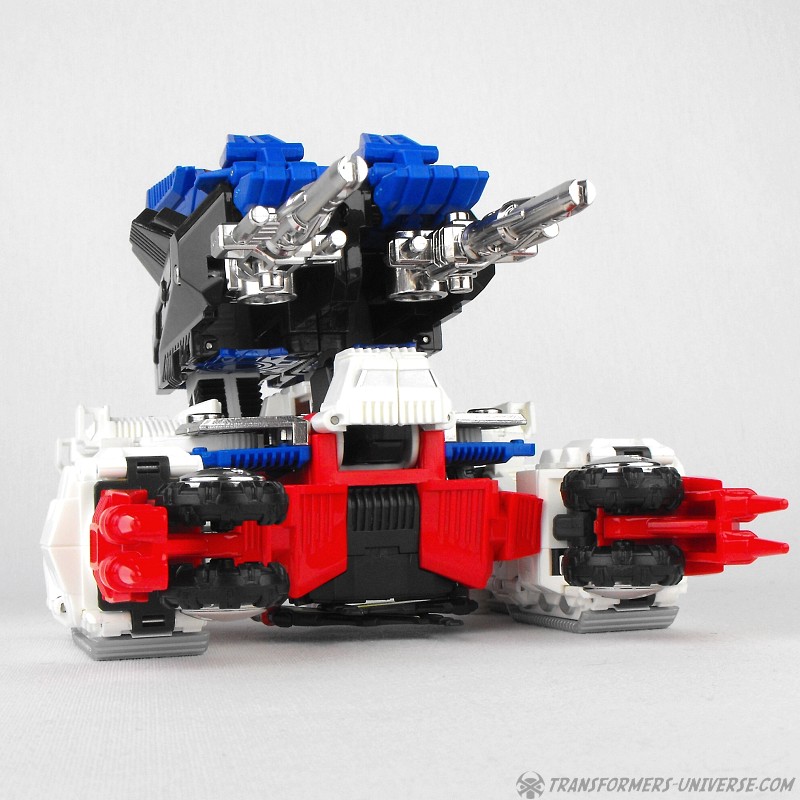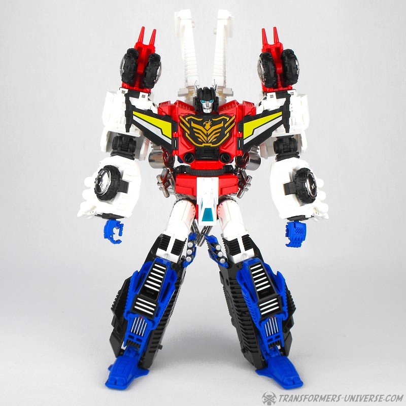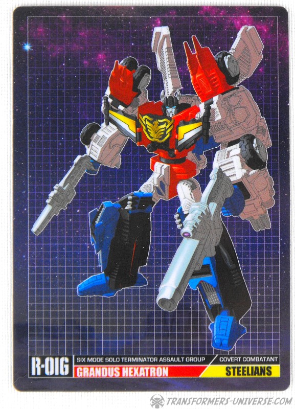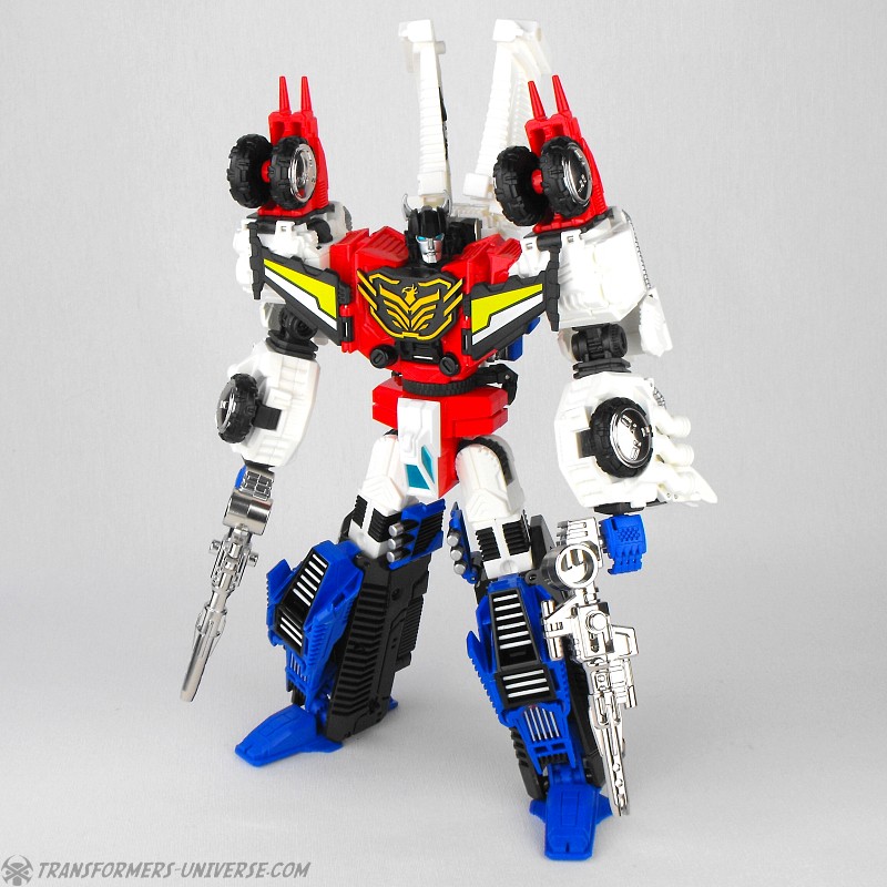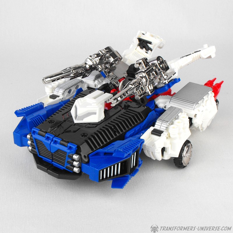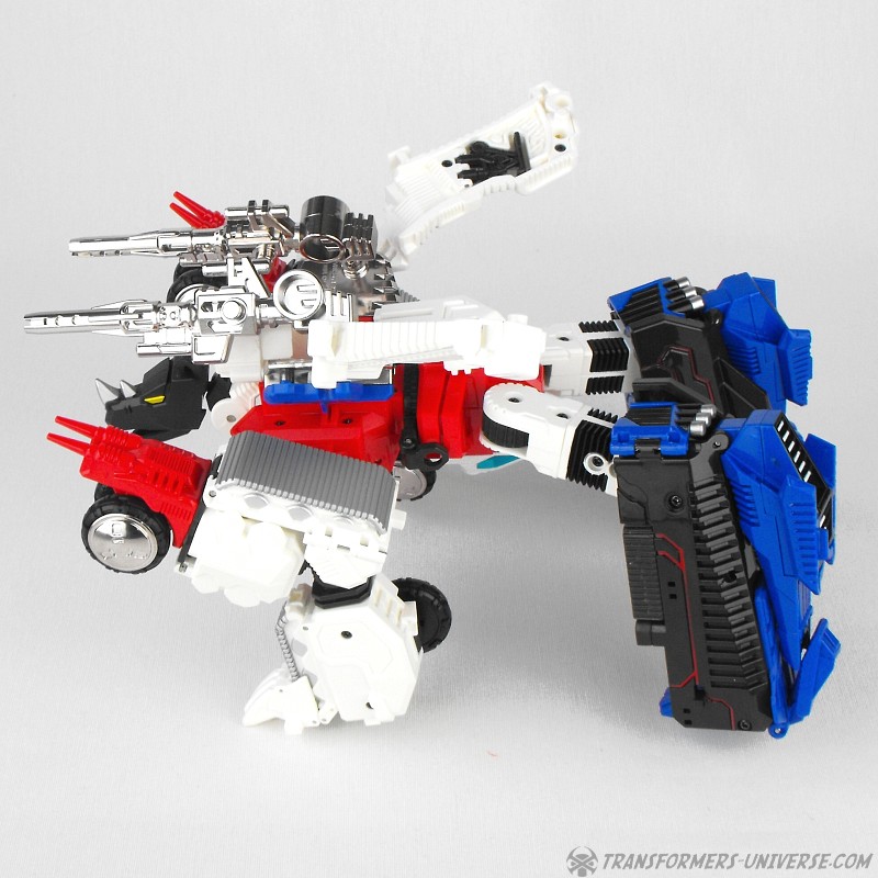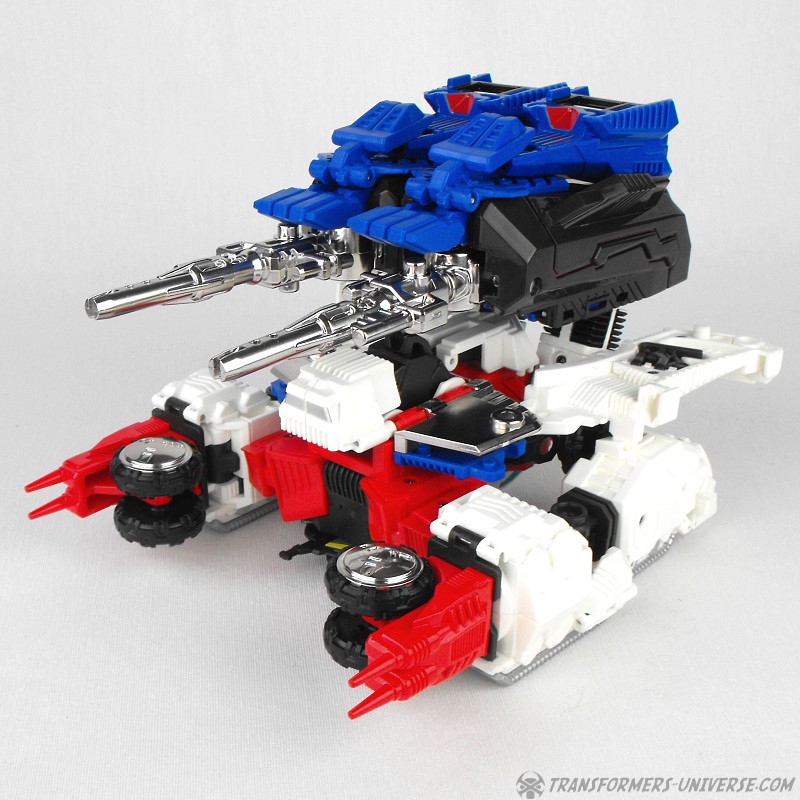 Robotermous: Grandus Hexatron ist ein ziemlich großer Roboter, so etwa Ultra-Klasse, und sieht einfach genial aus. Der rot-weiß-blaue Anstrich zeigt klar dass er einer von den Guten sein soll und er ist eine so ziemlich 100 Prozent vorbildgetreue Abbildung des Charakters aus der japanischen Victory Serie, sowie der G1 Figur. Natürlich deutlich beweglicher aus die G1 Figur und auch besser detailliert, aber ganz eindeutig der gleiche Charakter. Hörner am Kopf, passt. Goldenes Symbol auf schwarzer Brustplatte, passt. Rote doppelläufige Kanonen als Schulterstücke, passt. Ganz klar, das hier ist Greatshot, schön gemacht.