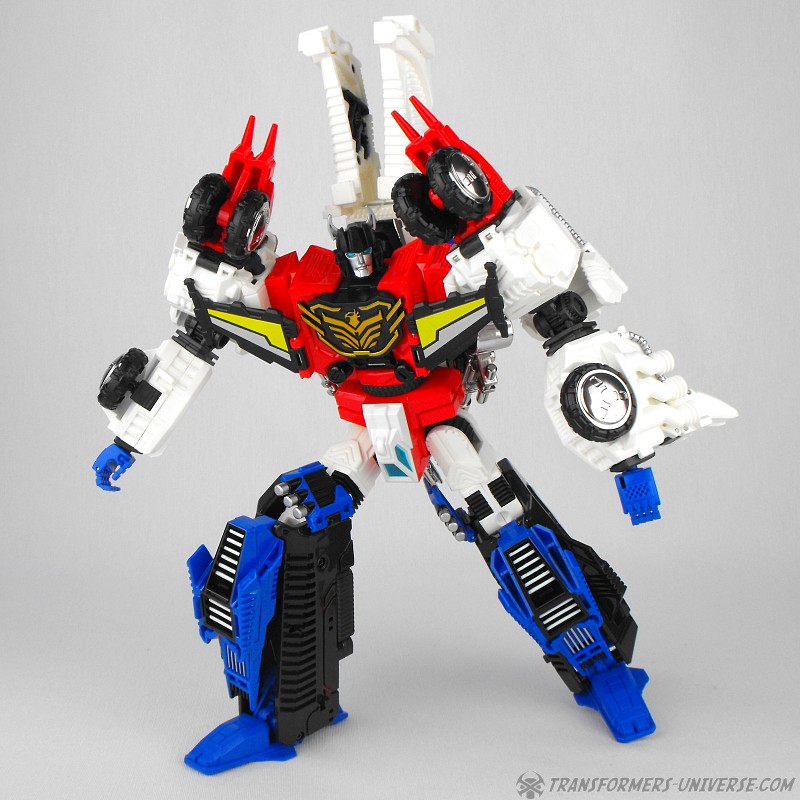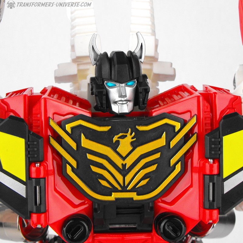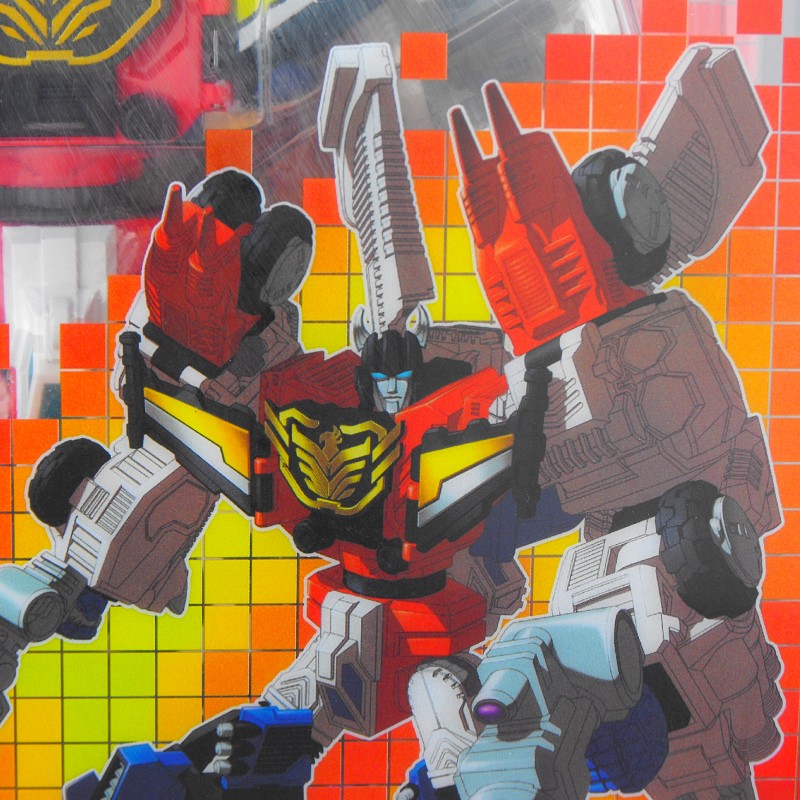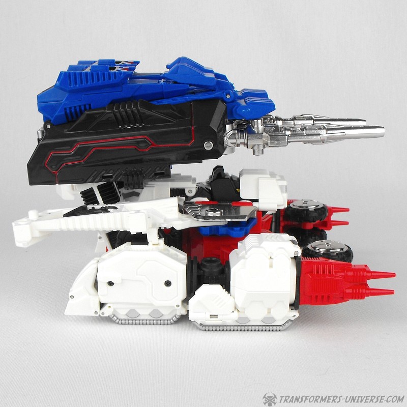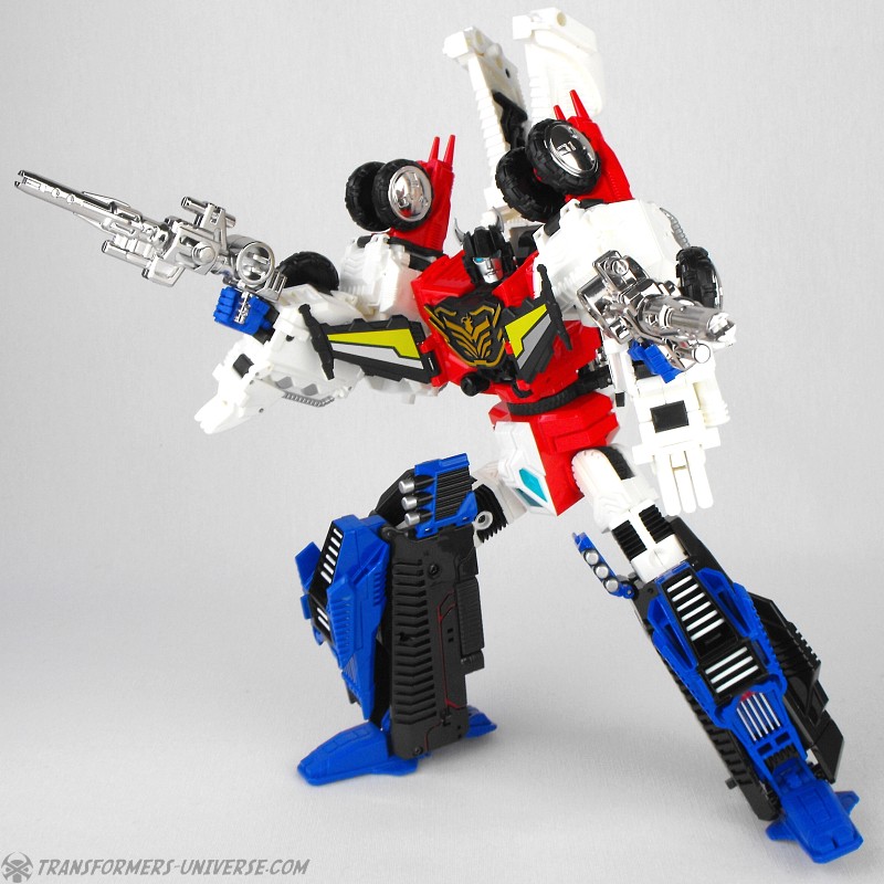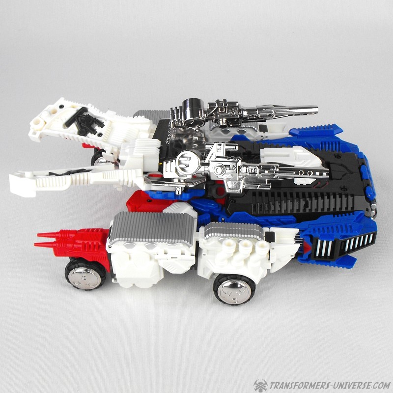 Robotermous: Grandus Hexatron ist ein ziemlich großer Roboter, so etwa Ultra-Klasse, und sieht einfach genial aus. Der rot-weiß-blaue Anstrich zeigt klar dass er einer von den Guten sein soll und er ist eine so ziemlich 100 Prozent vorbildgetreue Abbildung des Charakters aus der japanischen Victory Serie, sowie der G1 Figur. Natürlich deutlich beweglicher aus die G1 Figur und auch besser detailliert, aber ganz eindeutig der gleiche Charakter. Hörner am Kopf, passt. Goldenes Symbol auf schwarzer Brustplatte, passt. Rote doppelläufige Kanonen als Schulterstücke, passt. Ganz klar, das hier ist Greatshot, schön gemacht.