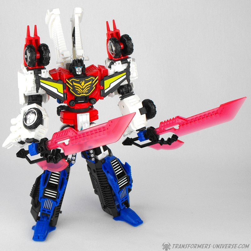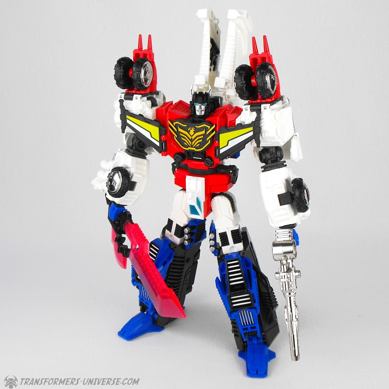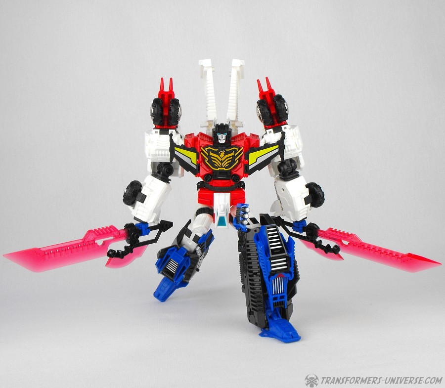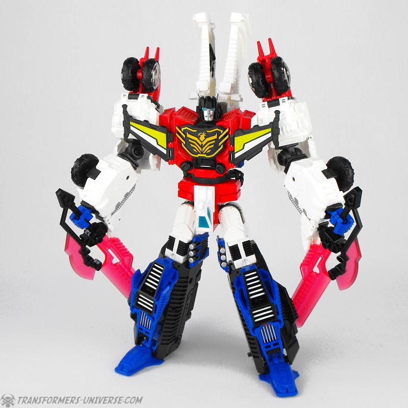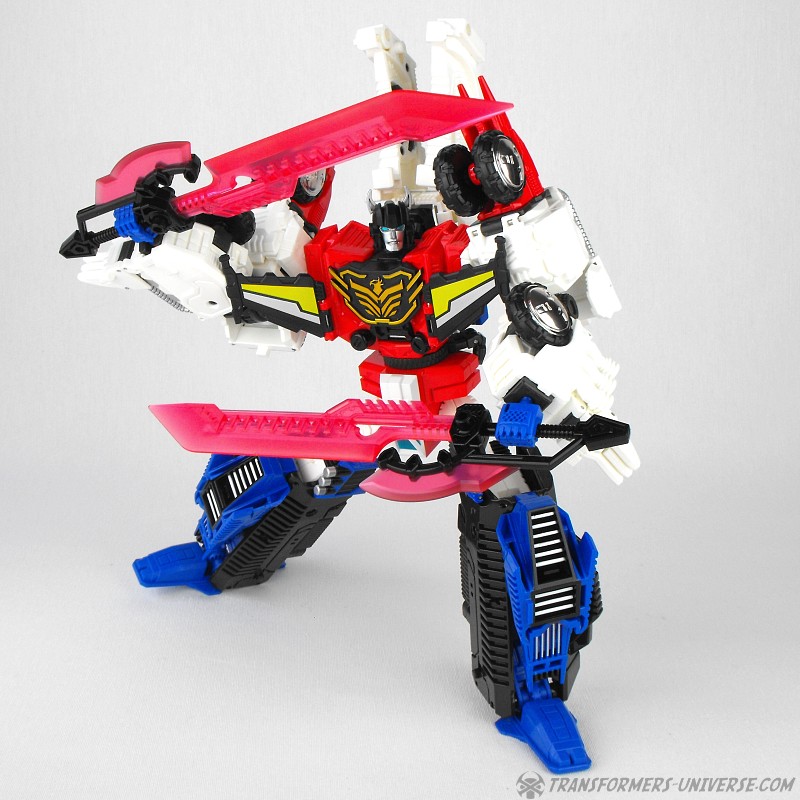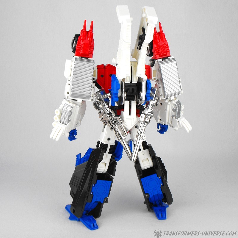 Hommage hin oder her, Grandus ist ein gut designter, cool aussehender Roboter. Die Hände sind für meinen Geschmack etwas klein, aber ansonsten passt alles wunderbar zusammen. Die Beine sind teilweise aus Metall, was ihm einen soliden, festen Stand gibt. Waffentechnisch hat er zwei verchromte Gewehre dabei, sowie zwei riesige, verschnörkelte Schwerter. Außerdem hat er zwei bewegliche Halterungen an der Hüfte, wo er die Gewehre oder die Schwerter (oder halt von jedem eins) befestigen kann, wenn er die Hände freihaben will. Schließlich kann man noch den gehörnten Helm abnehmen, wenn man will, was dann einen sehr, sehr kleinen Kopf freilegt.