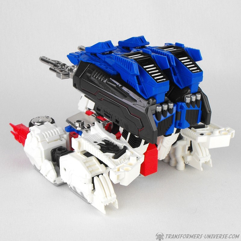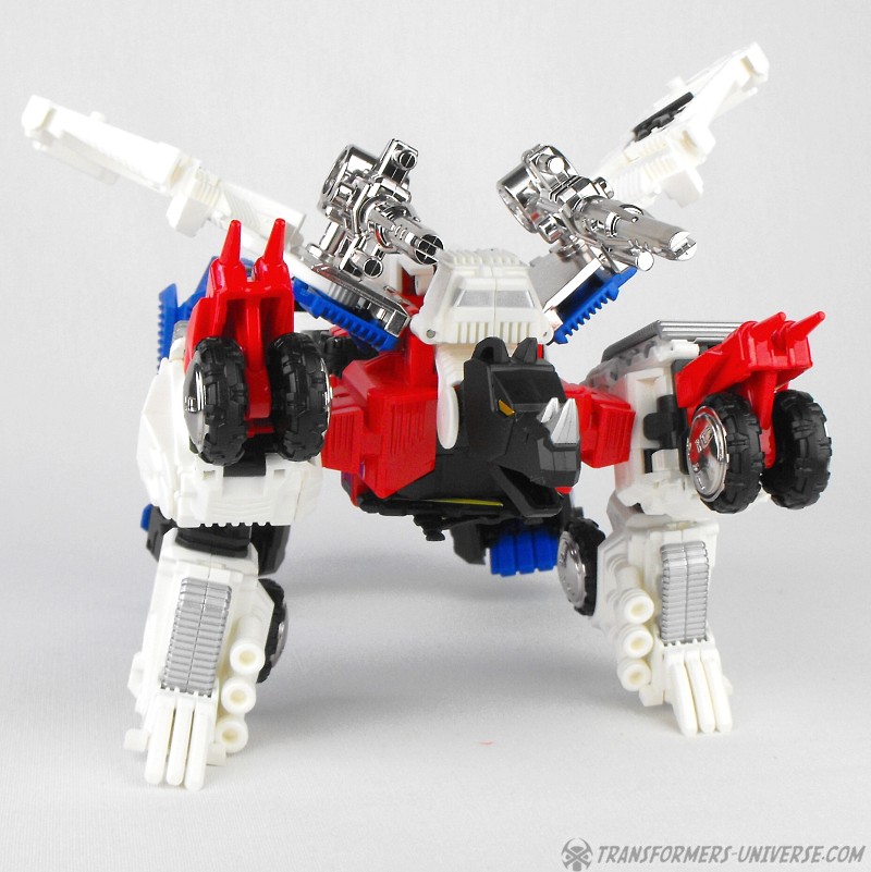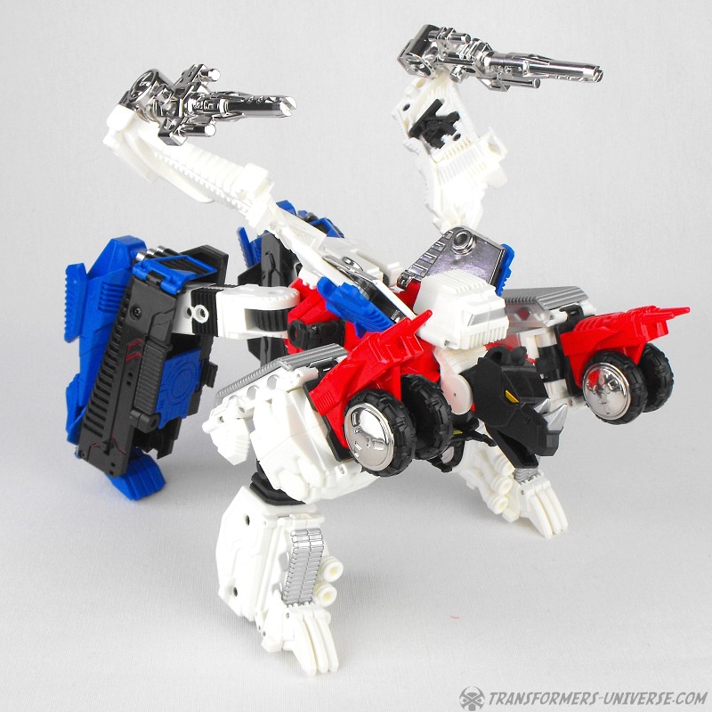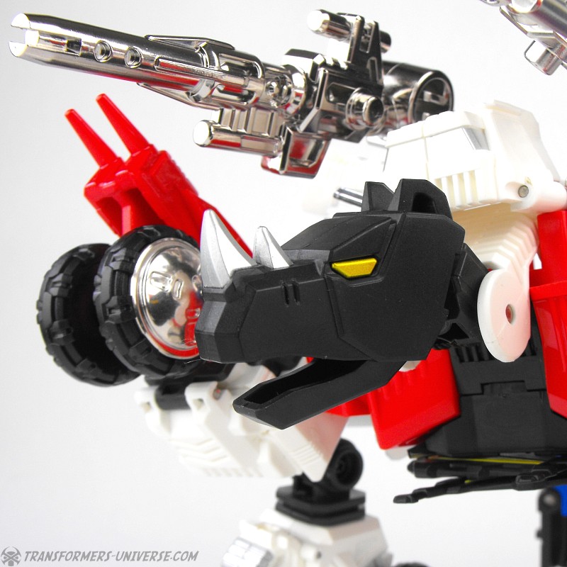 Alternativmodi: Als Sixchanger hat Grandus fünf weitere Modi zu seinem Robotermodus. Gehen wir sie mal in der gleichen Reihenfolge wie bei den Bildern durch. Als erstes kommt das Nashorn. Die Anleitung bezeichnet es als geflügelten Wolf, aber hier wurde denke ich einfach vergessen die Bezeichnung von Terminus Hexatron zu ändern (siehe die Bemerkungen). Im Prinzip ist es einfach der Roboter auf allen Vieren, der den Roboterkopf gegen einen Tierkopf austauscht. Sieht jetzt nicht schlecht aus, aber eben nicht mehr als ein Roboter auf allen Vieren.